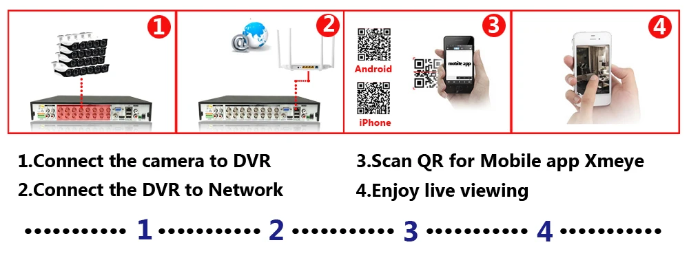 Easy setting , just 4 steps for mobile phone viewing,View live video of the system from anywhere and anytime via you smarphone, table or PC with advanced P2P technology, you are able to remote access your system in minutes or less, no portforwarding needed, remote access has never been so easy!!!