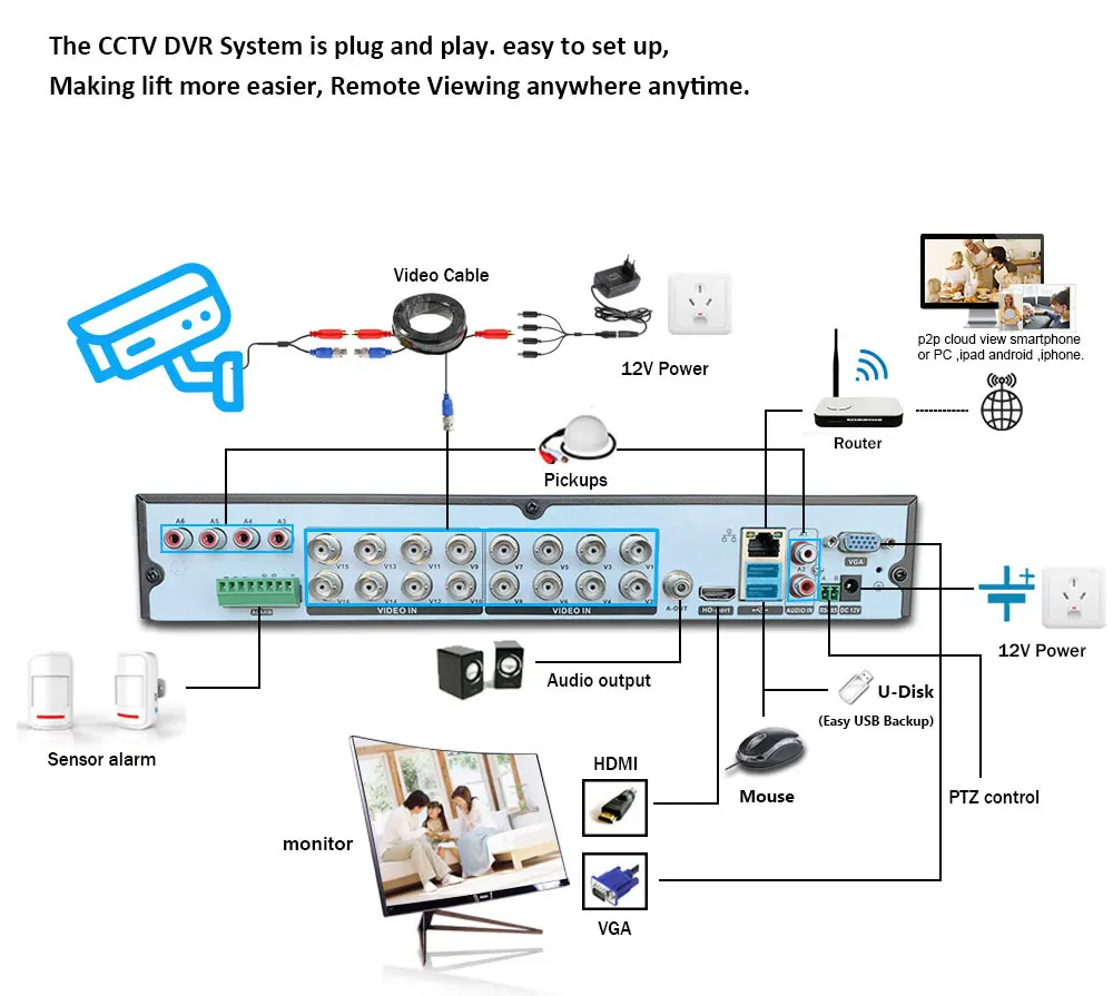The cctv security system is plug and play ,easy to set up,Making lift more easier.Remote viewing anywhere anytime.