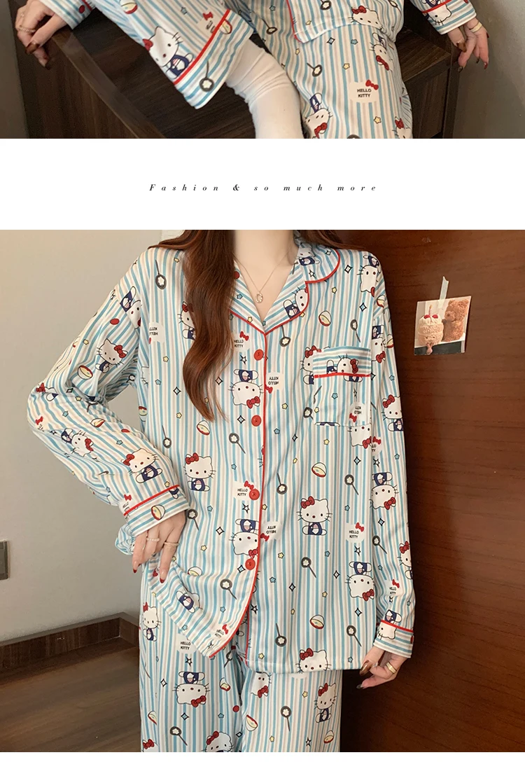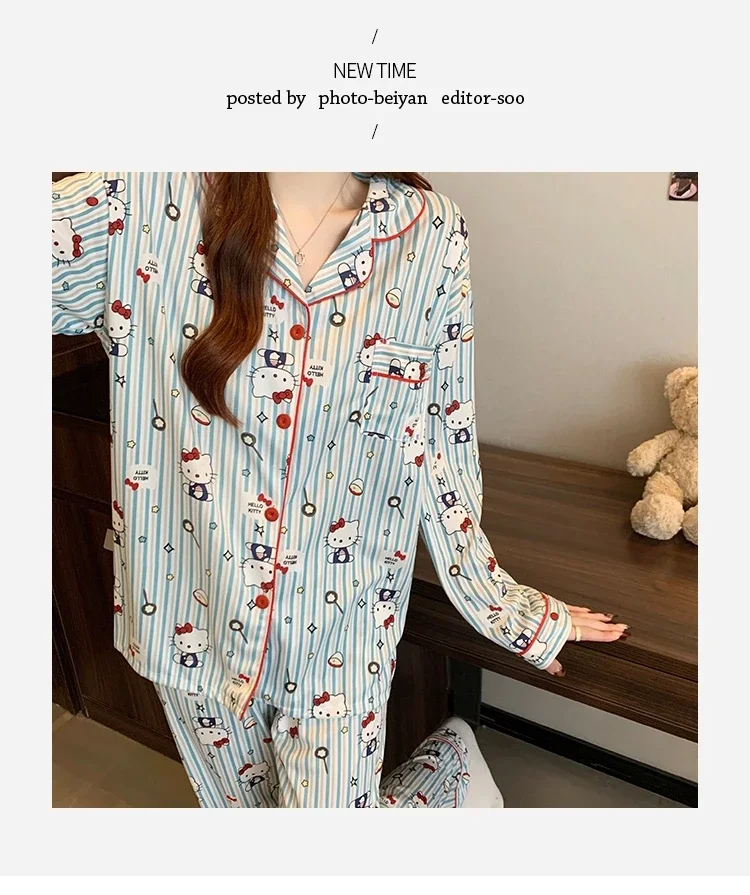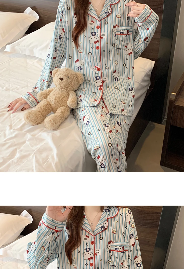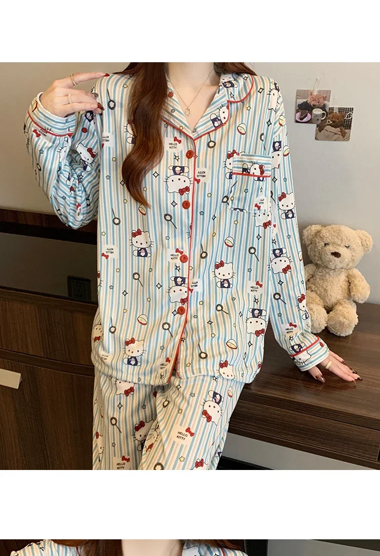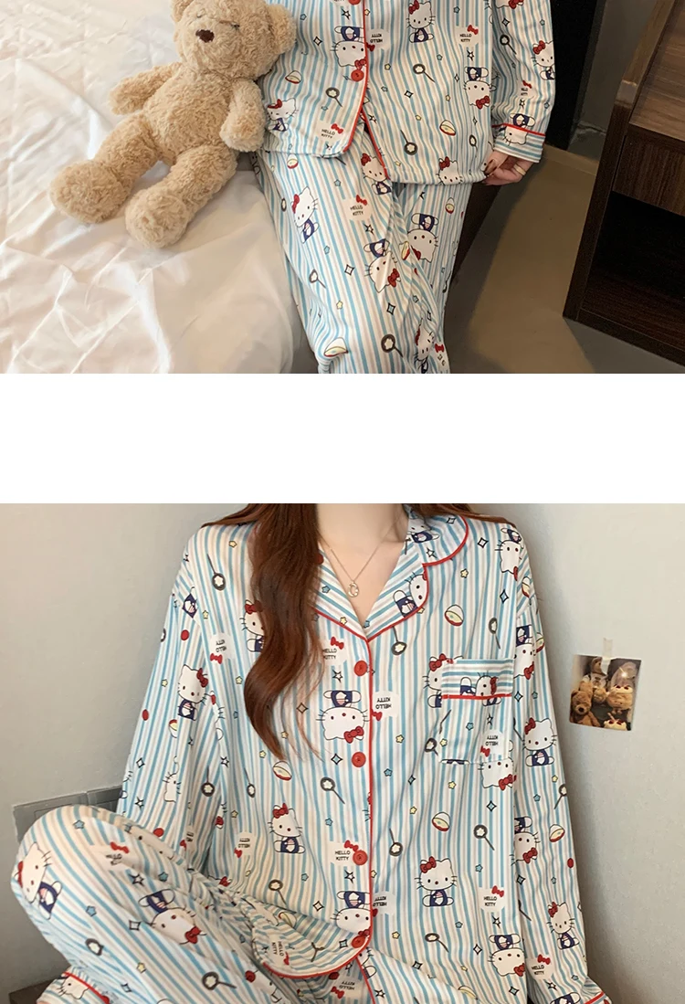 Hello Kitty and Striped Women’s Pajama Set Autumn Winter Long Sleeve Top and Pants Homewear Sweet Y2K Cute Sleepwear 2 Piece Set