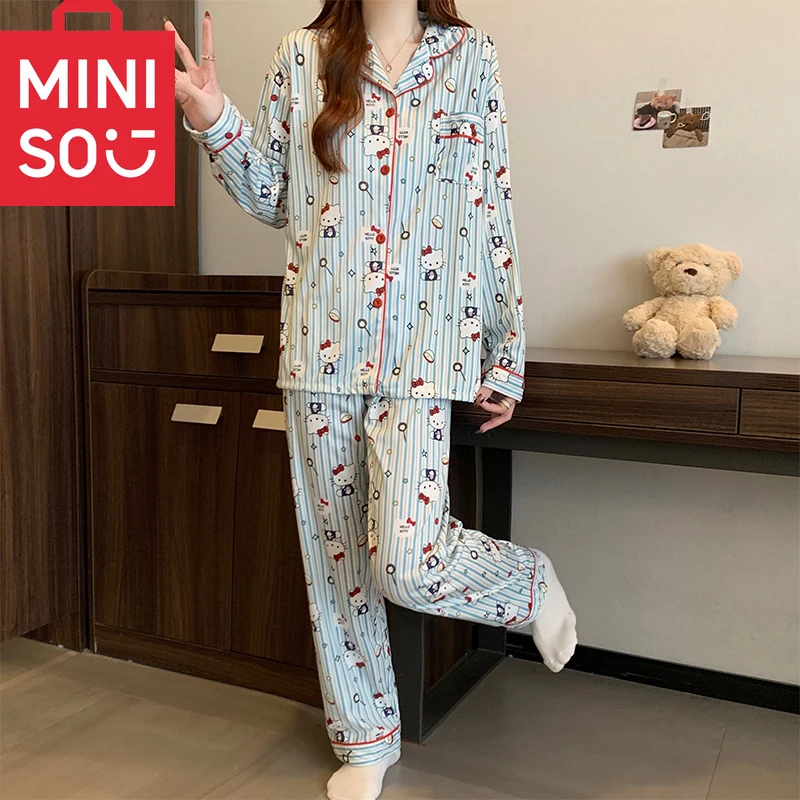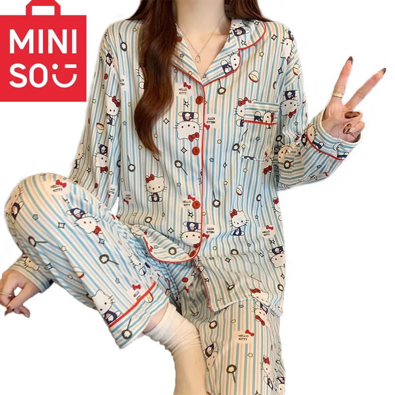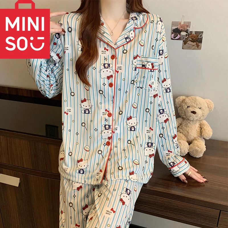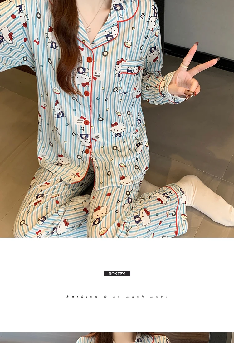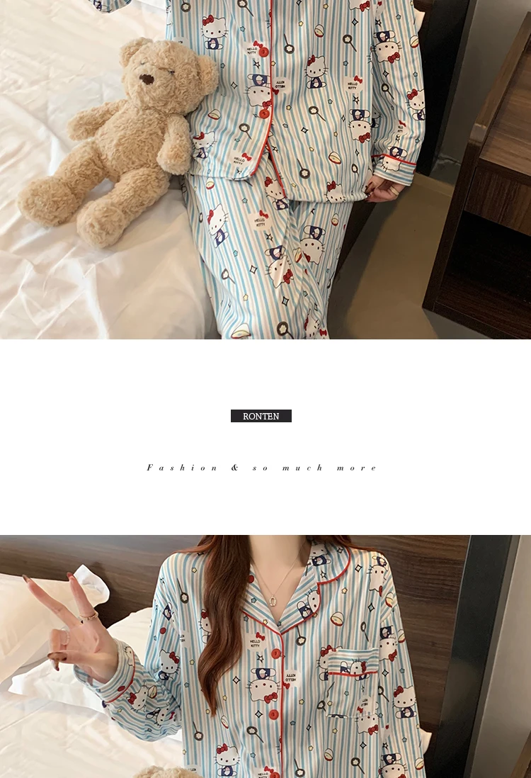 Hello Kitty and Striped Women’s Pajama Set Autumn Winter Long Sleeve Top and Pants Homewear Sweet Y2K Cute Sleepwear 2 Piece Set