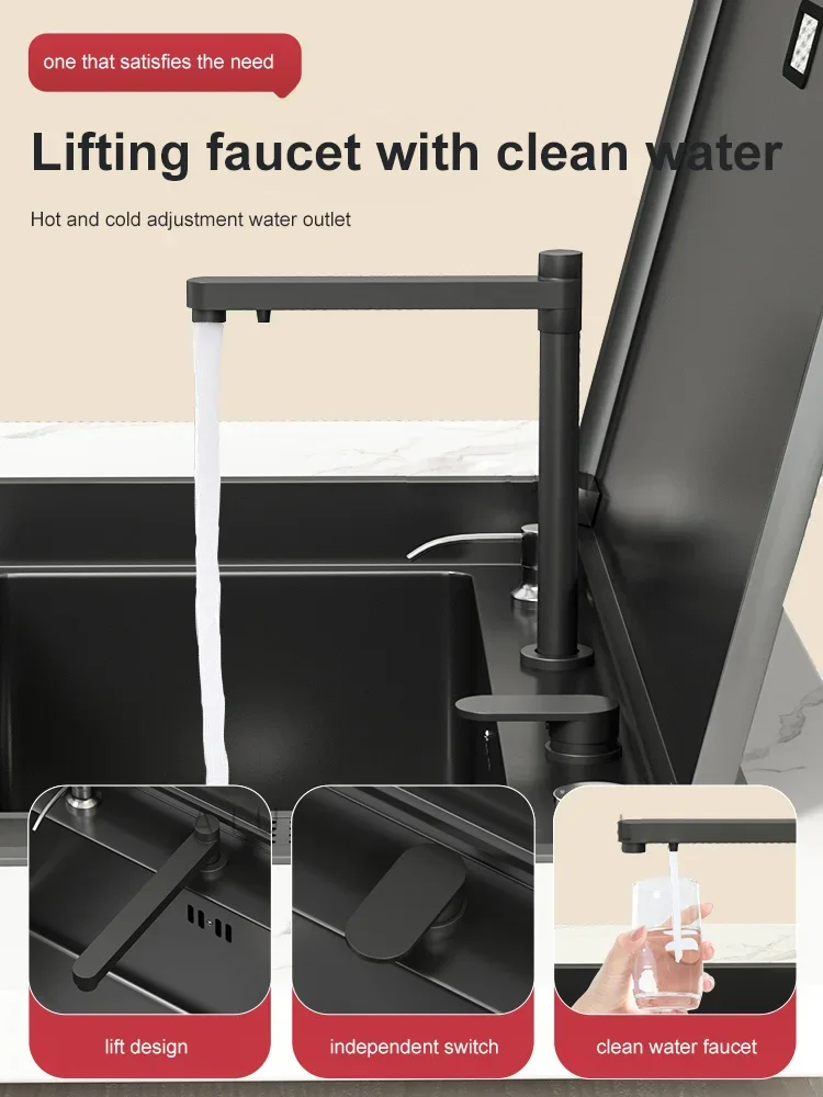 Digital Display Waterfall Kitchen Sink Large Single Slot Nano Stainless Steel Sink Undercounter Honeycomb embossed Washbasin