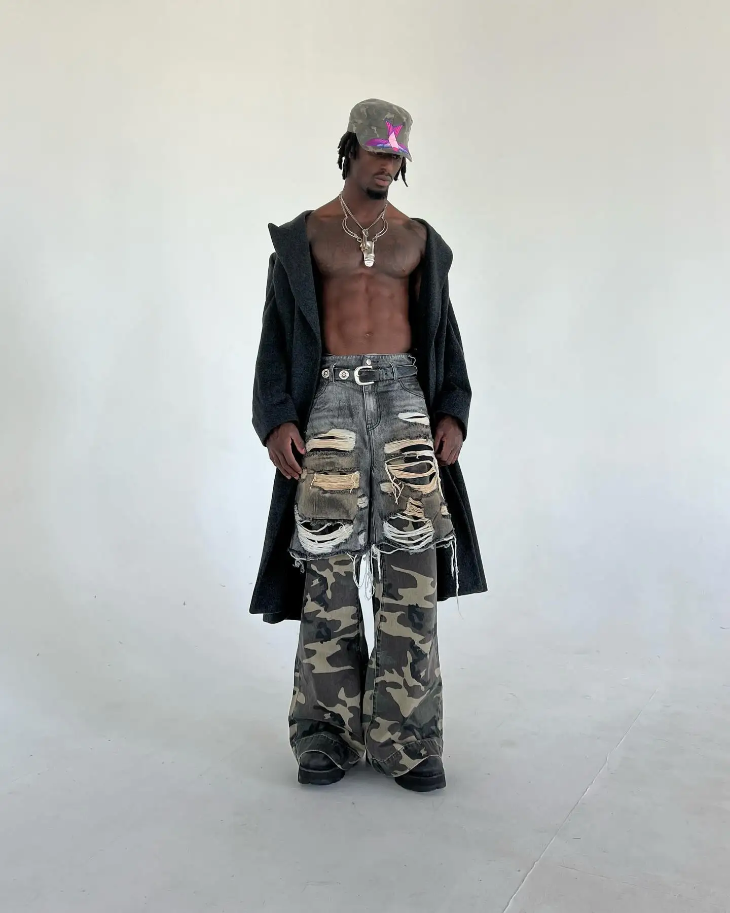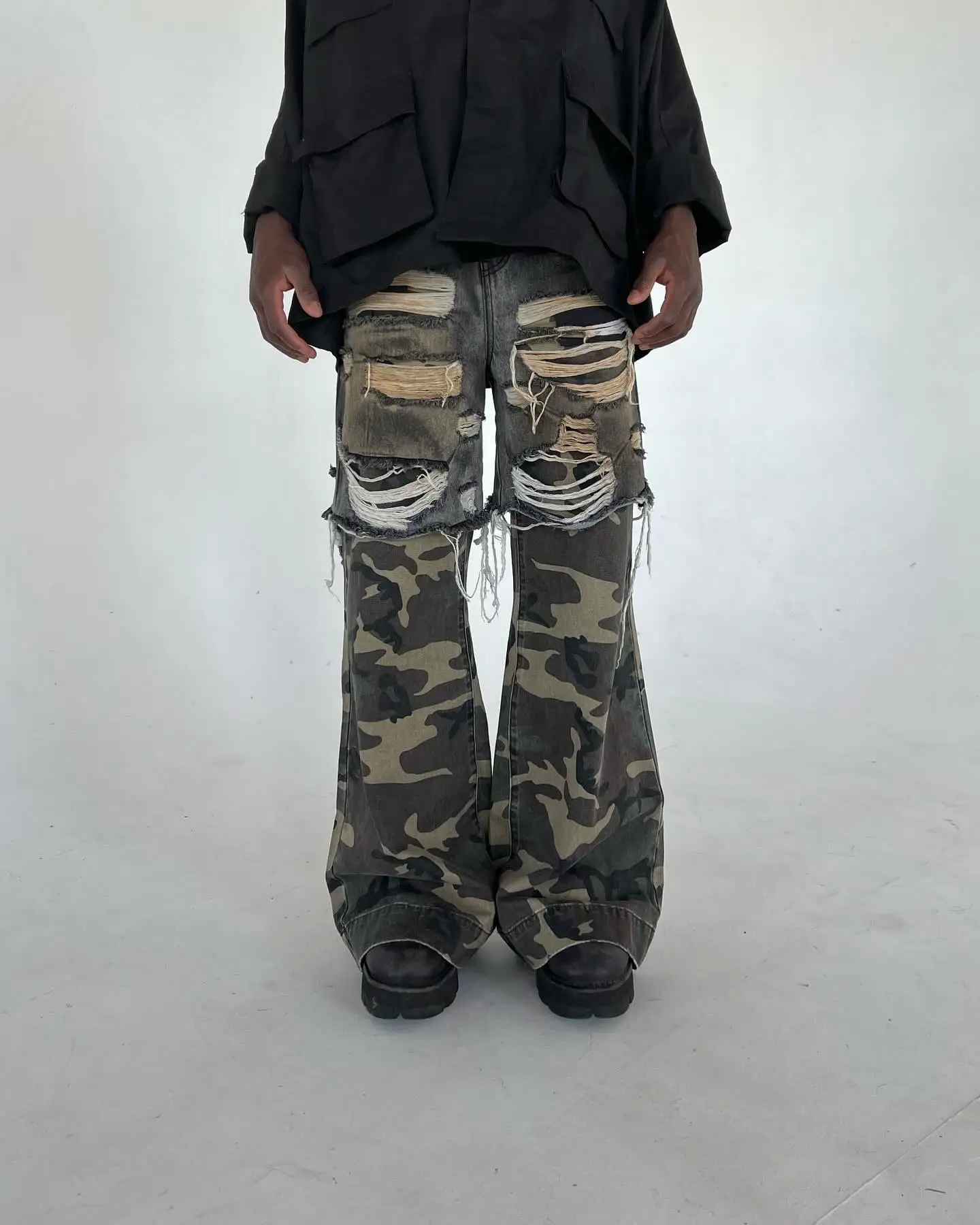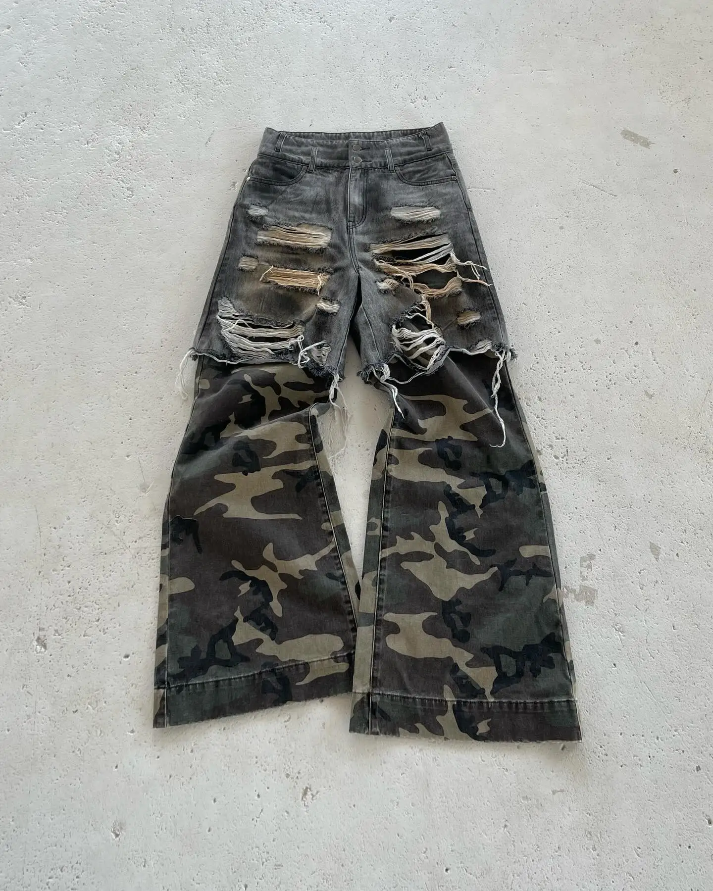 High street retro hip hop camouflage perforated design rock men loose wide leg pants Y2K Harajuku Gothic American trendy jeans