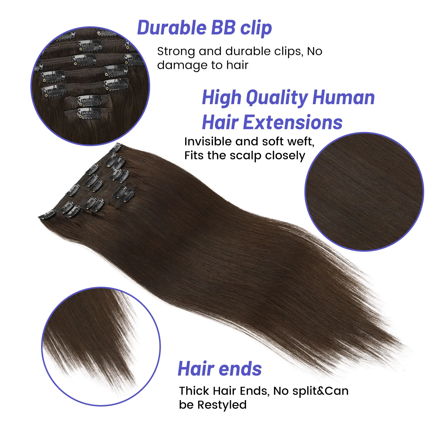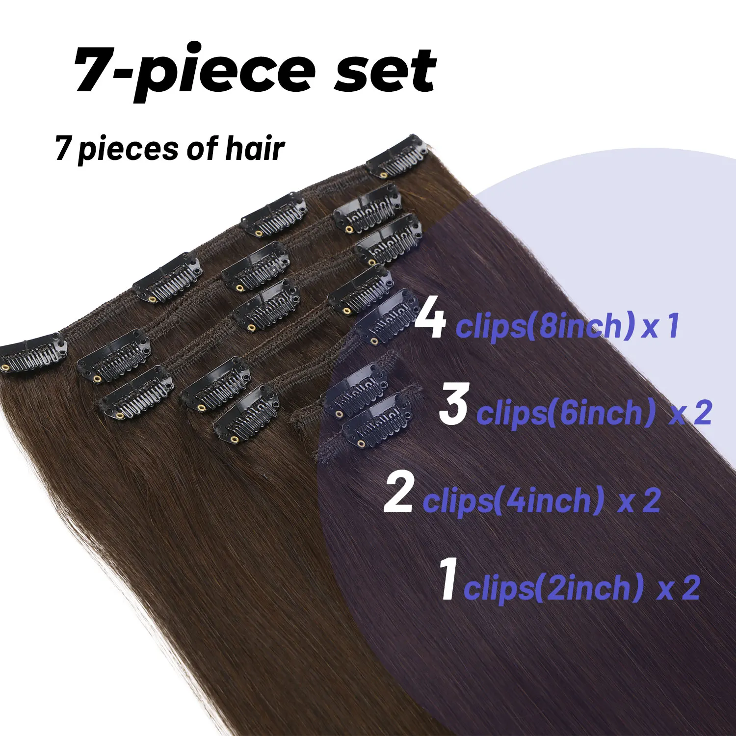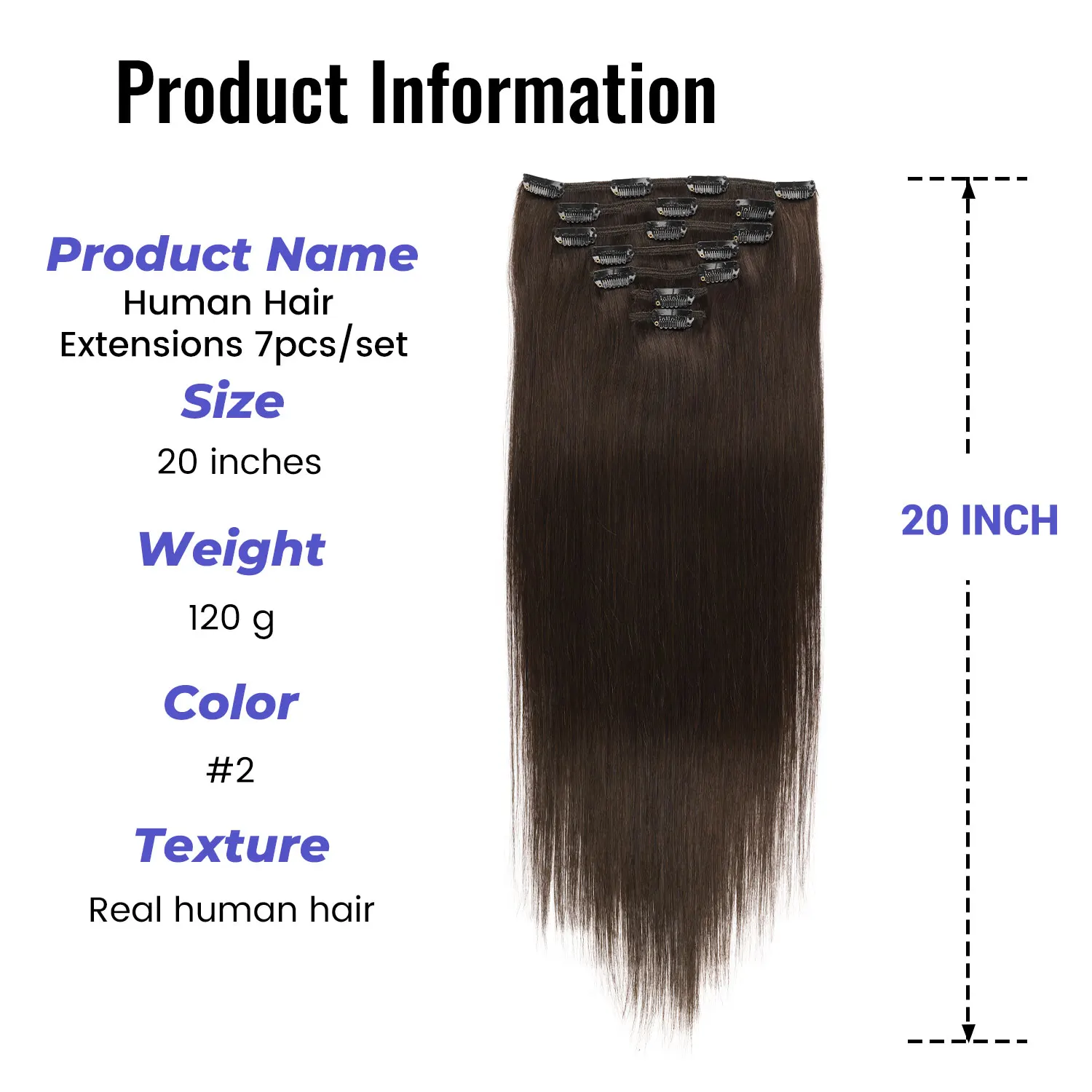 Human Hair Extensions Clip in Remy Hair 7pcs/set 120g Silk Straight Hair 20” 22” 24” Dark Brown Color for Women Girls