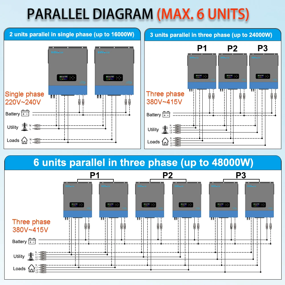 Support parallel 6 units up to 48KW power output, you will get 230V single phase or 380V 3-phase support (more than 3 unit in parallel), increases the inverter power and surge capacity. The package includes 1pcs built-in parallel card and 1pcs parallel cable.