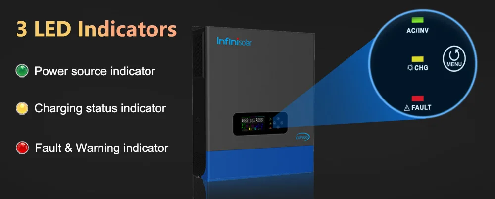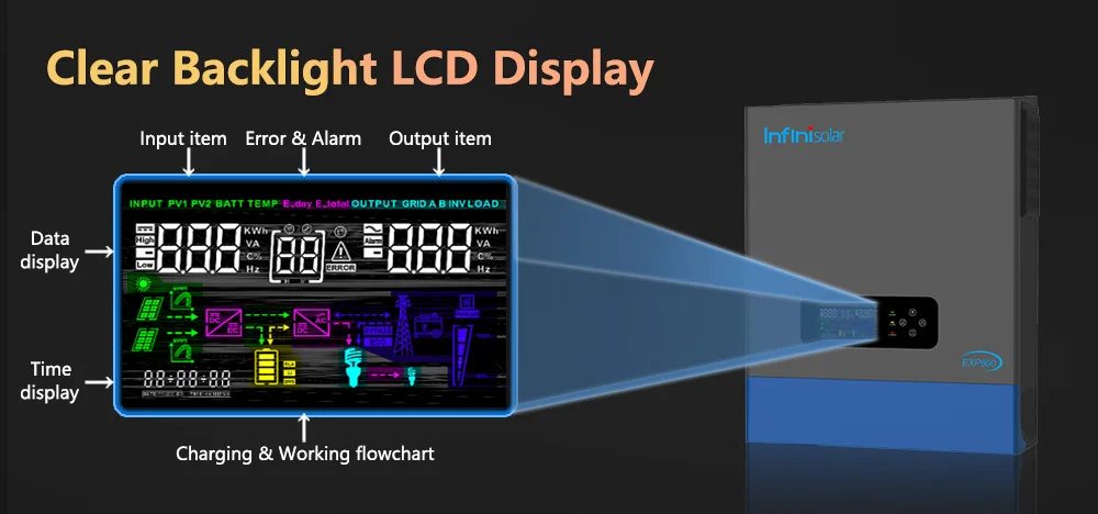 With function buttons and a LCD display, indicating the operating status and input/output power information, allowing you to set parameters like battery charging current, working modes etc.