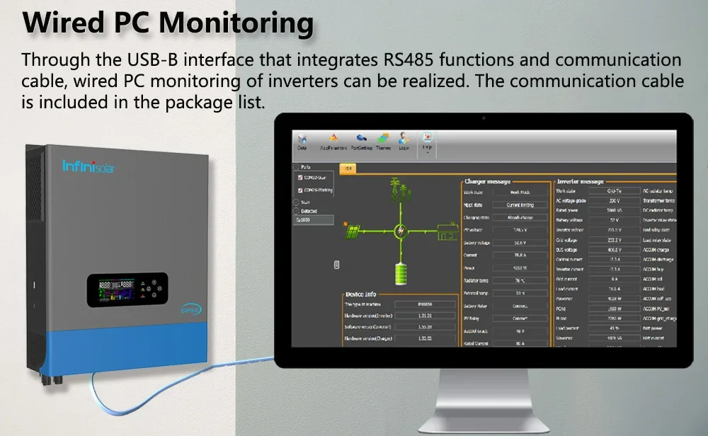 Through the USB-B interface that integrates RS485 functions and communication cable, wired PC monitoring of inverters can be realized. The communication cable is included in the package list. (Note: PC monitoring and Wi-Fi monitoring cannot be enabled at the same time.)