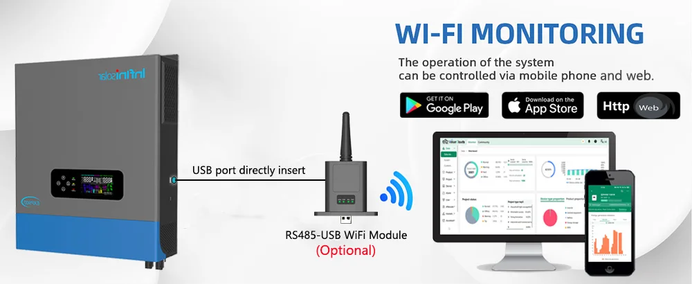 Unlike other inverters on the market, we use the USB-A interface that integrated RS485 communication function. This unique configuration enables seamless connection to an external Wi-Fi module, providing independent remote monitoring capabilities. Users can effortlessly access real-time device status or adjust parameters anytime & anywhere through a mobile app or PC web. (Note: The WiFi module is optional.)