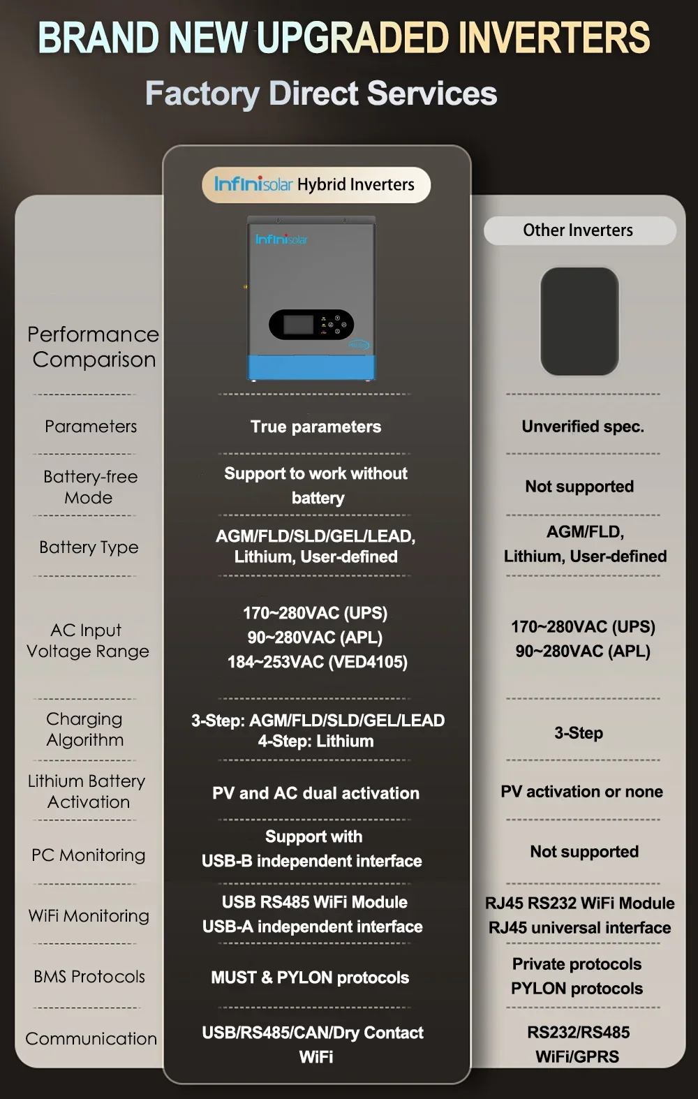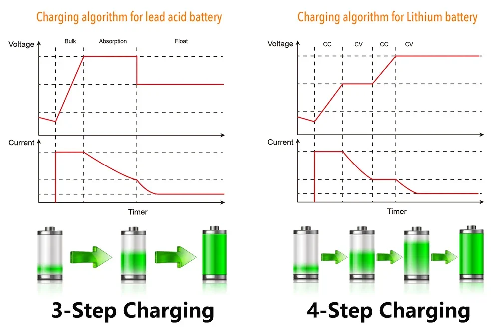 Compared to other inverters, we have adopted 3-step charging algorithm for lead-acid battery, 4-step charging algorithm for Lithium battery, unlocks 30% longer battery life with precision parameter tuning.