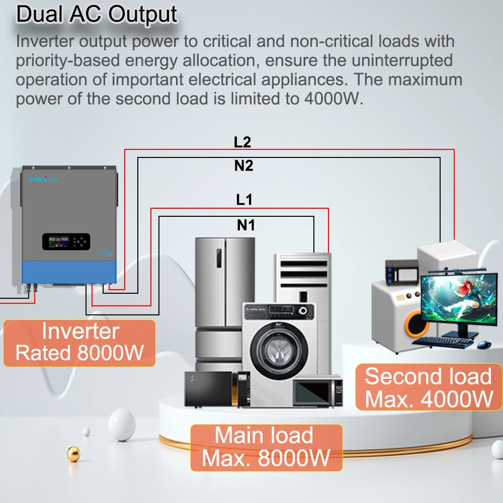 Inverter output power to critical and non-critical loads with priority-based energy allocation, ensure the uninterrupted operation of important electrical appliances. The maximum power of the second load is limited to 4000W.