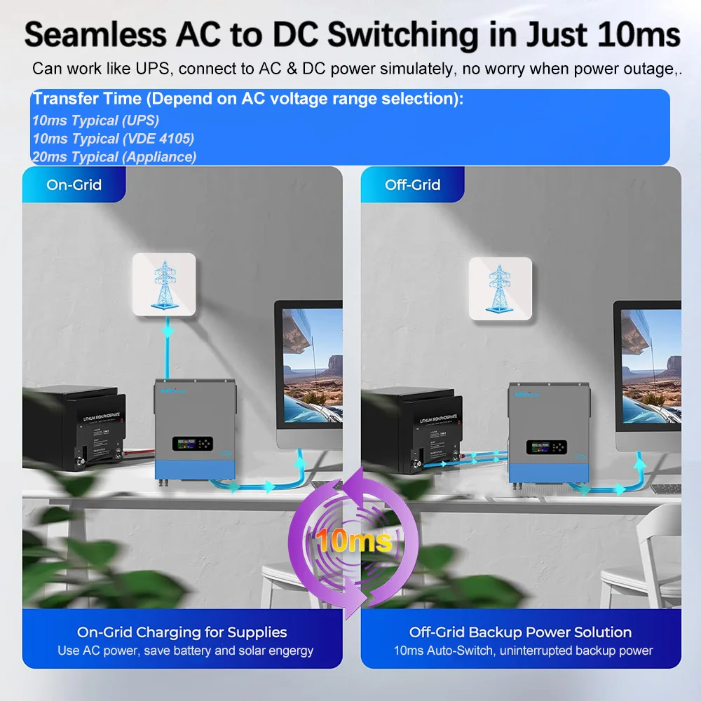Can work like UPS, 10ms/20ms AC & DC auto-switching ensures uninterrupted power for critical loads during grid transitions.