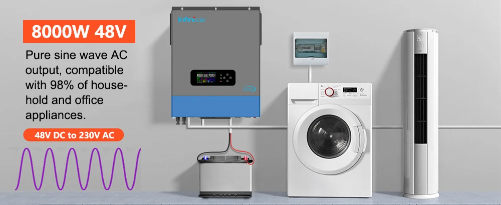 8KW rated power, dual AC 230V pure sine wave output, suitable for 98% of household and office appliances such as refrigerators, lamps, televisions, fans, air conditioning, and other AC loads.