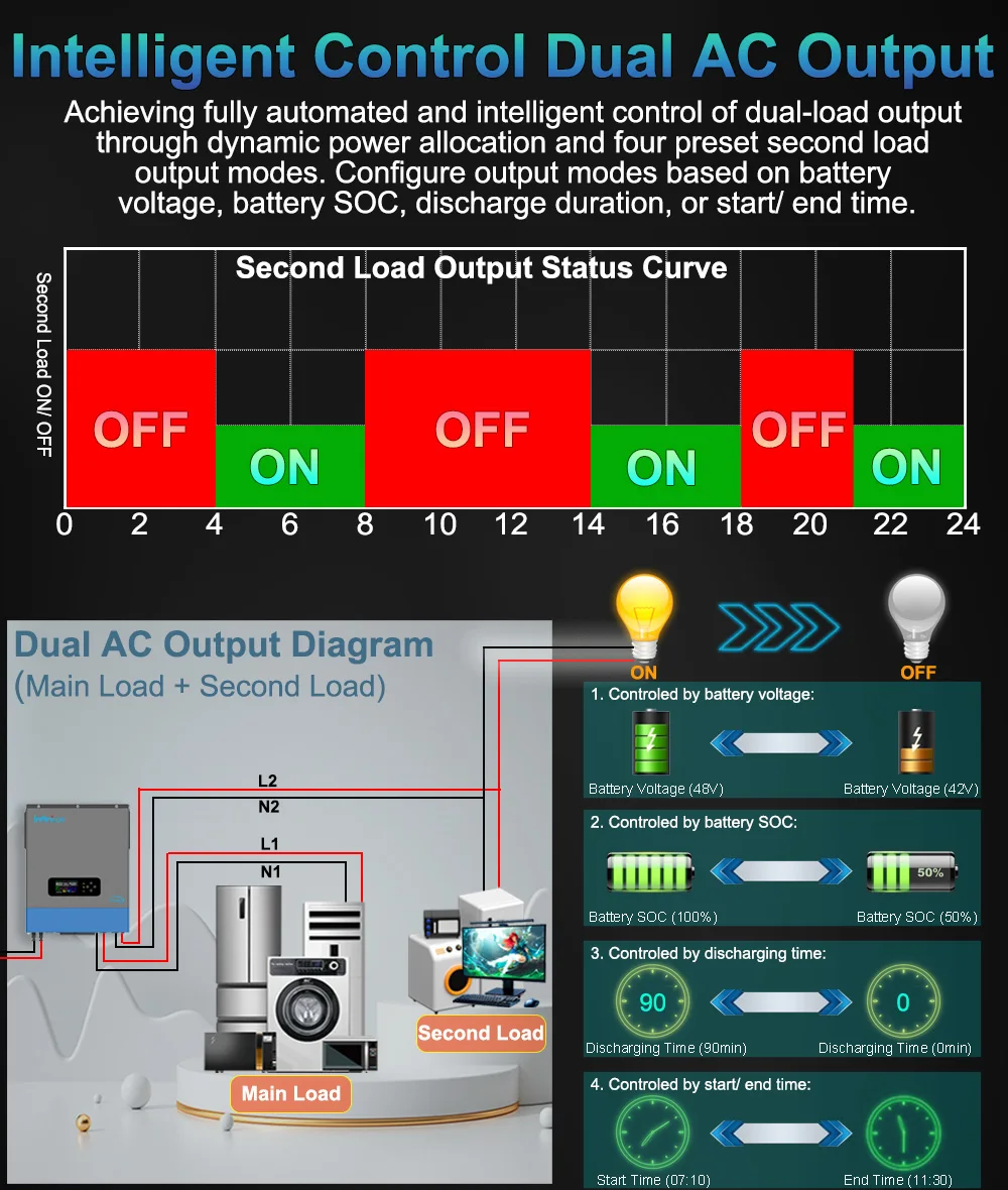 Achieving fully automated and intelligent control of dual-load output through dynamic power allocation and four preset second load output modes. Configure output modes based on battery voltage, battery SOC, discharge duration, or start/ end time.