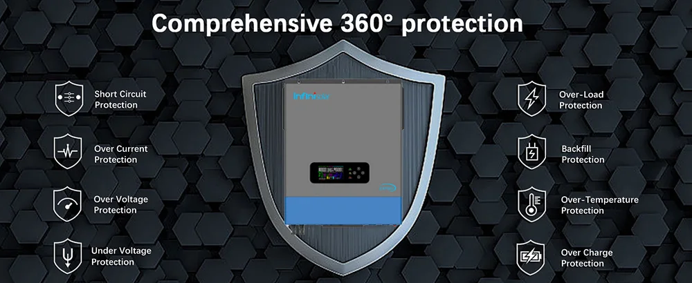 The hybrid solar inverter offers 360° comprehensive protection with various features, such as short circuit protection, over-voltage and under-voltage protection, overload protection, and reverse polarity protection. These safety measures significantly enhance the security of your electrical circuits and usage.