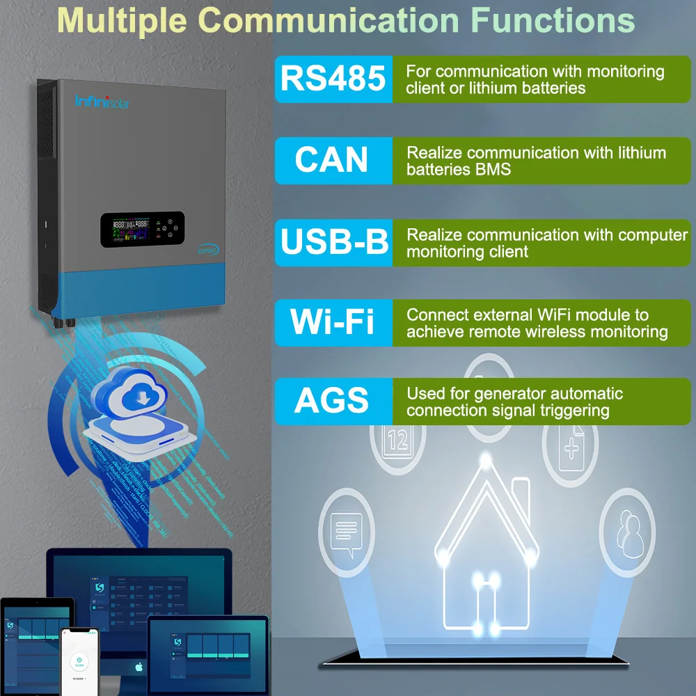 Through the built-in communication protocol and multiple independent communication interfaces (RS485, CAN, USB, WiFi, AGS), seamless communication between the inverter and external monitoring devices, generators and lithium batteries can be easily achieved.