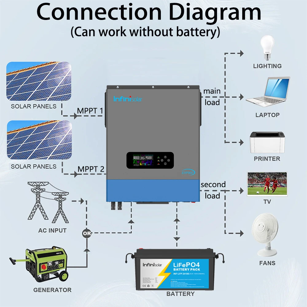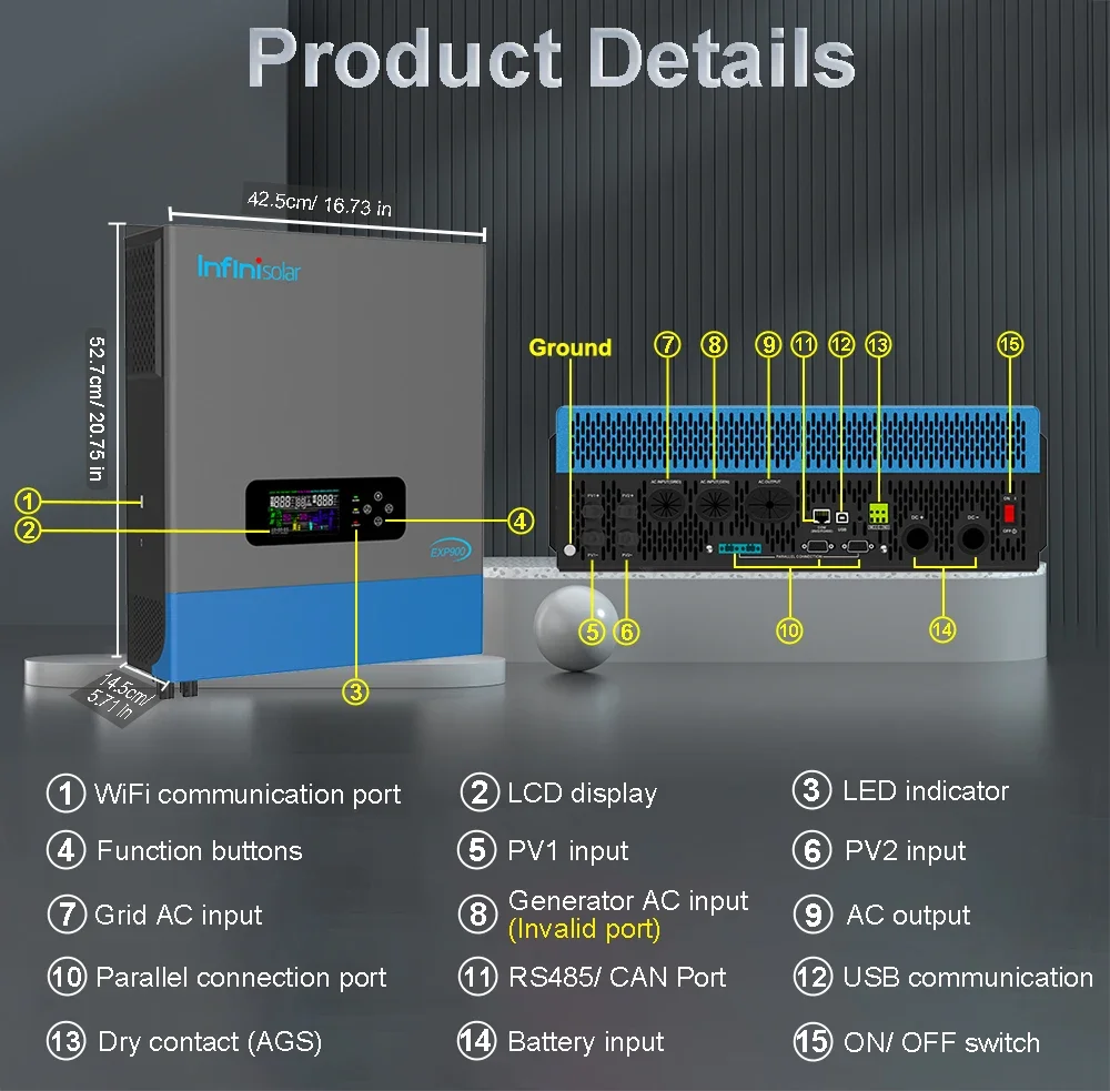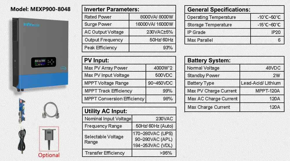 Infinisolar MEXP900-8048 inverter is a 8KW 48V to 220V/230V/240V single phase off-grid all-in-one solar Inverter, with built-in 120A MPPT charger and 120A AC charger. Combining solar, AC utility/ generator, and battery to offer uninterruptible power supply.