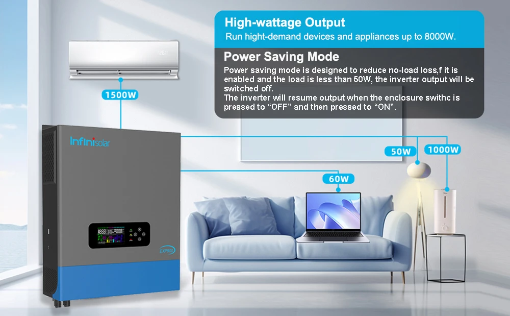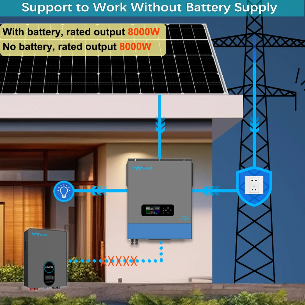 Battery-less operation enables direct solar-to-load power conversion, harnessing solar energy for immediate appliance operation. And in this scenario, the rated output power is up to 8000W, which is the same as inverter full rated power.