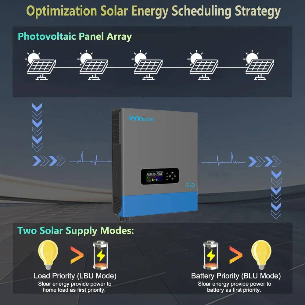 Featuring two solar supply modes: load priority and battery priority. Load priority mode can directly use solar energy to power home appliances for optimal self-consumption. Battery priority mode will charge battery first for reliable backup energy. Let you align solar flow with your specific energy requirement.