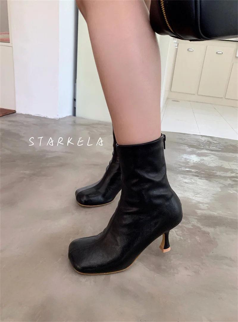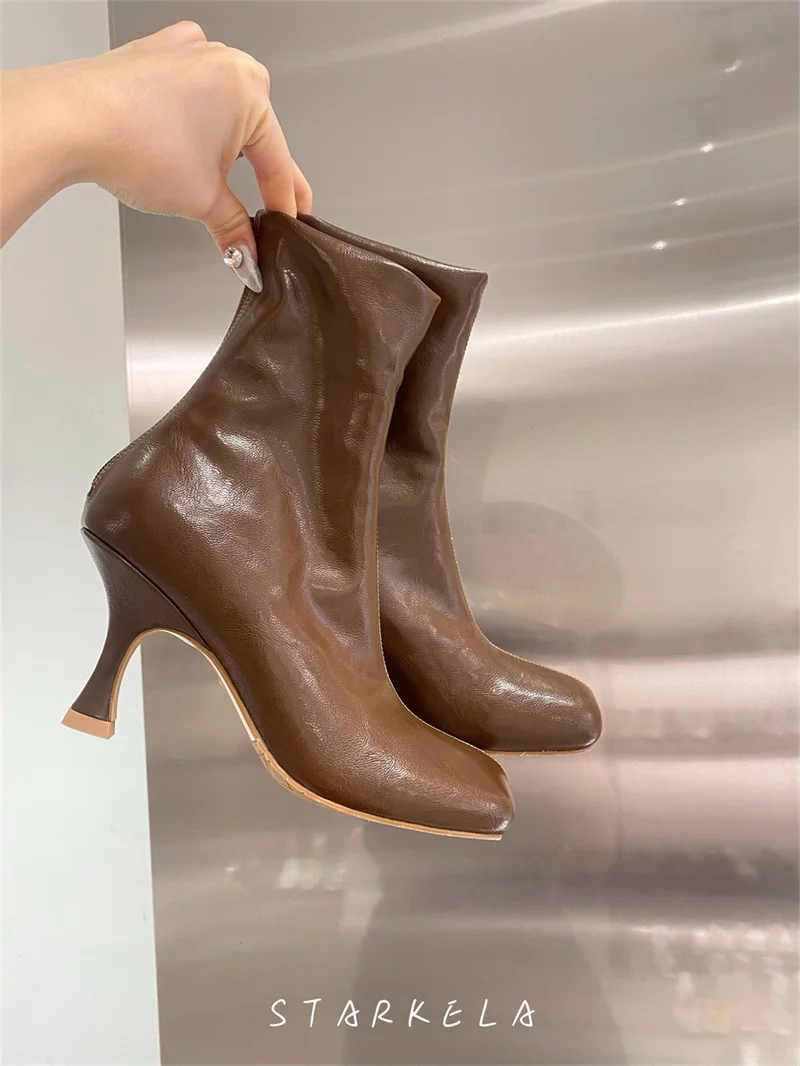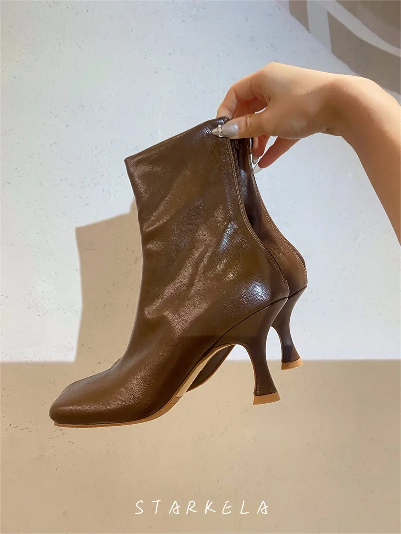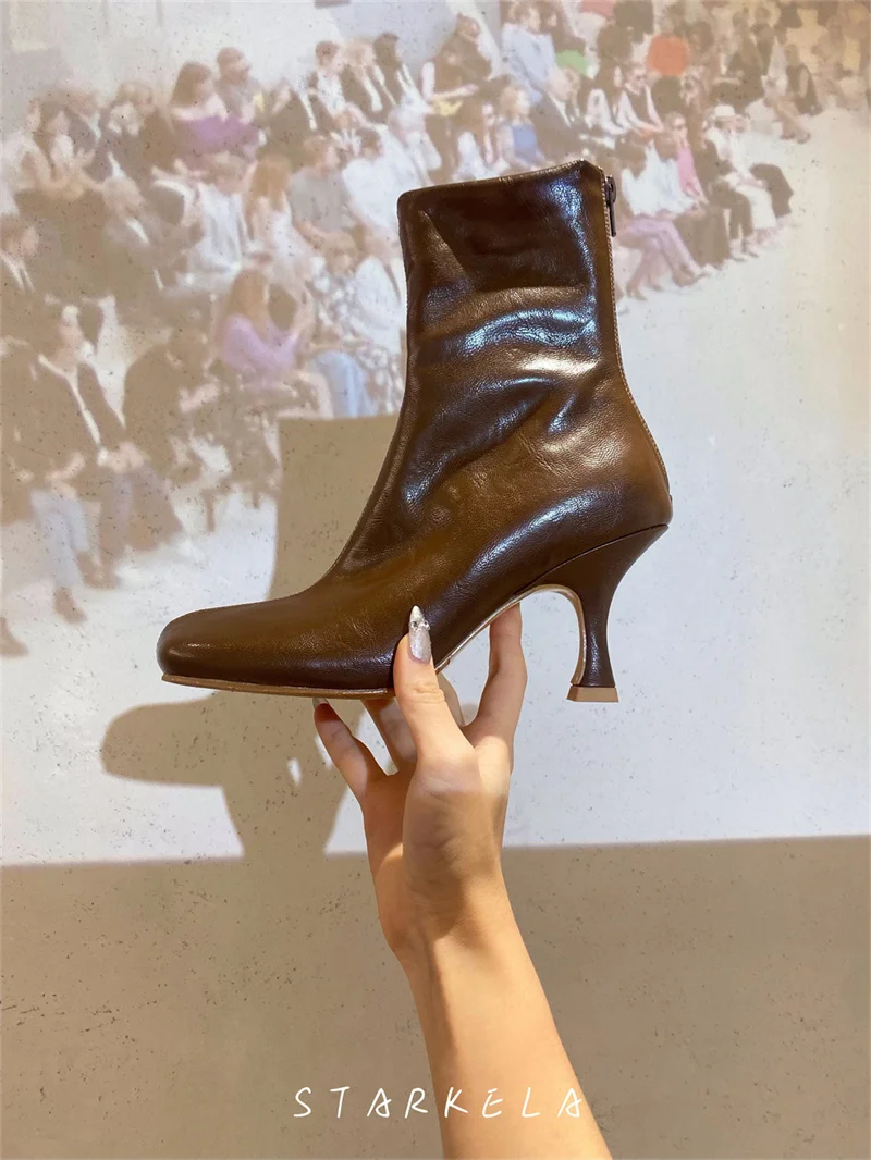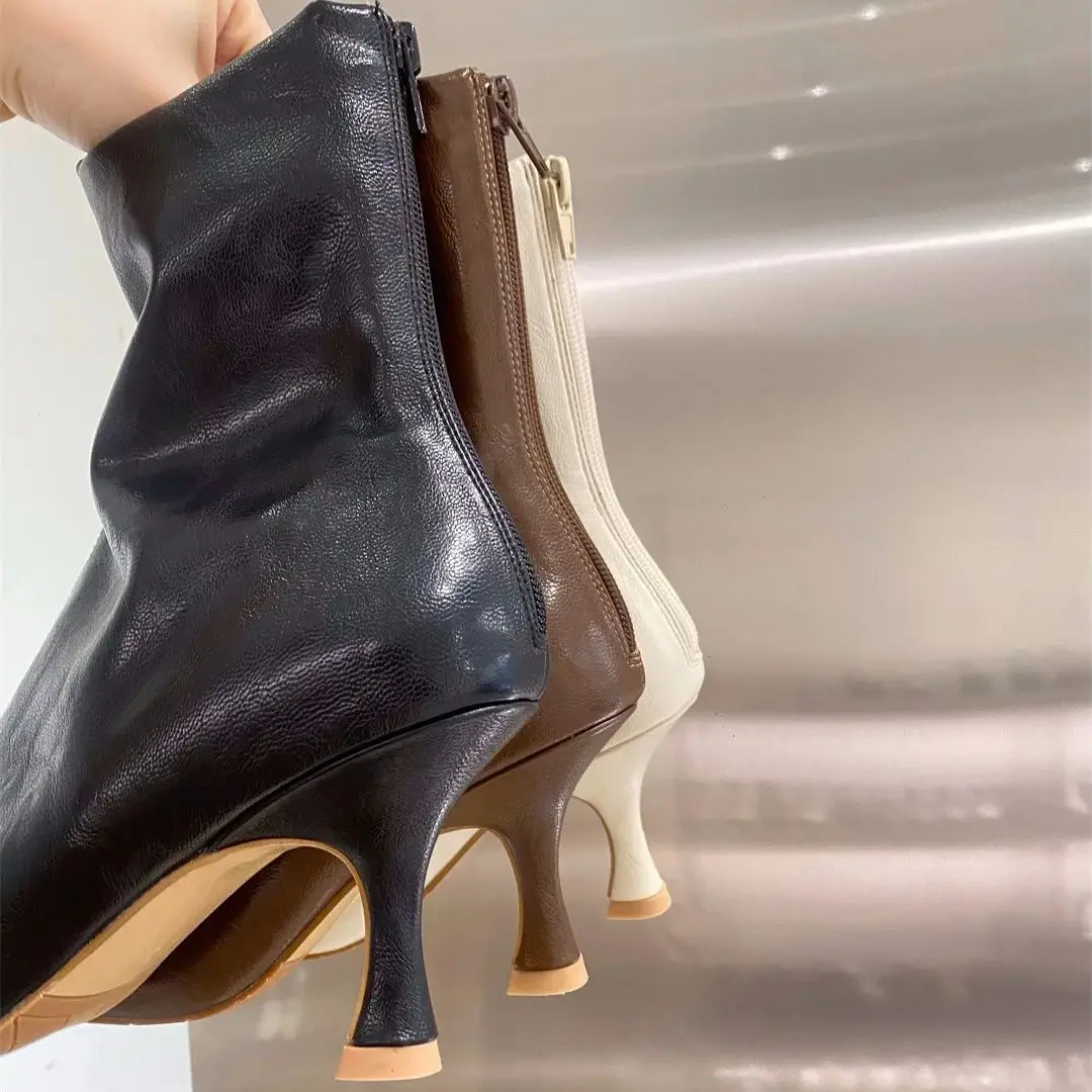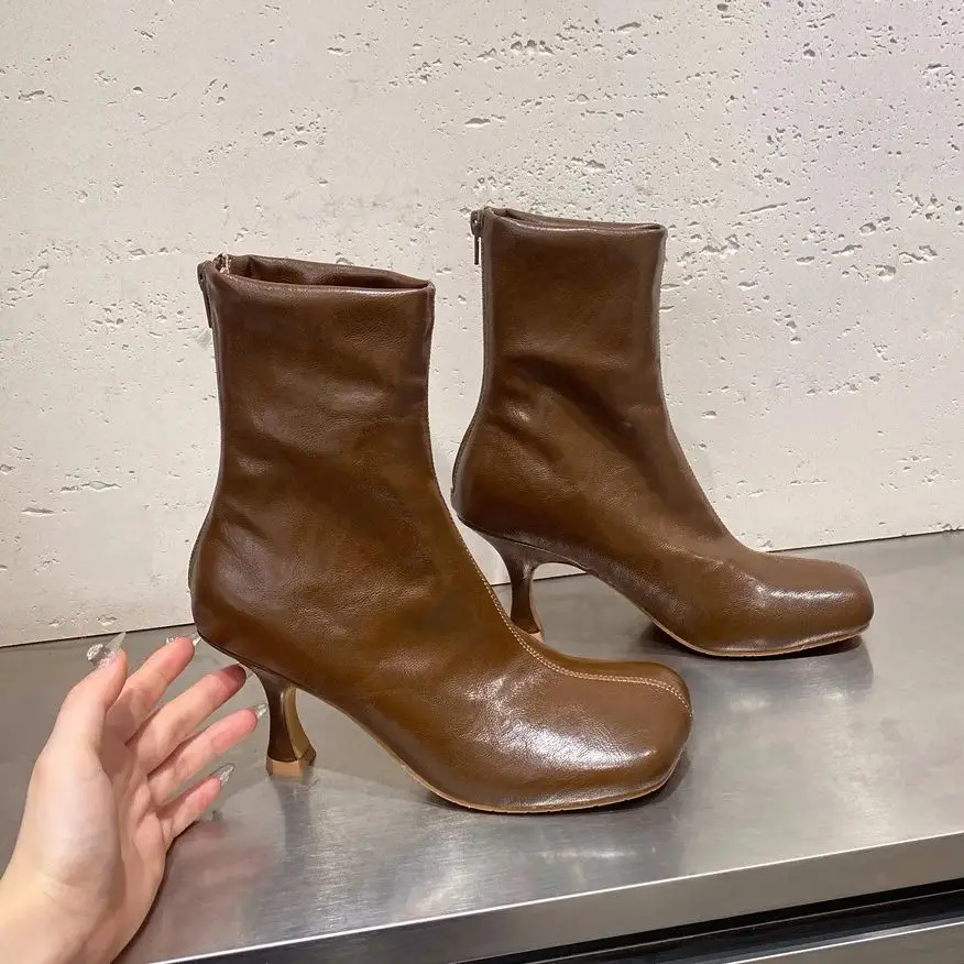 IPPEUM Ankle Boots For Women Square Toe Thin Heels Zip PU Leather Black Brown Botines Dress Shoes