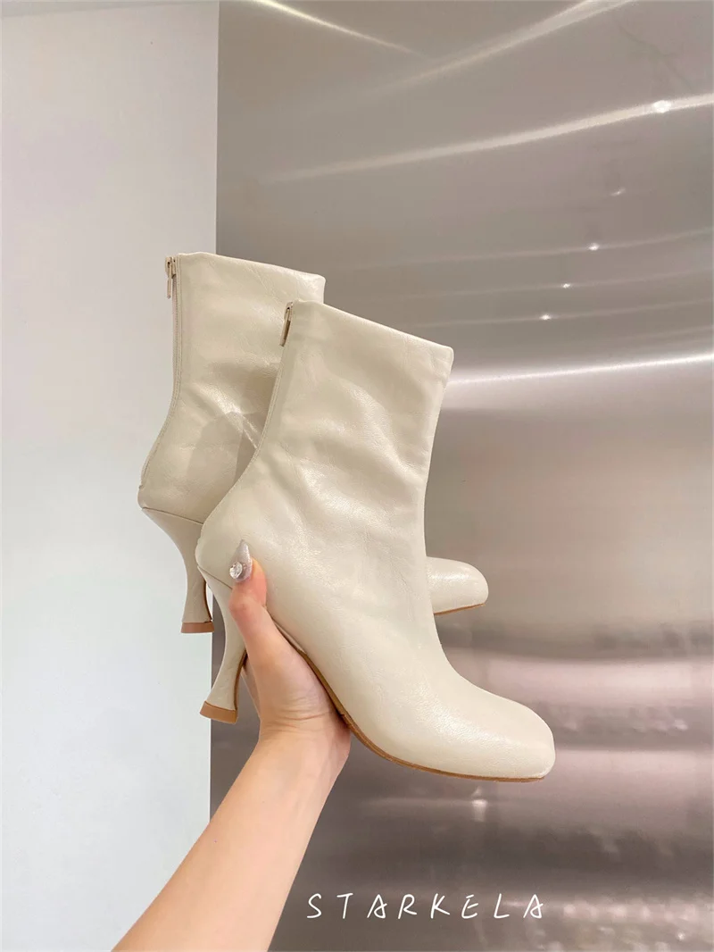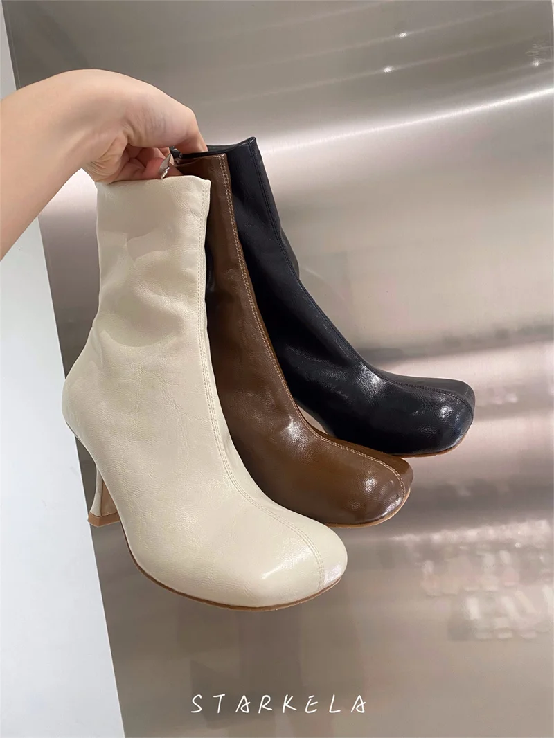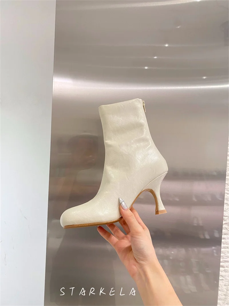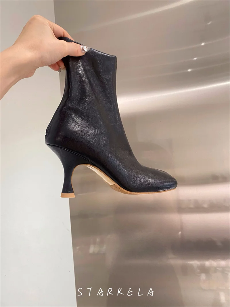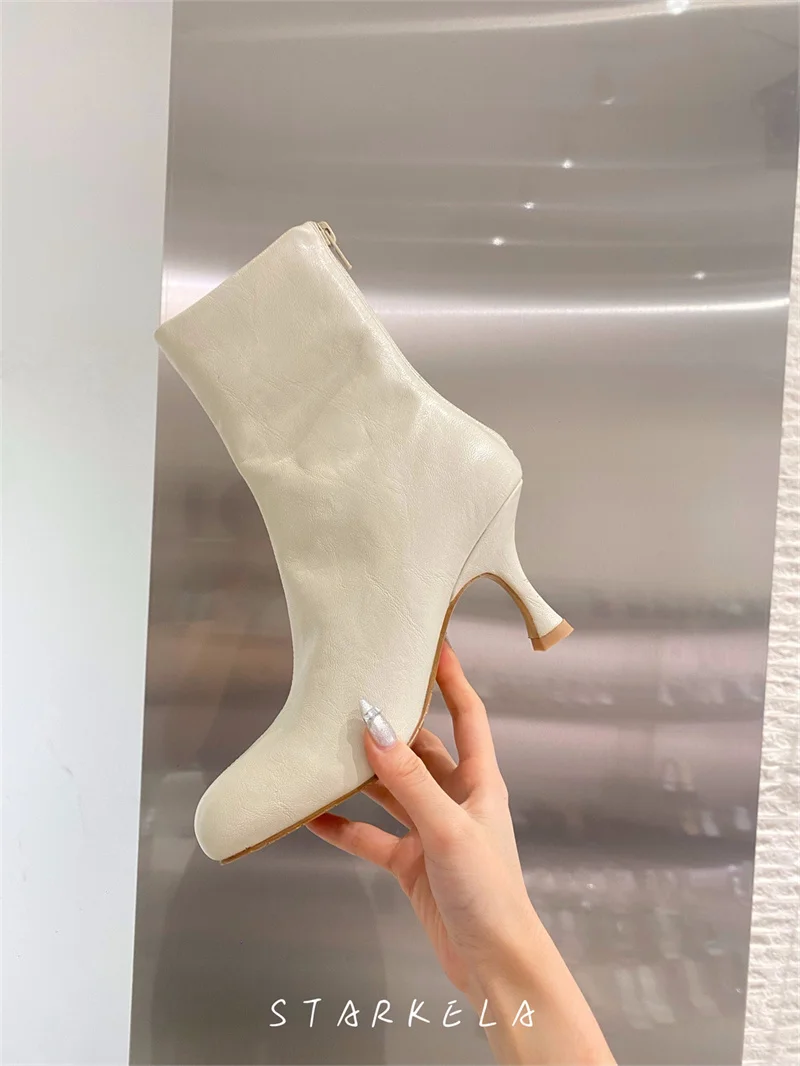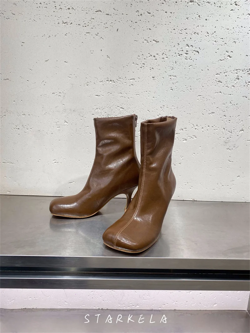 IPPEUM Ankle Boots For Women Square Toe Thin Heels Zip PU Leather Black Brown Botines Dress Shoes