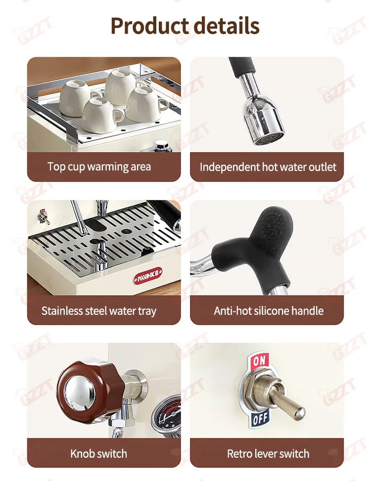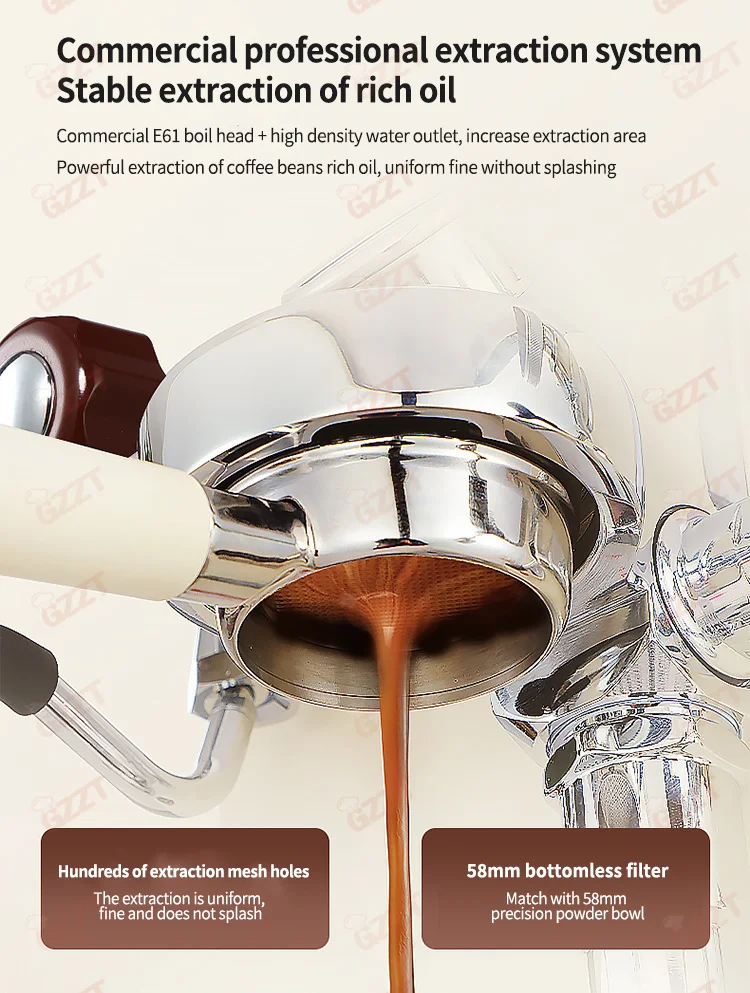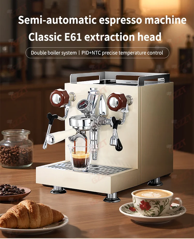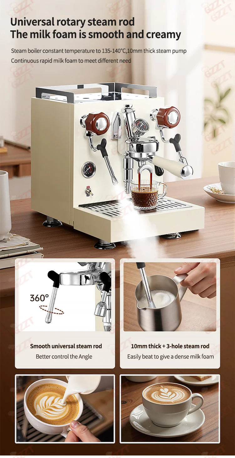 *Automatic pre-soaking *Dual boiler system (2.5-liter steam boiler + 0.5-liter coffee boiler) *E61 Classic Brewing Head *Italian ulka water pump *GICAR flowmeter *PID+NTC precise temperature control *10mm steam pipe *The entire body is made of sheet metal *Dual visual pressure gauge
