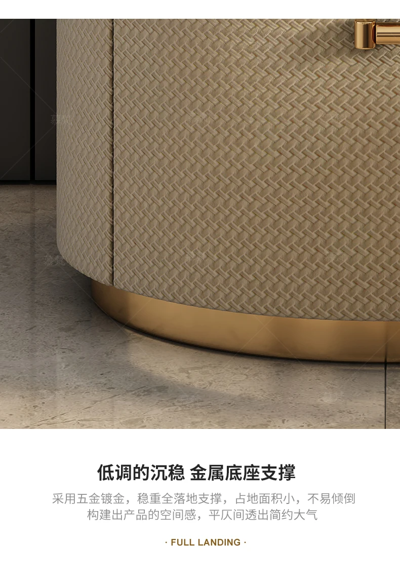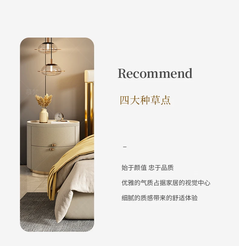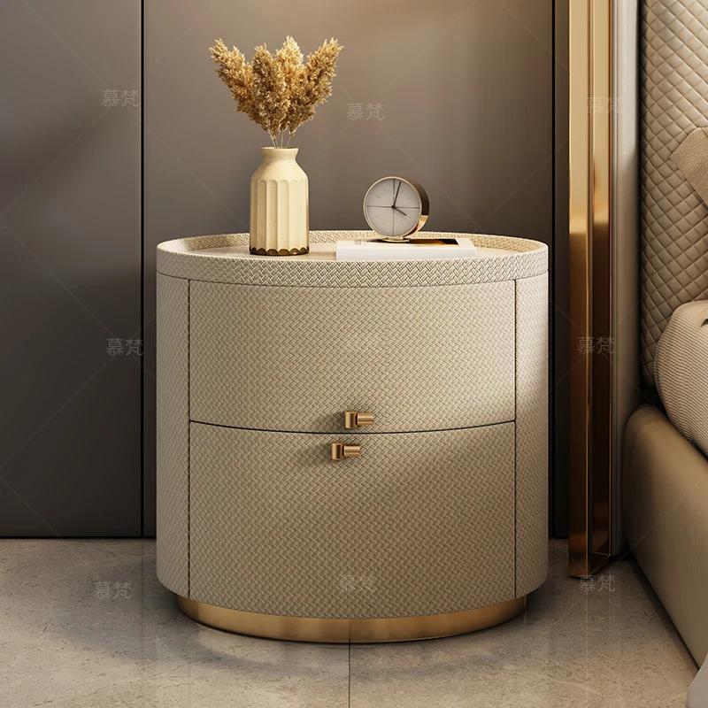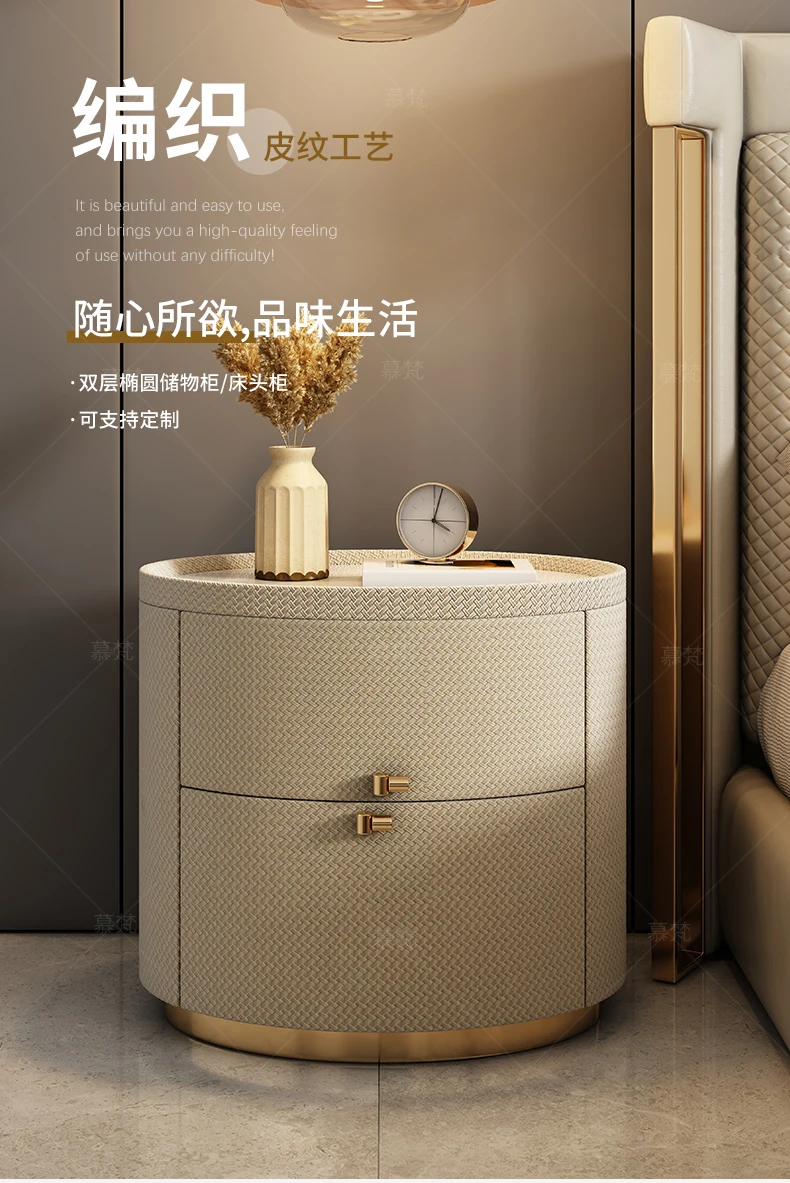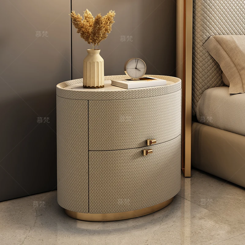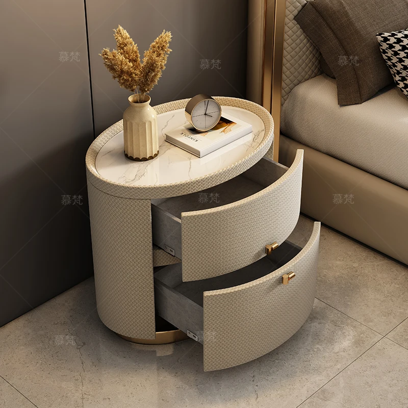 Italian minimalist designer bedside table light luxury rock slab Fendi bedroom high-end oval leather art Internet celebrity beds