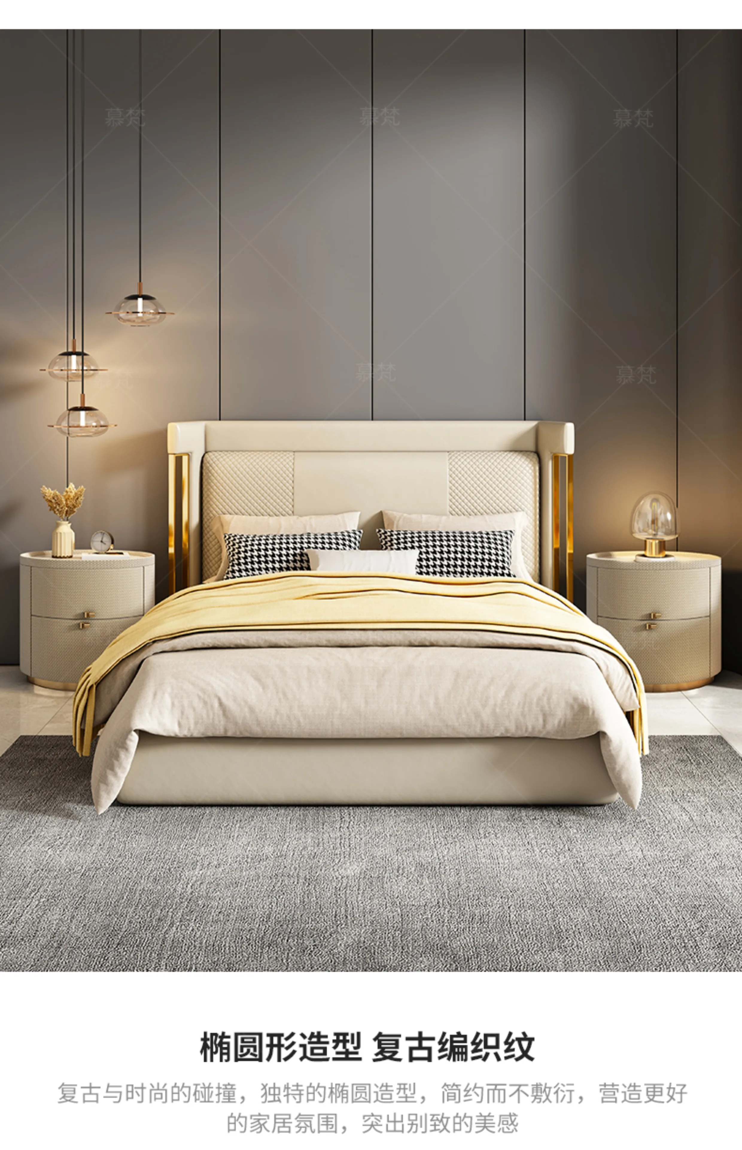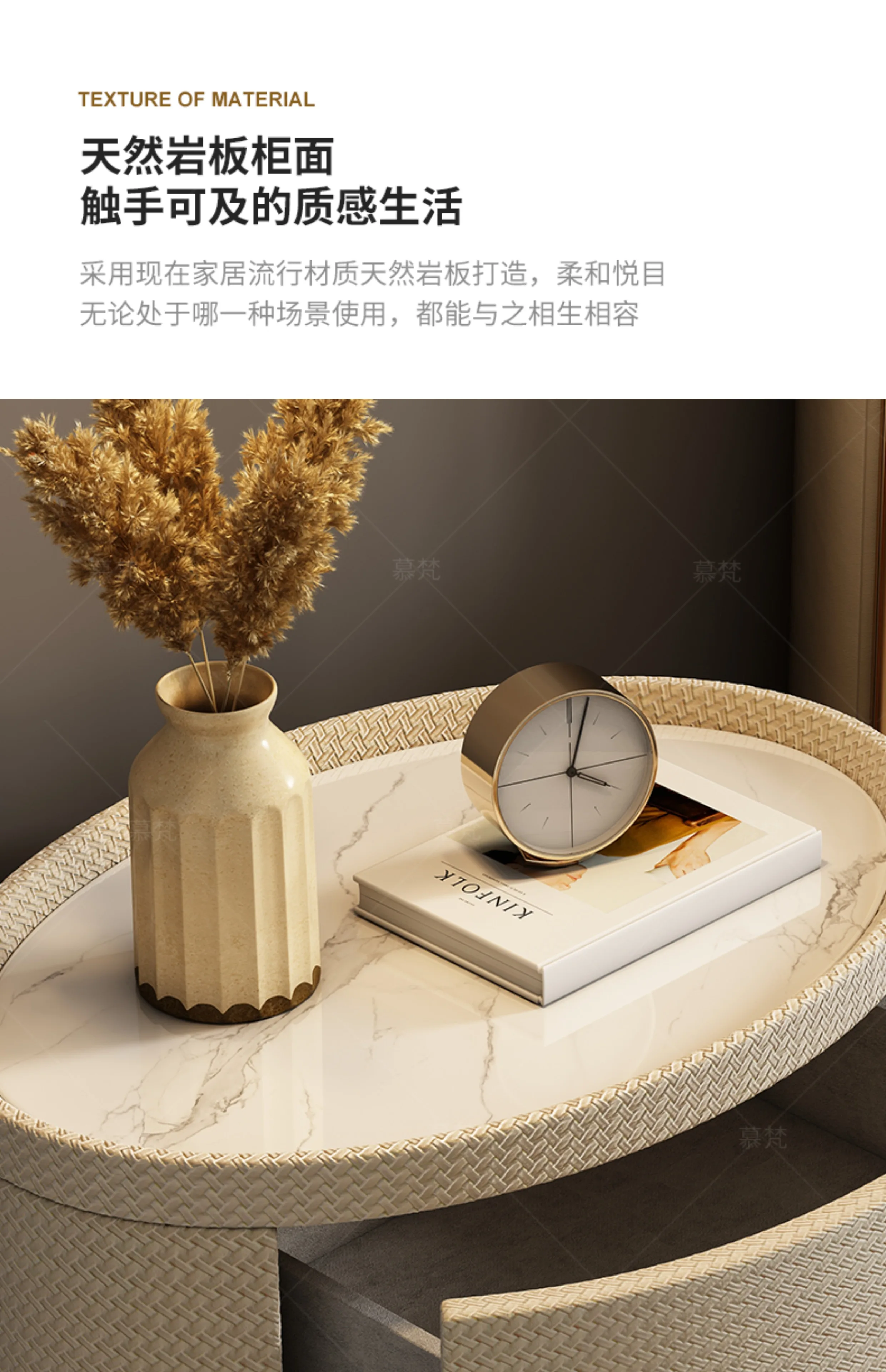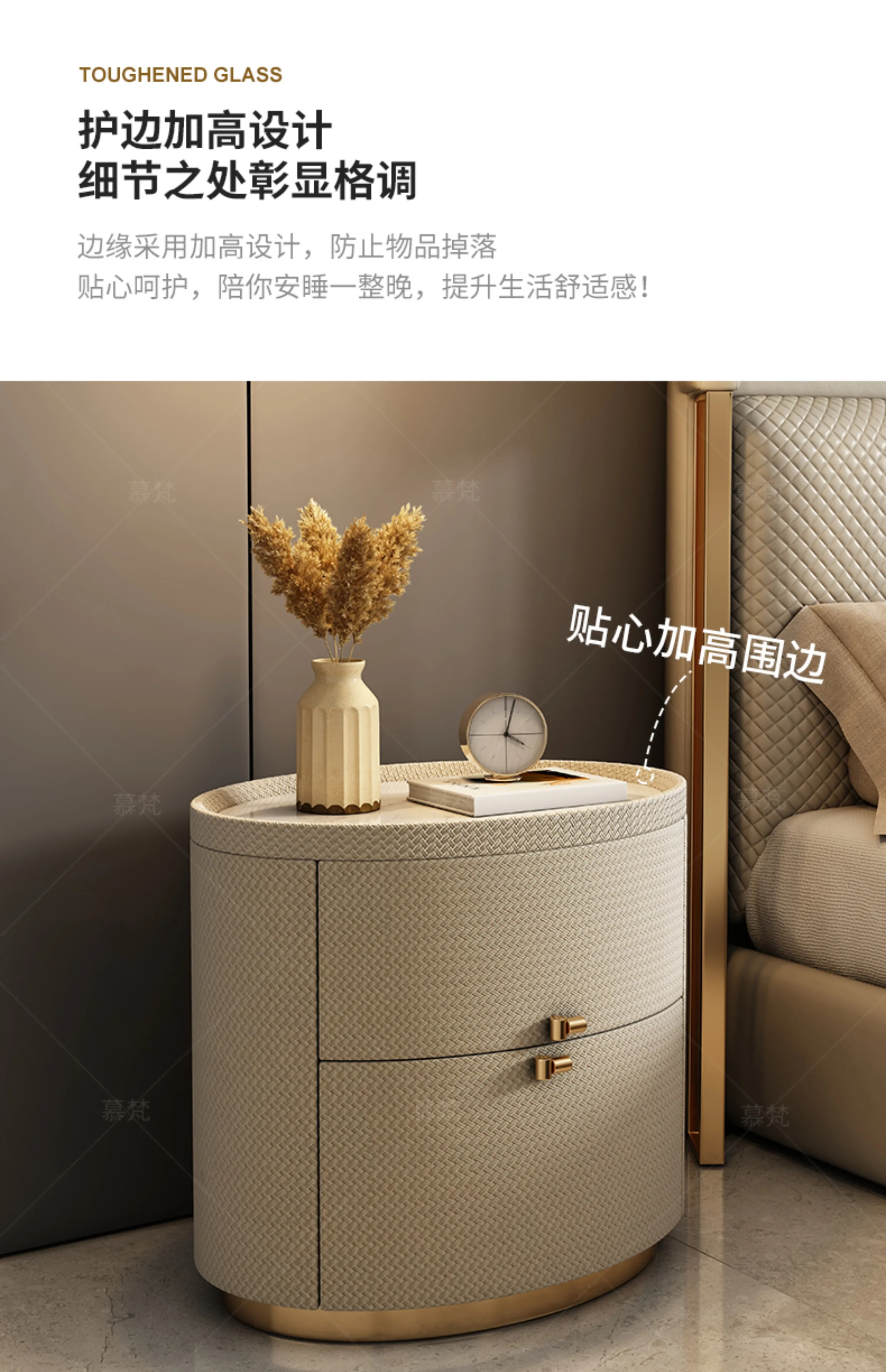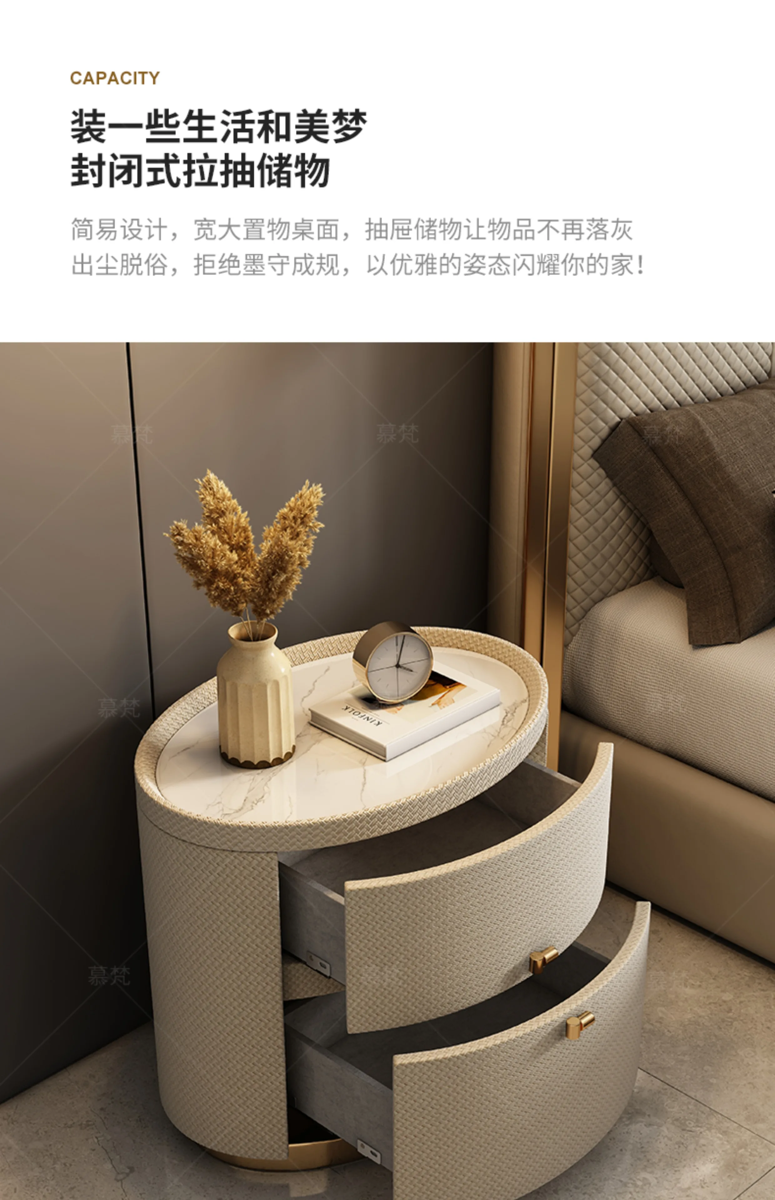 Italian minimalist designer bedside table light luxury rock slab Fendi bedroom high-end oval leather art Internet celebrity beds