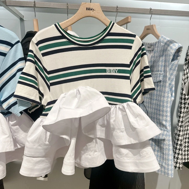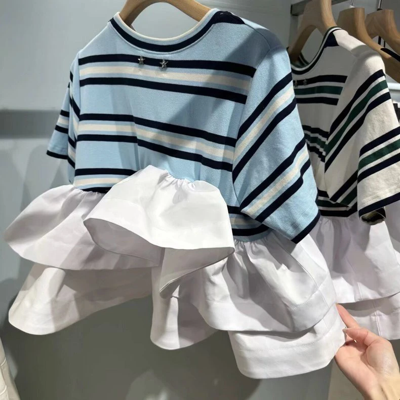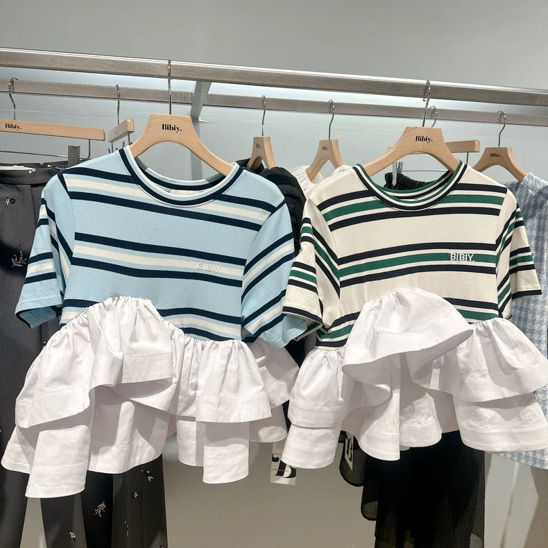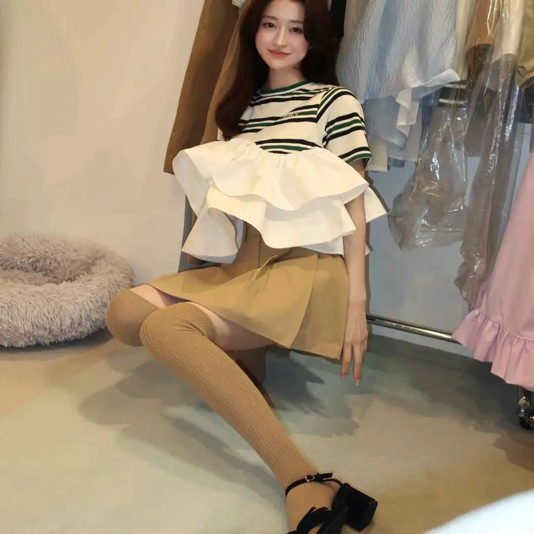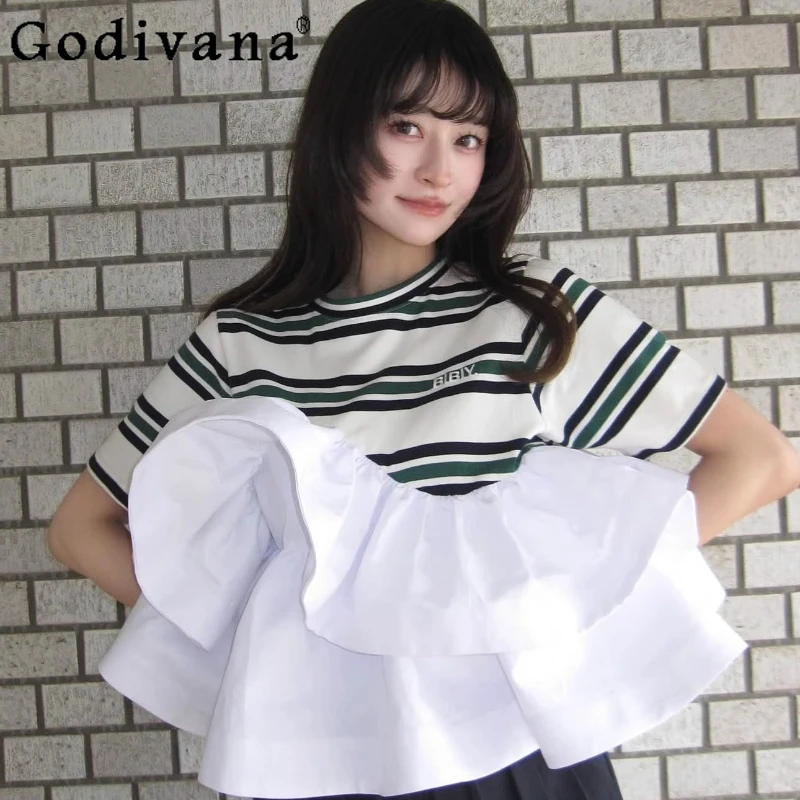 Japanese Style Sweet T-shirt 2025 Summer New Women’s Ruffle Edge Splicing Striped Top Ladies Casual Bud Tees Women Clothing