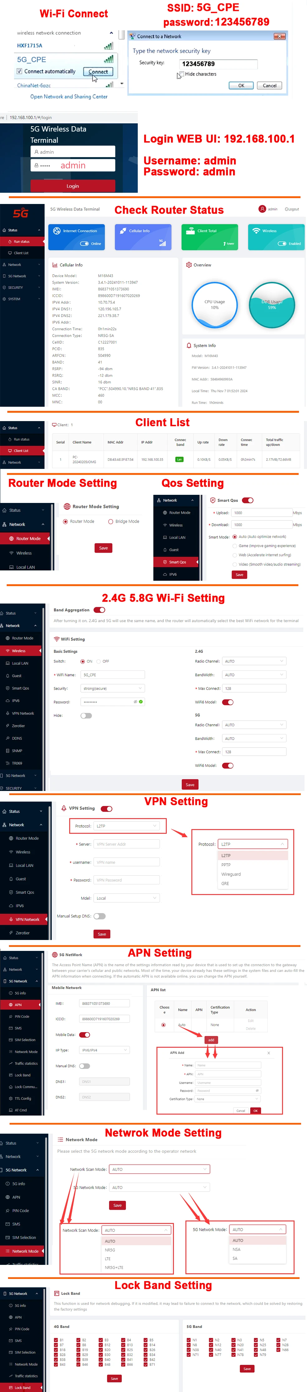 3G WCDMA: B1/ 2/ 4/ 5/ 8/ 19Product Introduction :5G Smart Router System (CPE), is based on brand-new embed platform, it can be satisfied with growing-up mobile connectionsrequirements and provides the fast speed beyond your imagination.