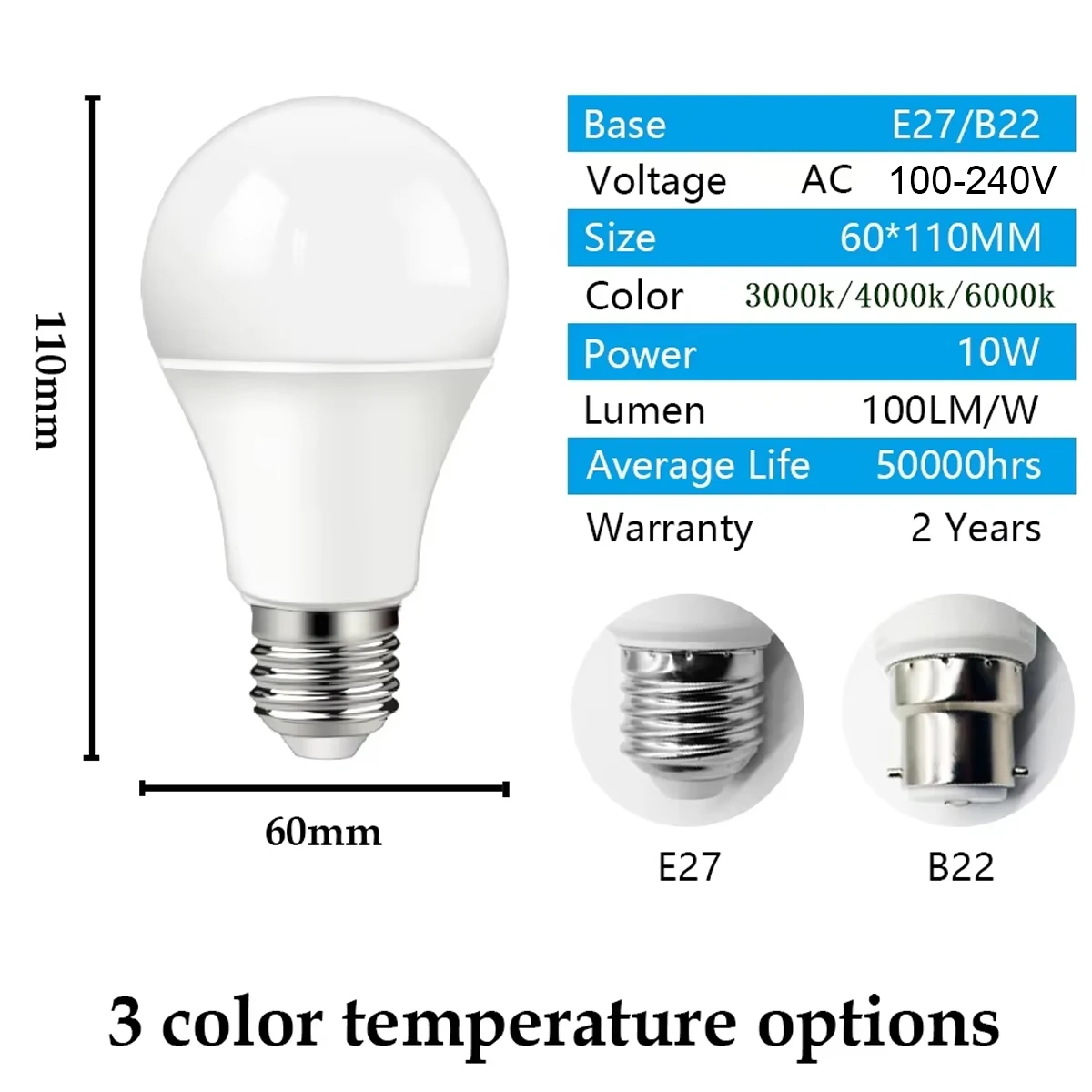 Note:This bulb has two different bases, E27 and B22. Please carefully select the correct base when purchasing. Don't choose the wrong base, because we will ship according to your order.