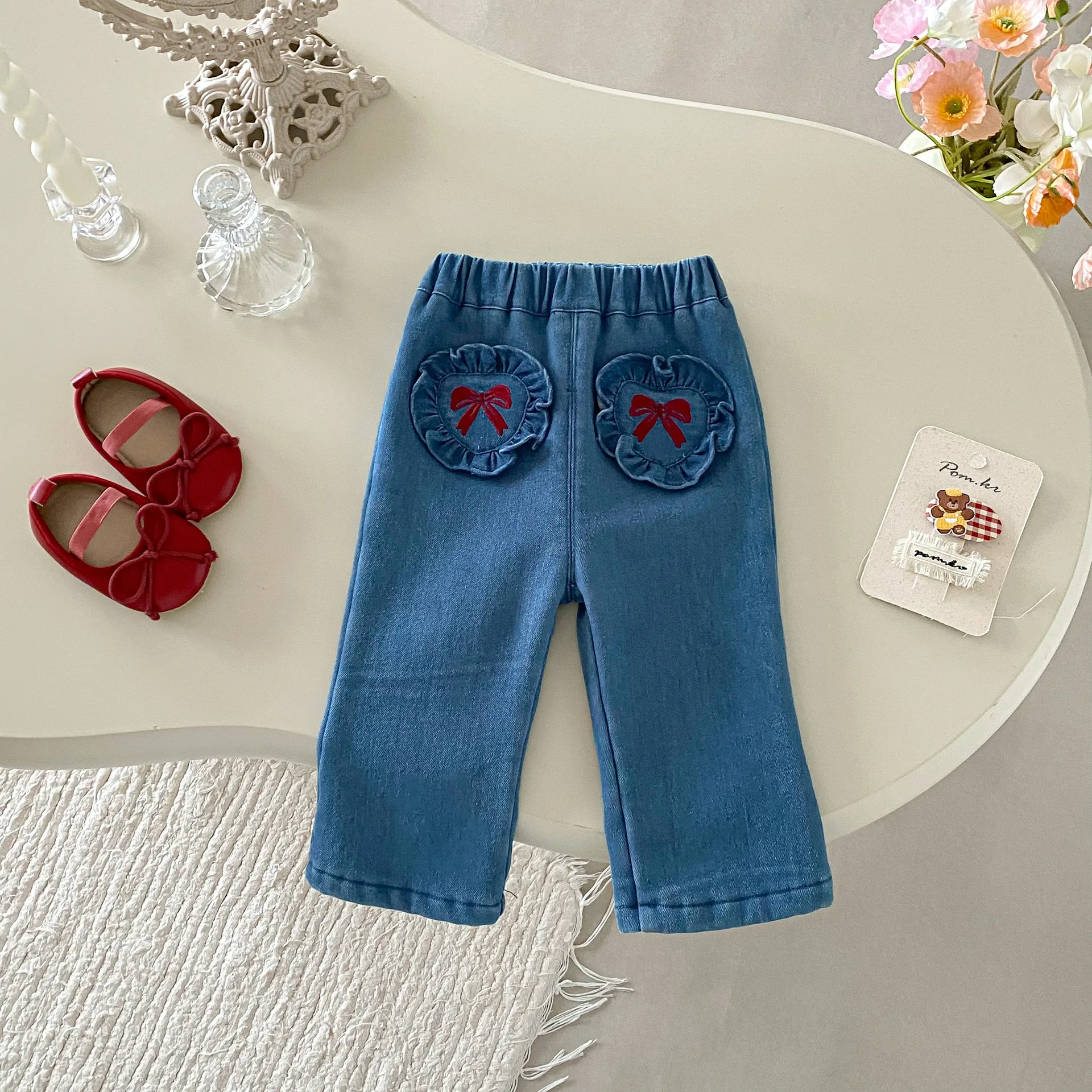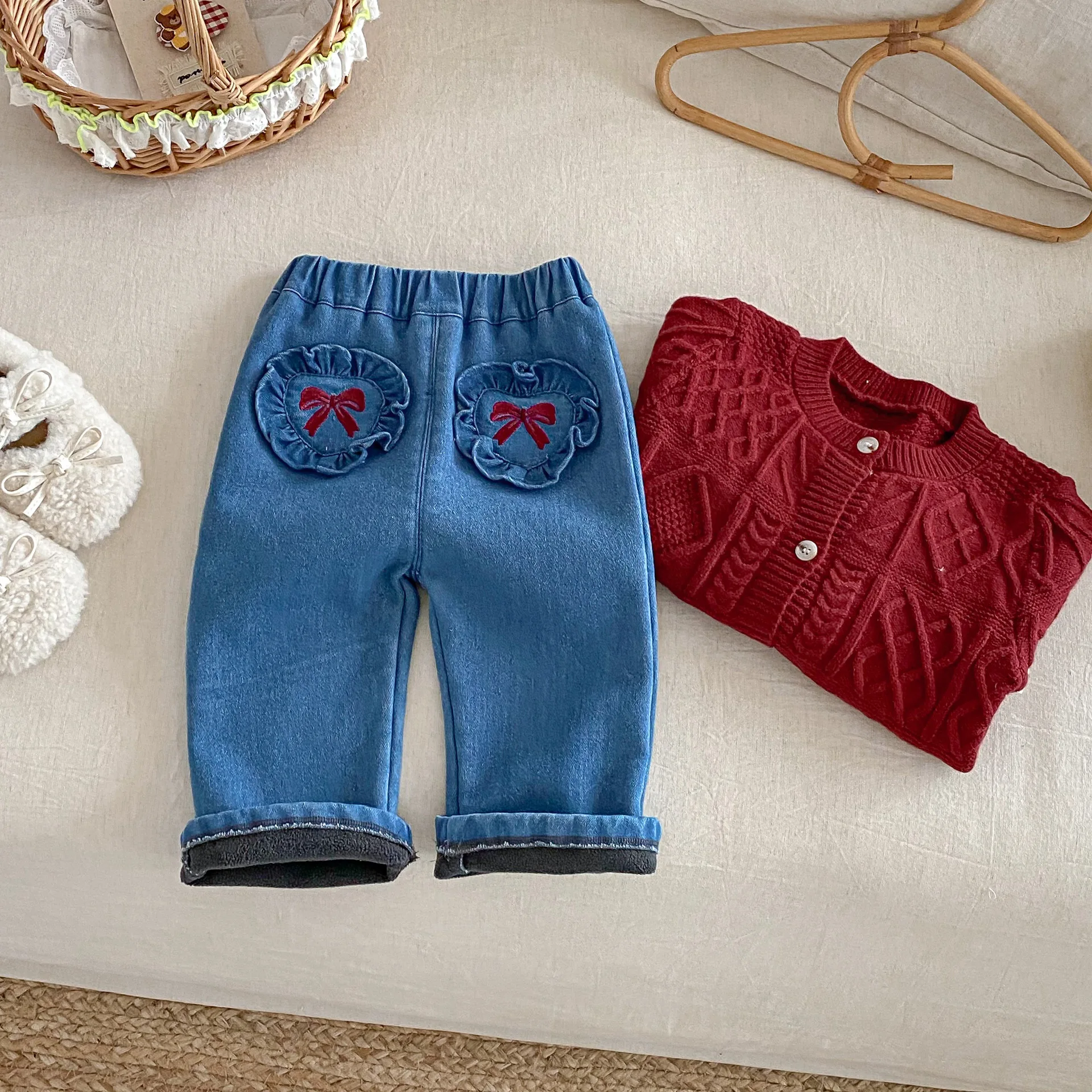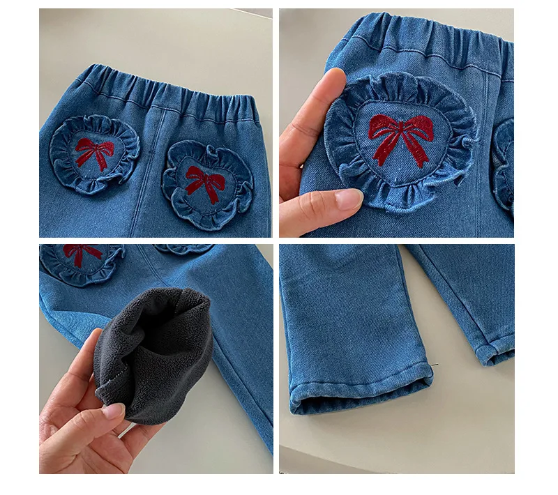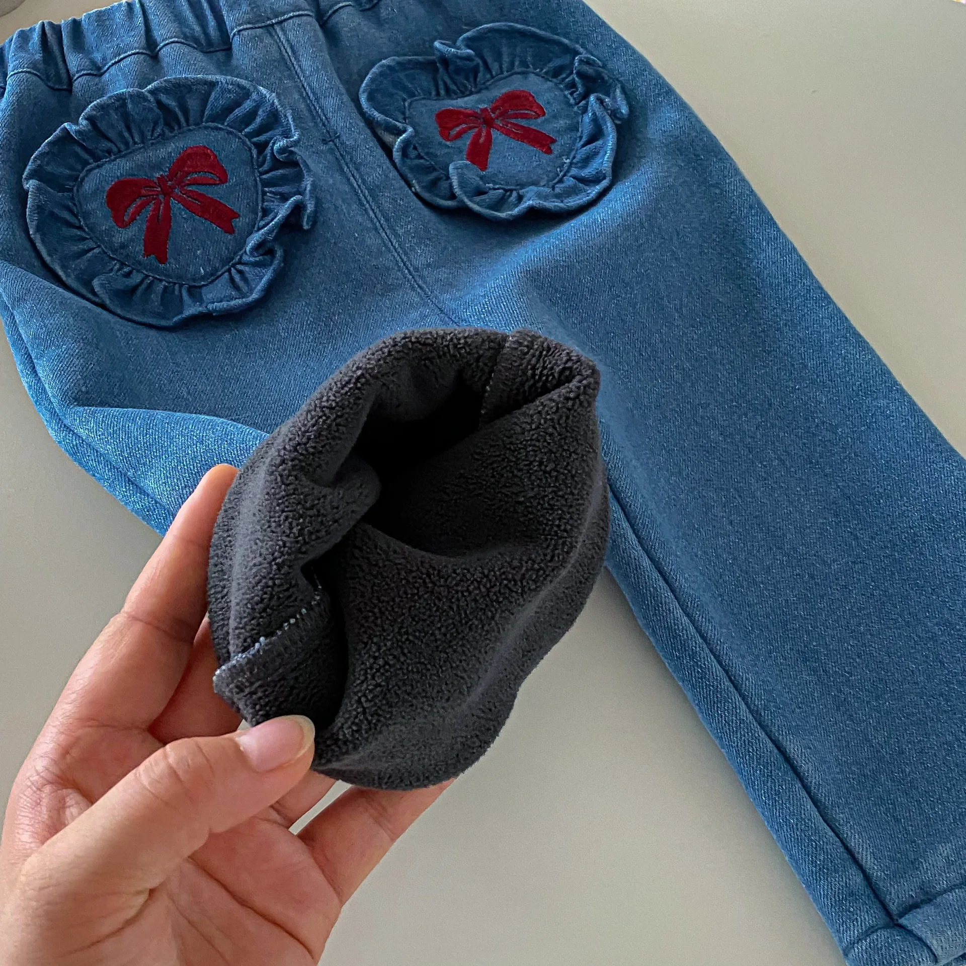 LILIGIRL 2025 Winter Girls Jeans Bow Embroidery Kids Denim Pants Skinny Girls Pants Fur Lining Pants 1-5 Y
