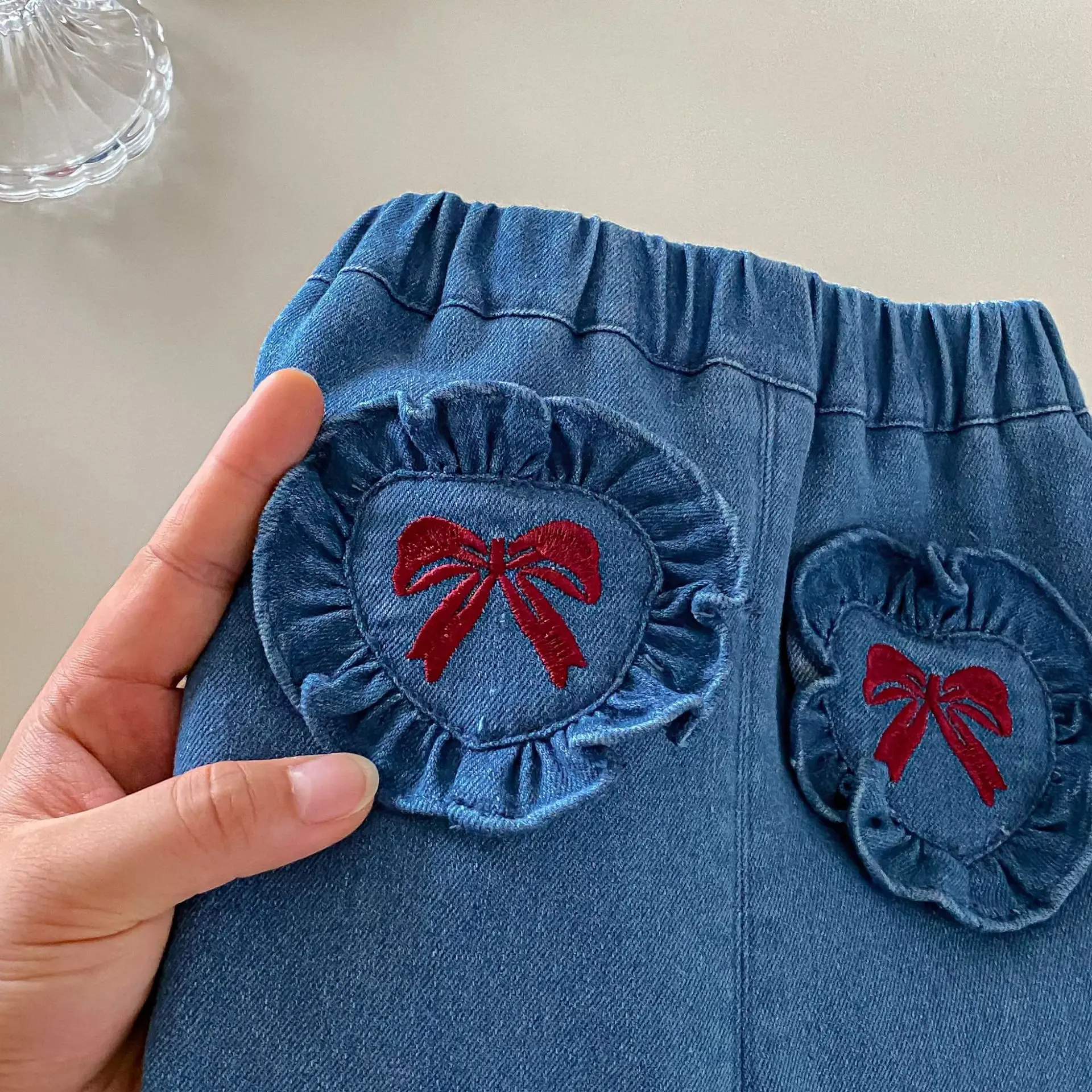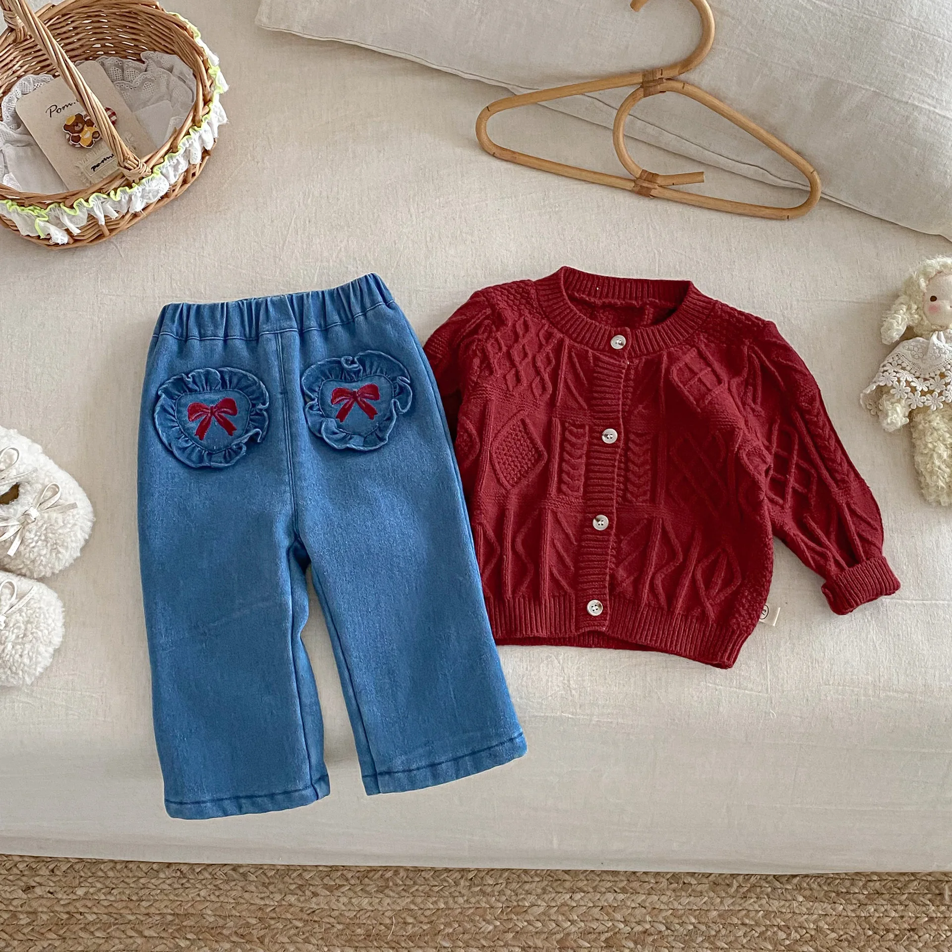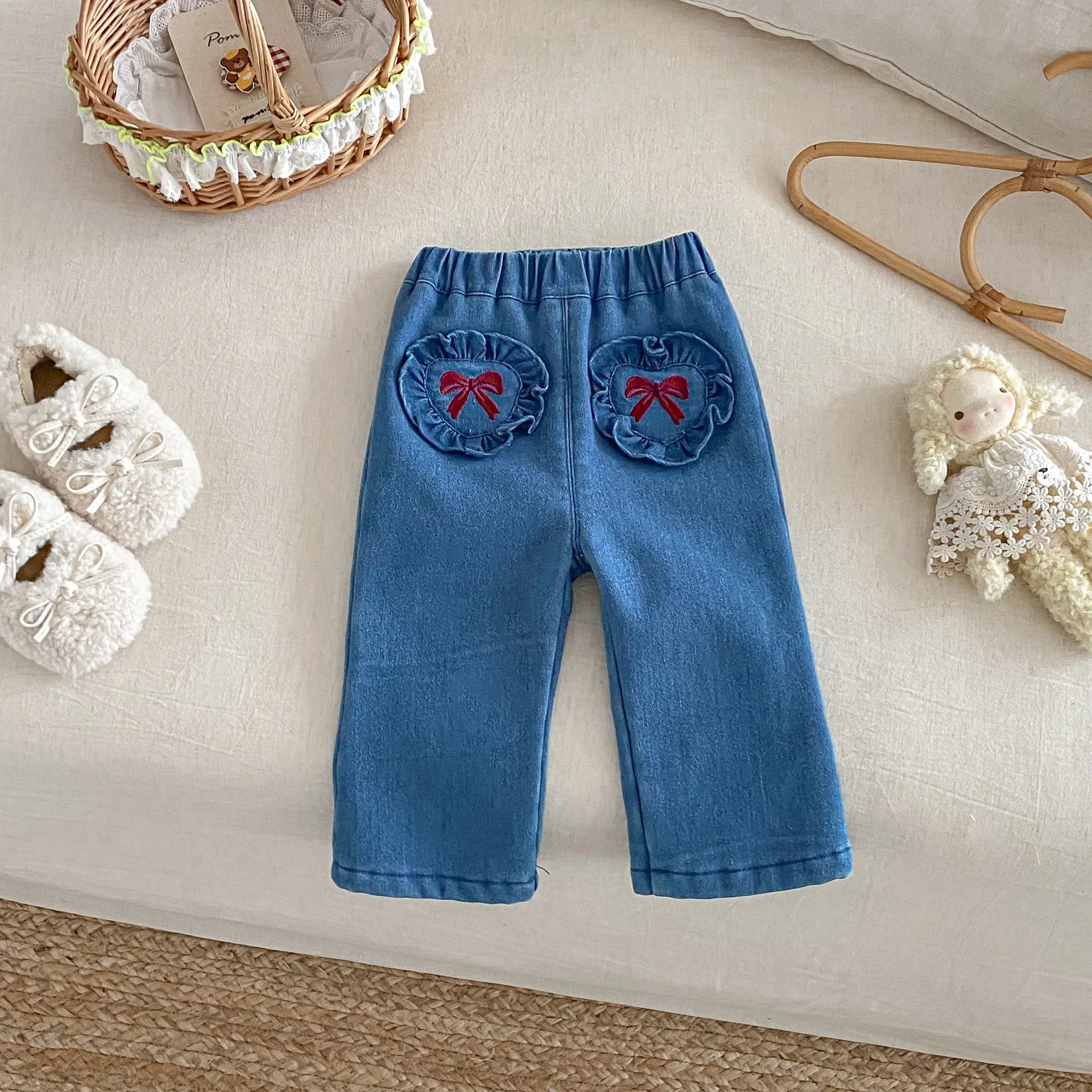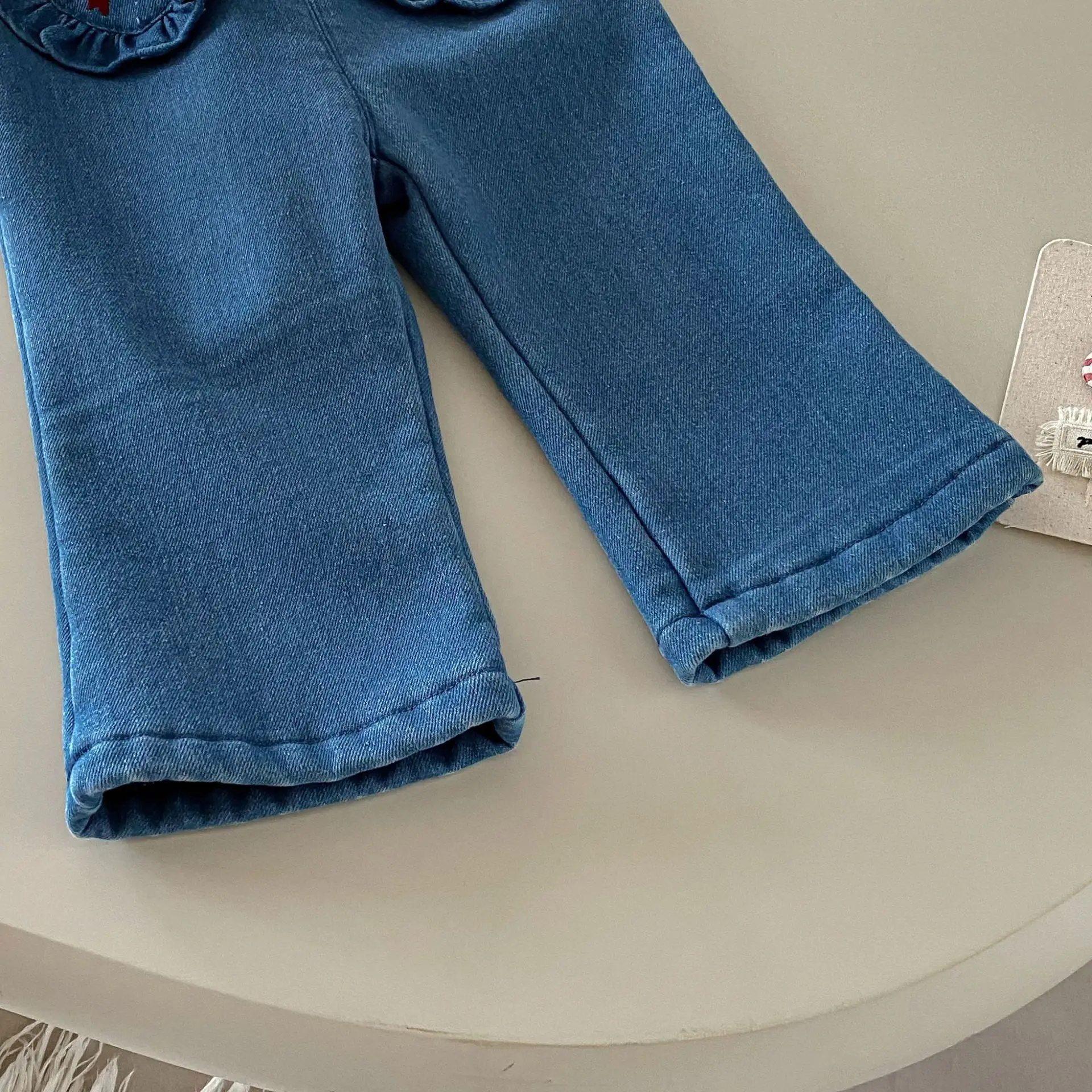 LILIGIRL 2025 Winter Girls Jeans Bow Embroidery Kids Denim Pants Skinny Girls Pants Fur Lining Pants 1-5 Y