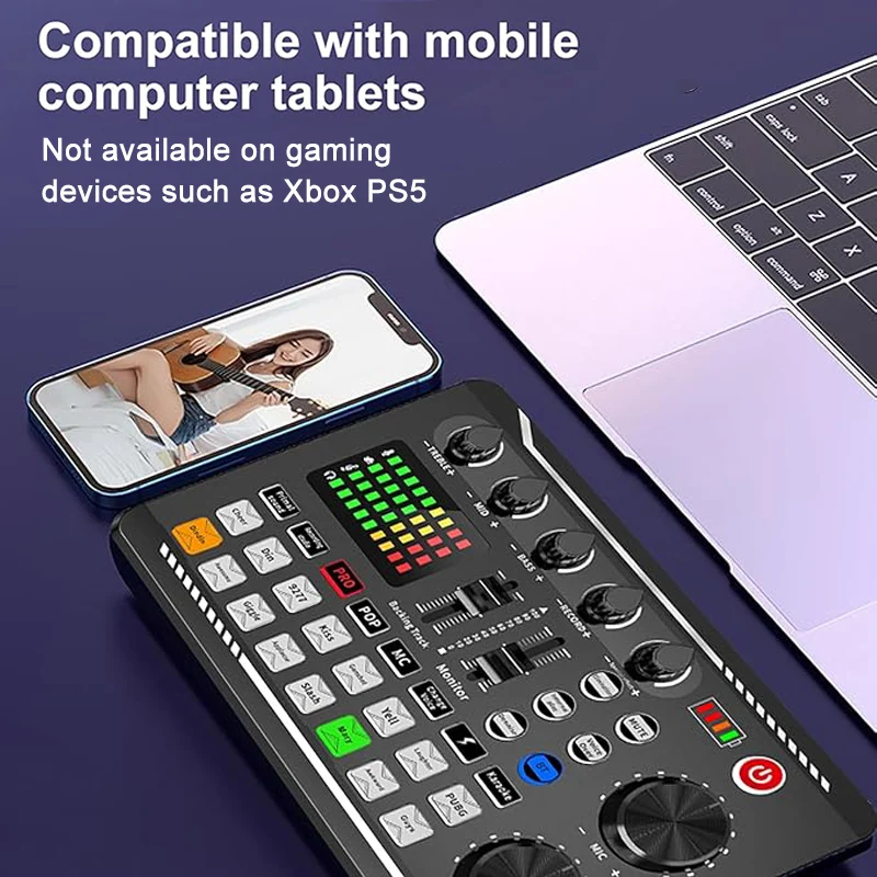 This soundboard PC can adjust the treble, midrange, and bass. Treble makes your voice fuller, clearer, and more penetrating; midrange makes your voice more stable; bass makes your voice clearer, transparent, and magnetic. It can be used for DJ, music studio recording, online karaoke, podcast, singing, karaoke, live broadcast, online chat, etc.