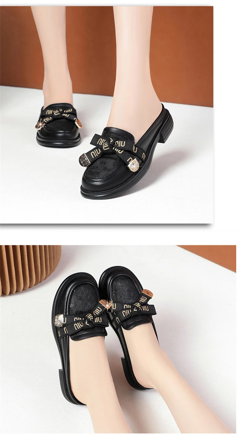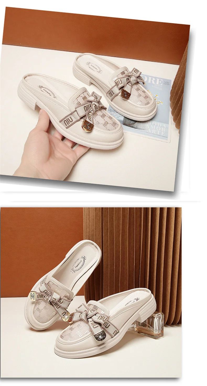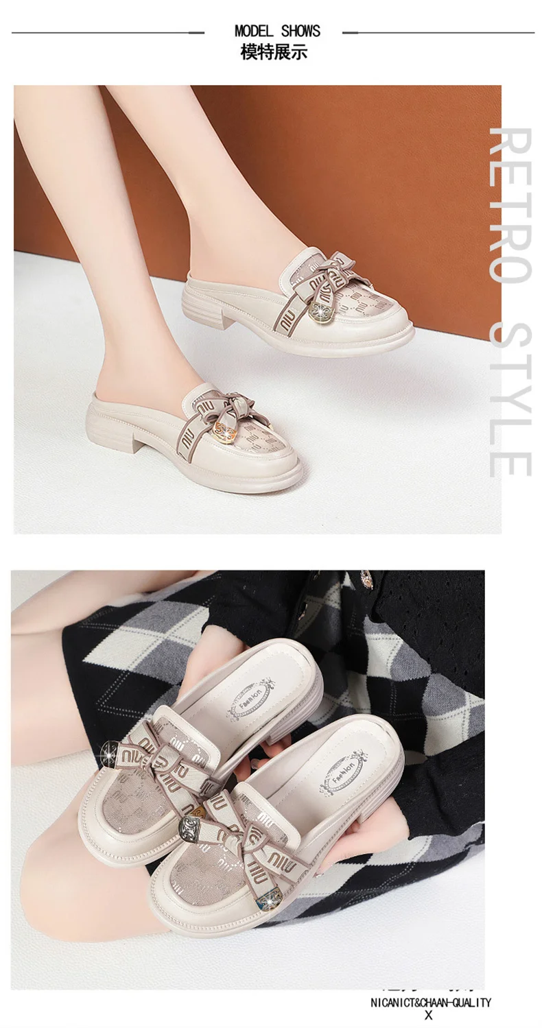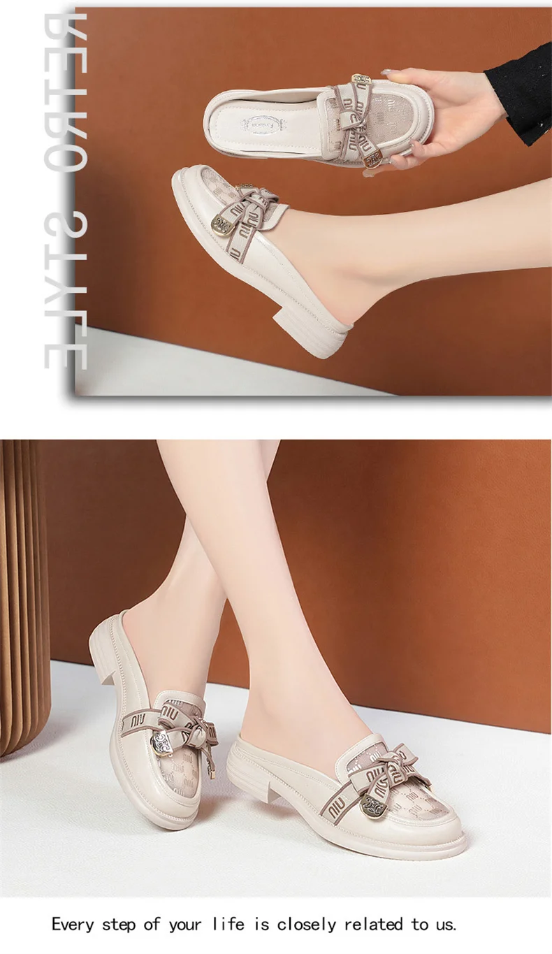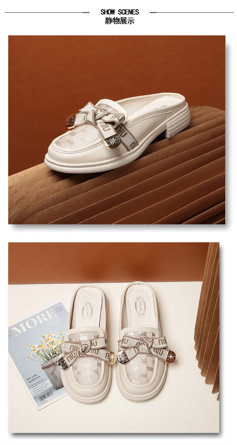 Loafers Baotou Half-Slippers Women’S Single Shoes 2023 New Summer Women’S Shoes Bowknot Hollow Mesh Outer Wear Sandals Fashion