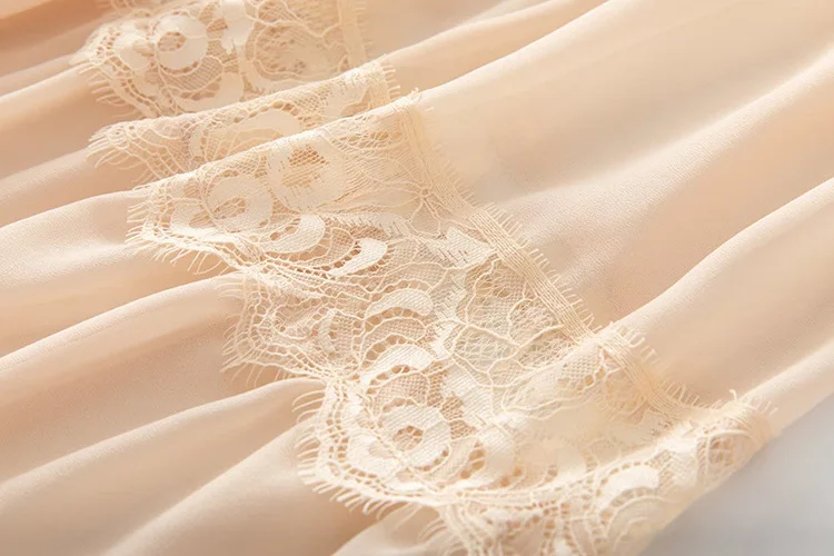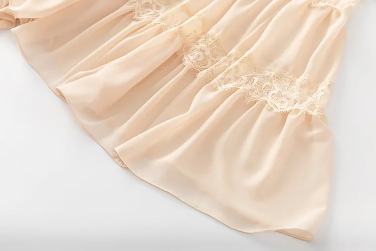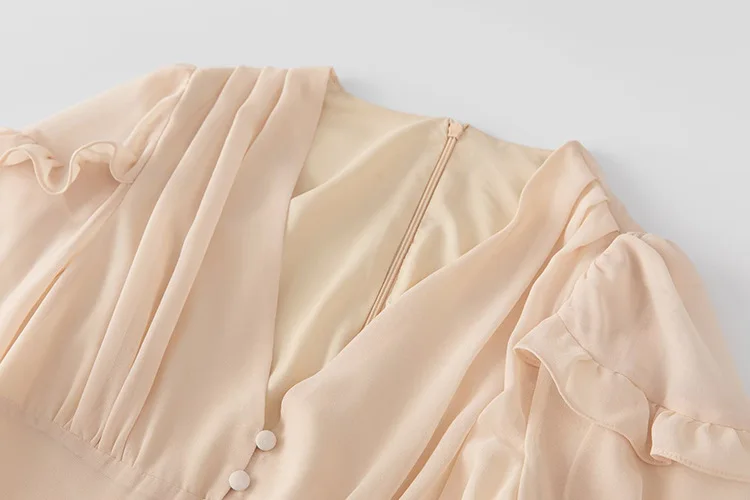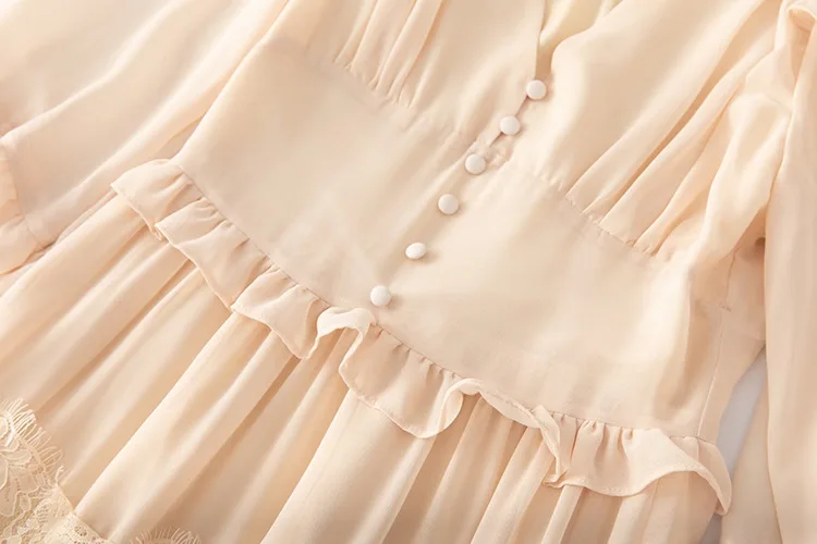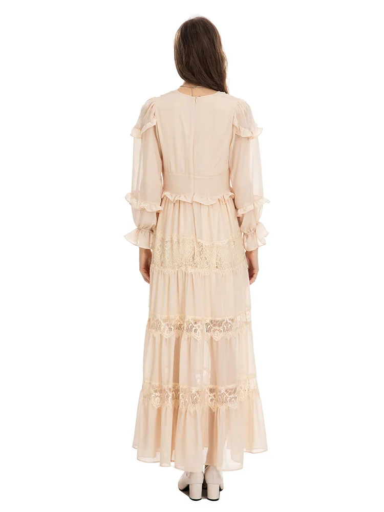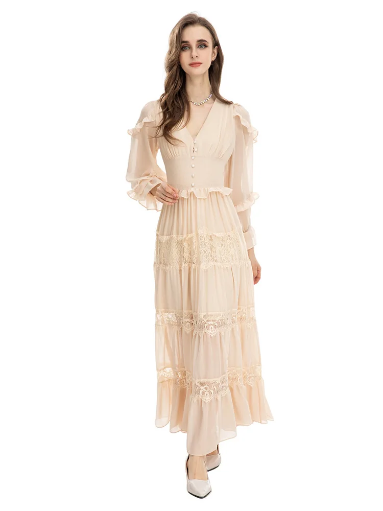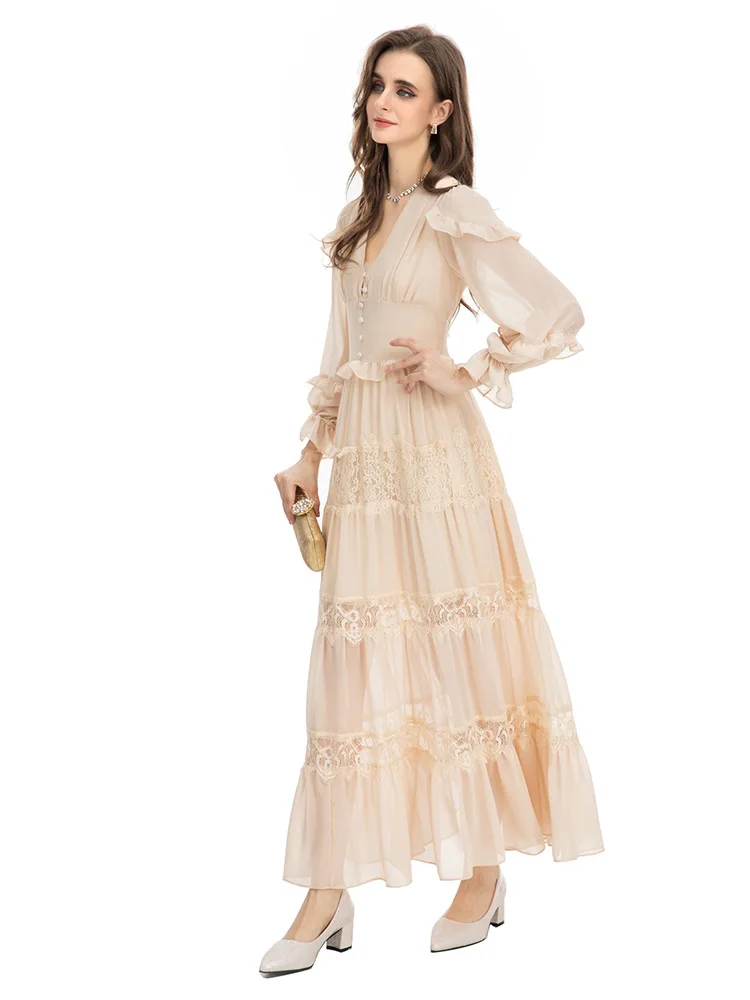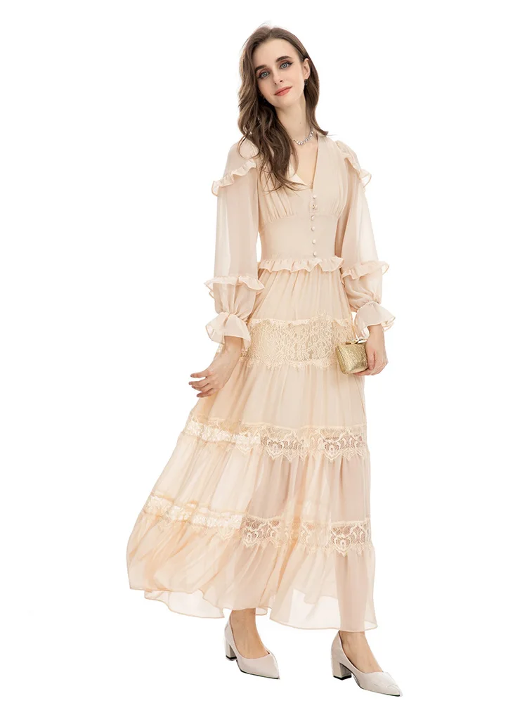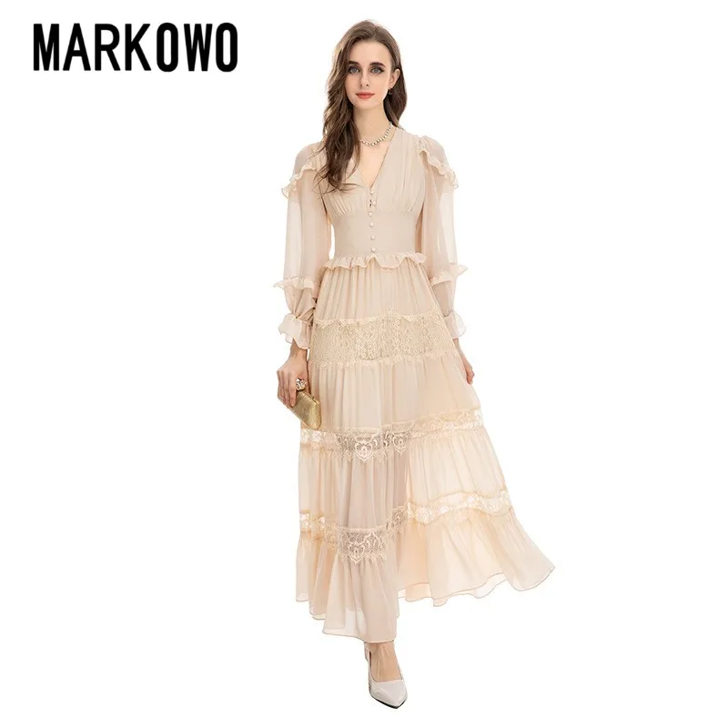 MARKOWO Desinger Brand 2023 Temperament V-neck bubble sleeve heavy engineering ear edge lace splicing solid color dress