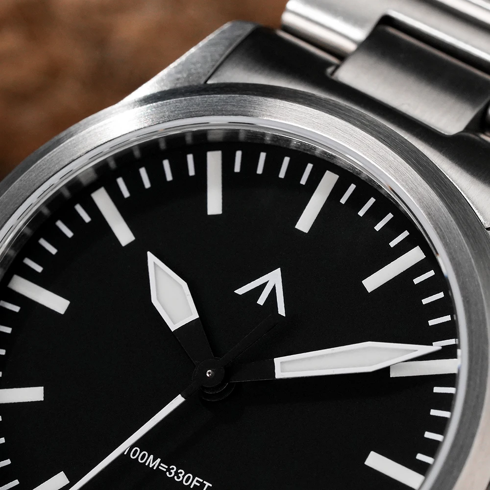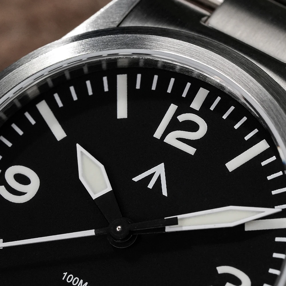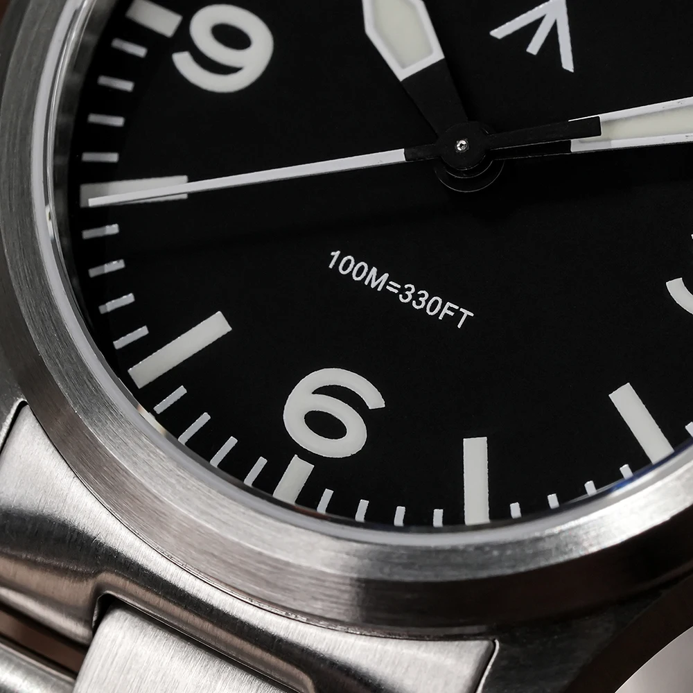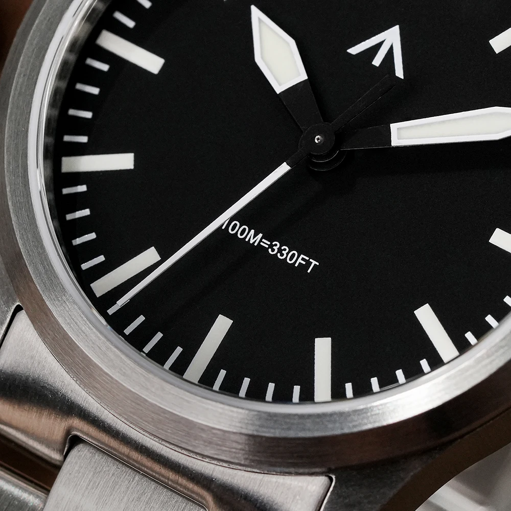 High-grade Swiss BGW9 lume on hands and markers delivers exceptional low-light readability with clean, long-lasting blue glow