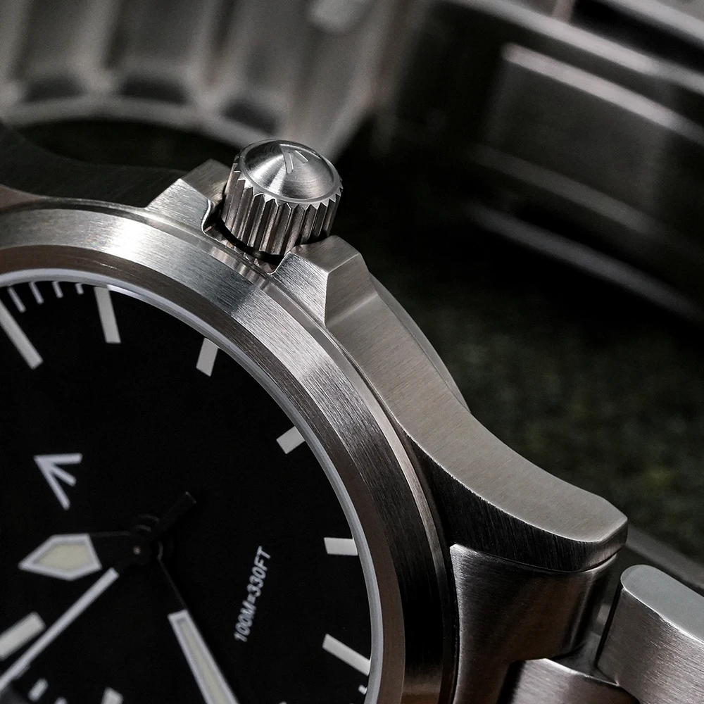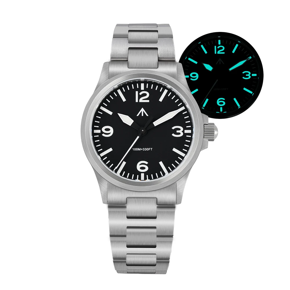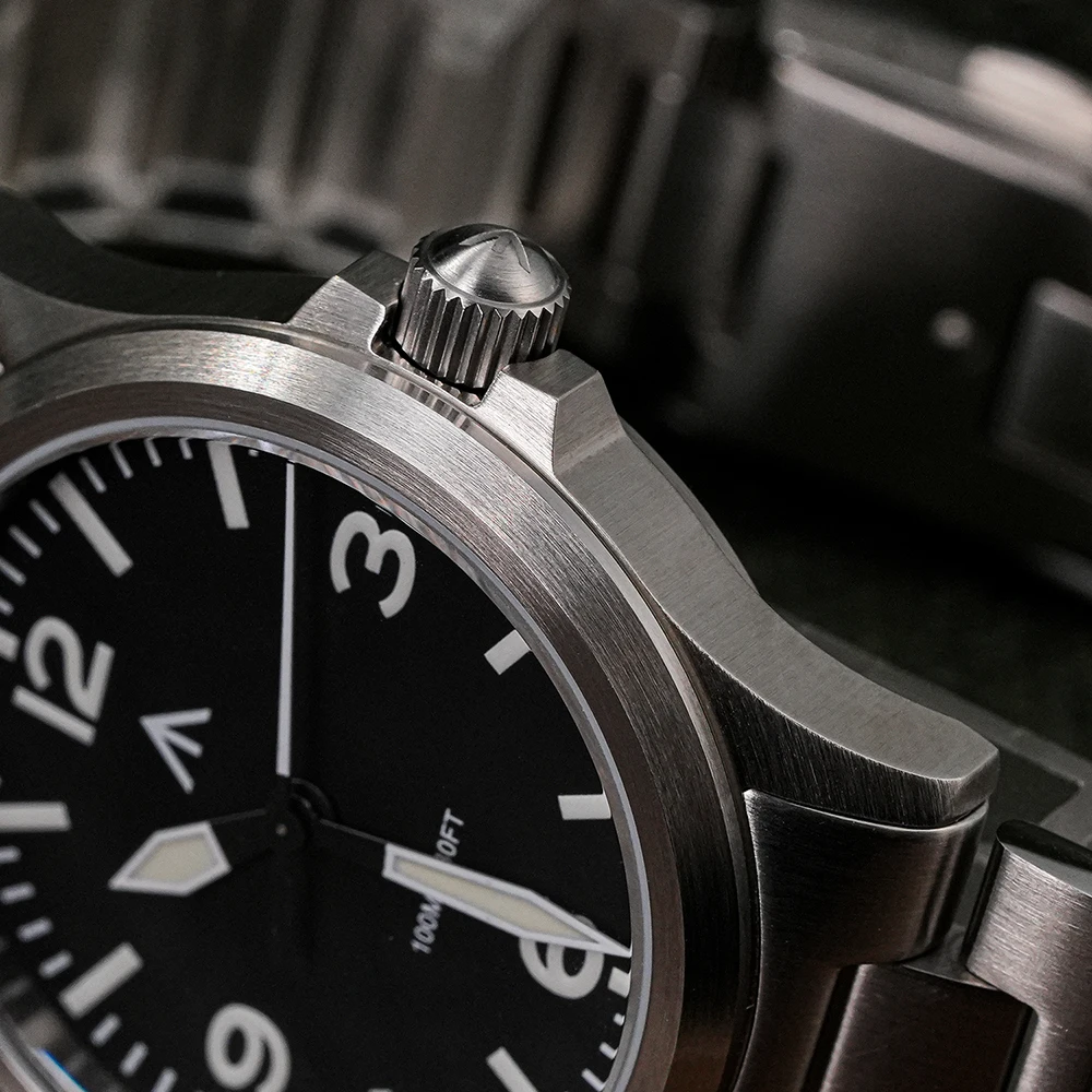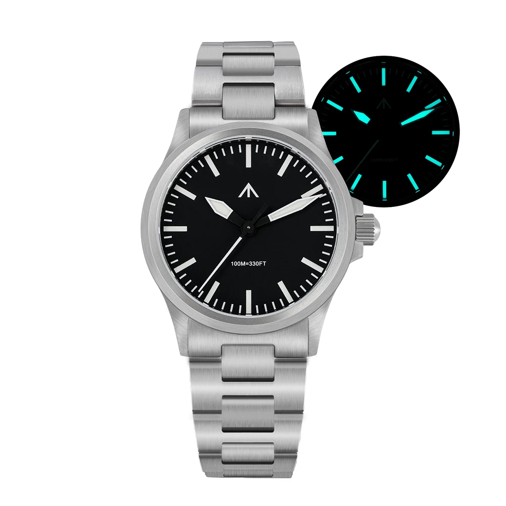 High-grade Swiss BGW9 lume on hands and markers delivers exceptional low-light readability with clean, long-lasting blue glow