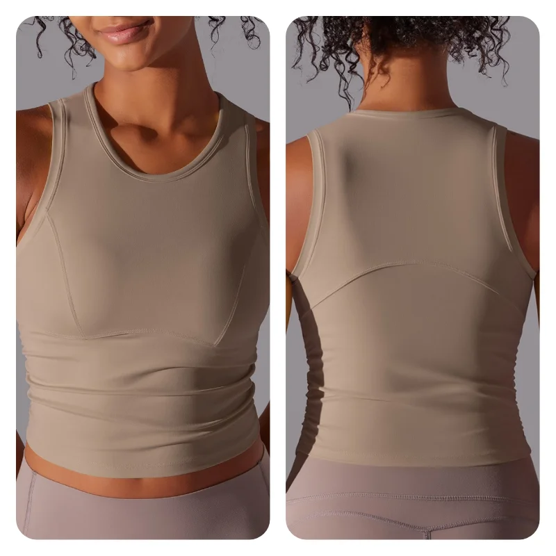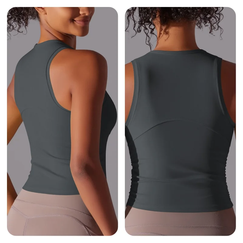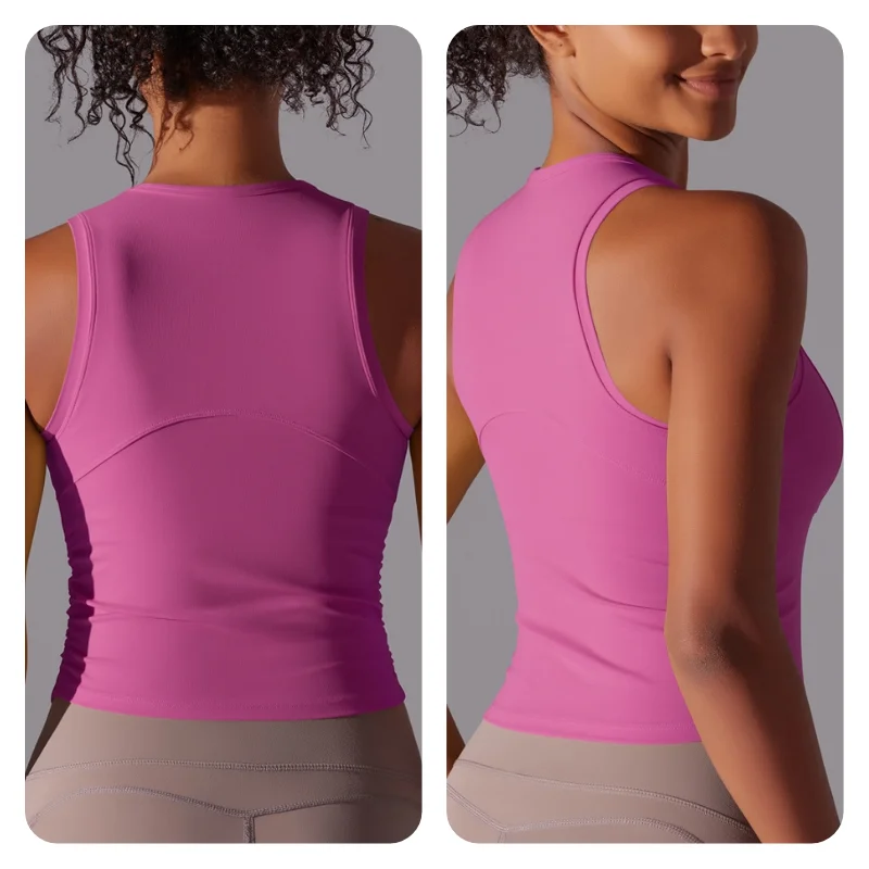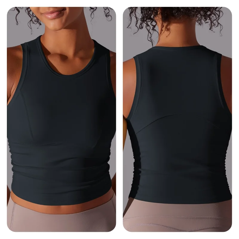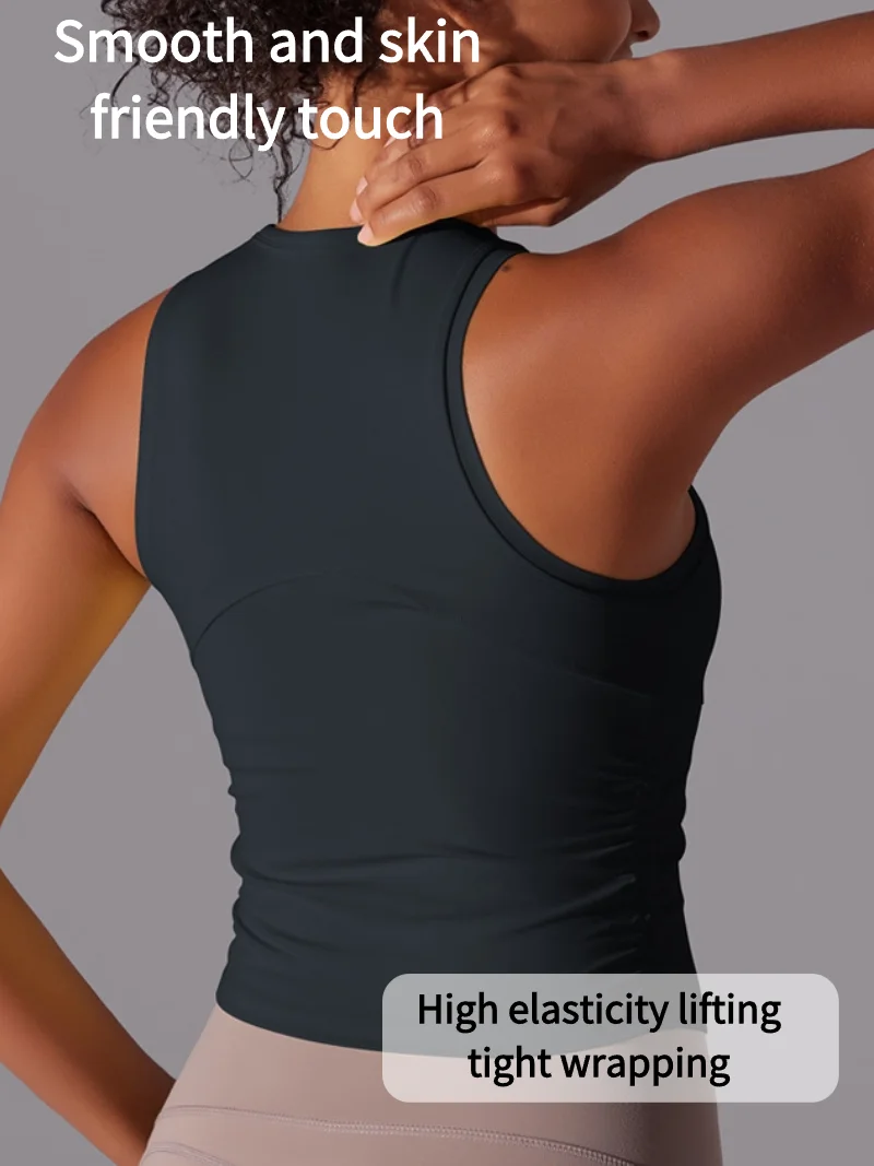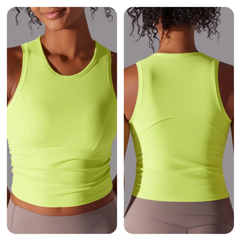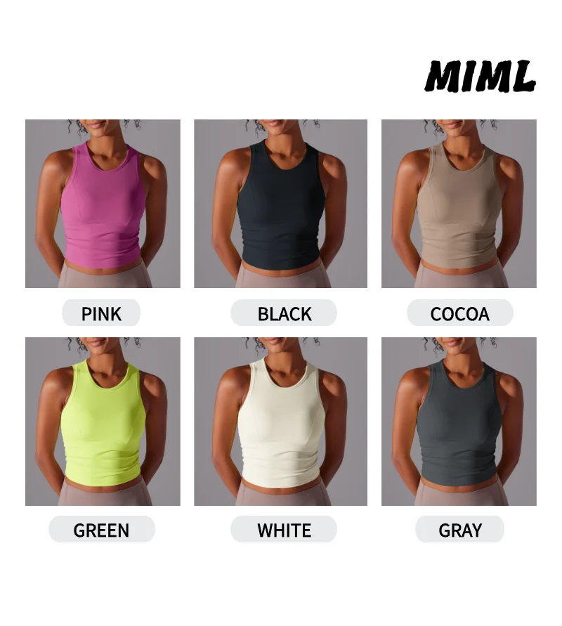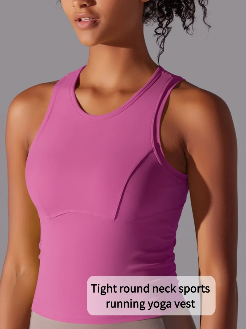MIML Women’s Double-Sided Nylon Solid Color Sports Vest Round Neck Tight Fitting Belly Covering Long Running Fitness Yoga Suit