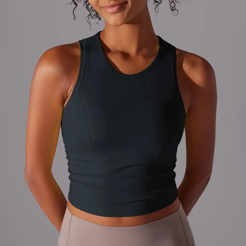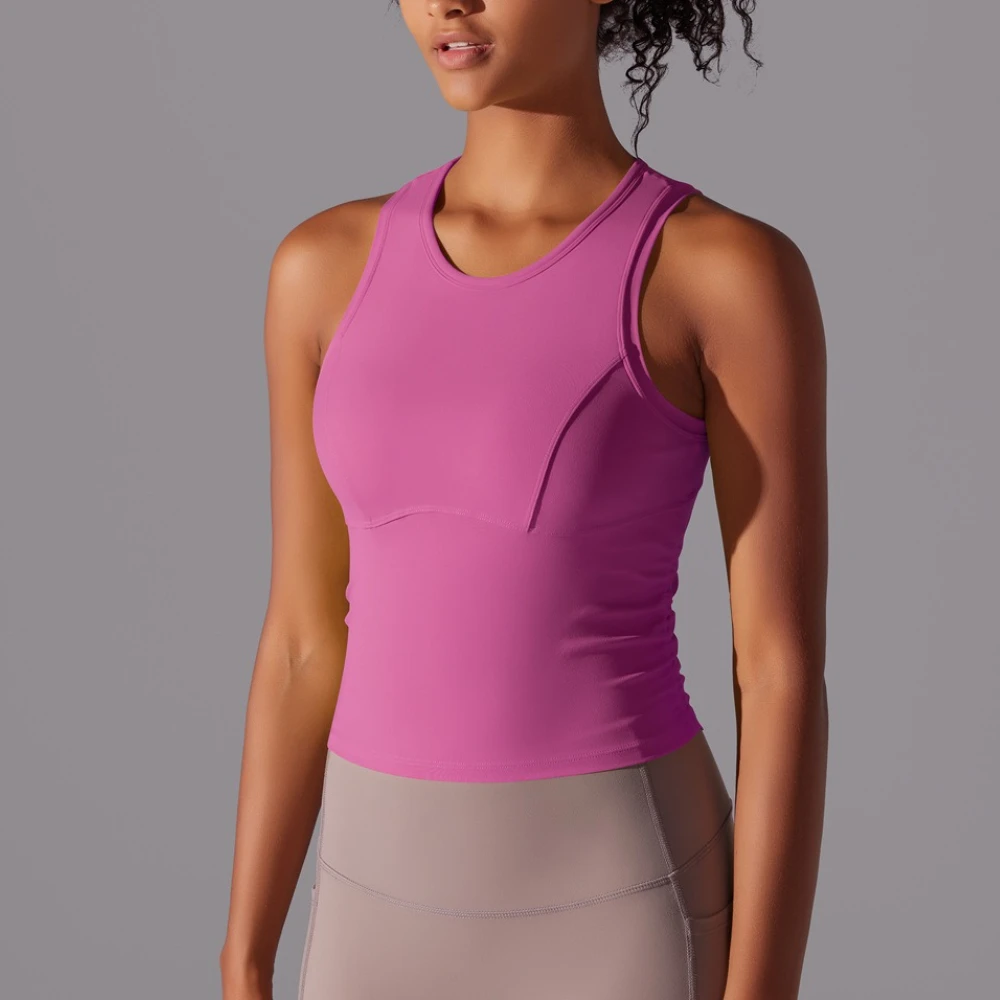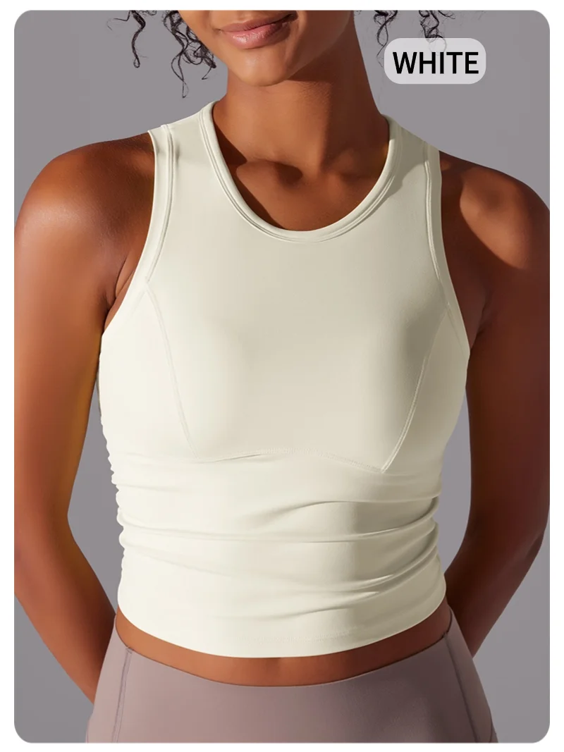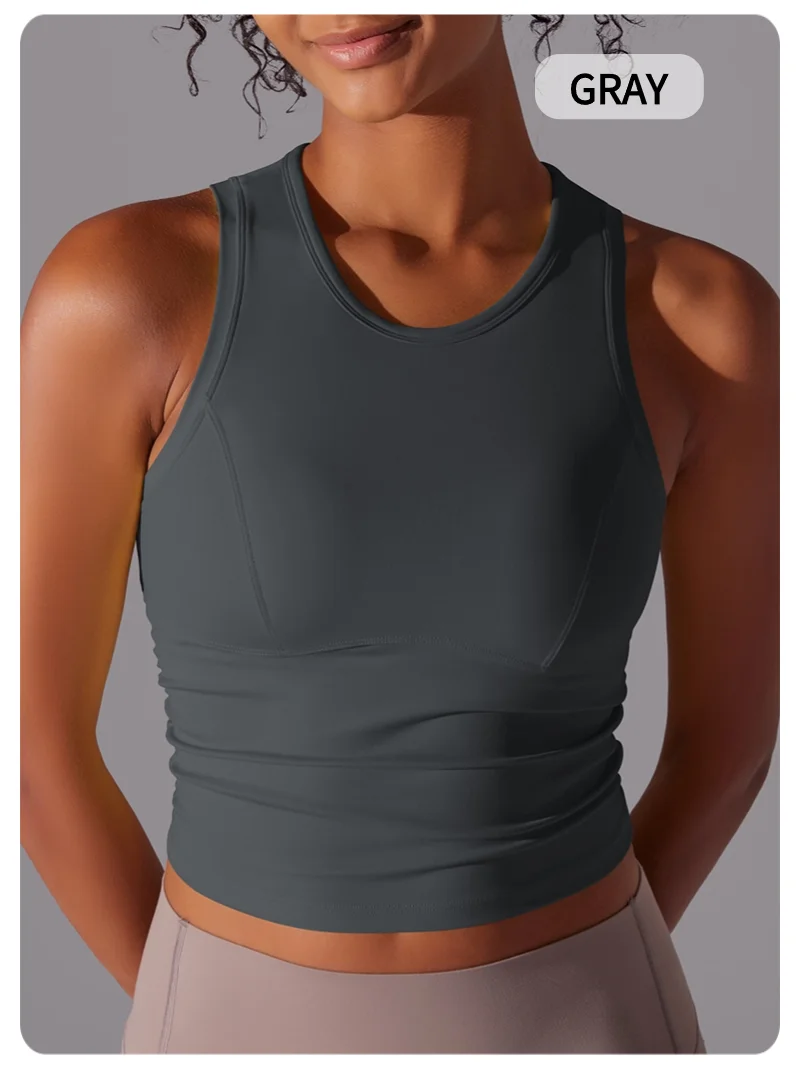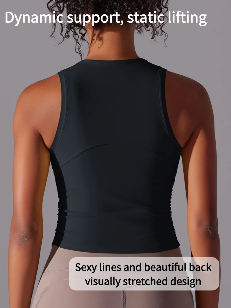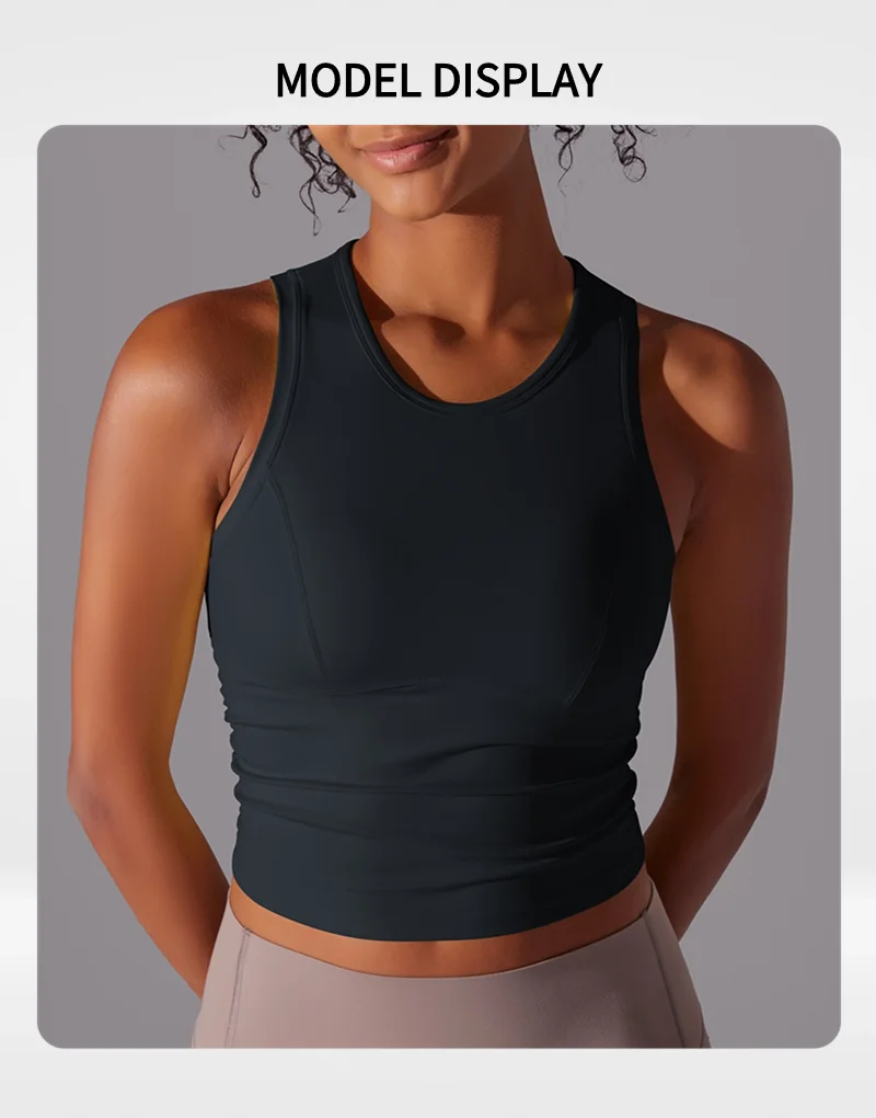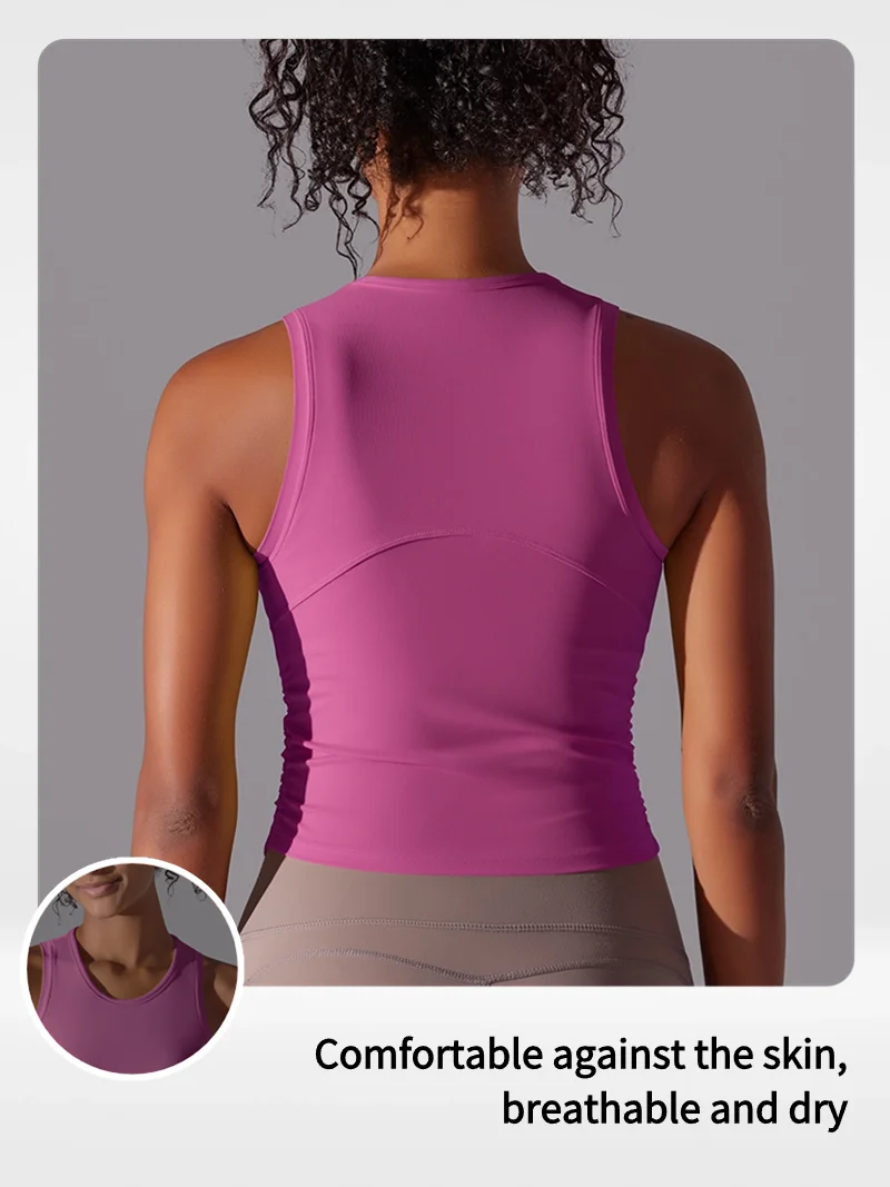 MIML Women’s Double-Sided Nylon Solid Color Sports Vest Round Neck Tight Fitting Belly Covering Long Running Fitness Yoga Suit
