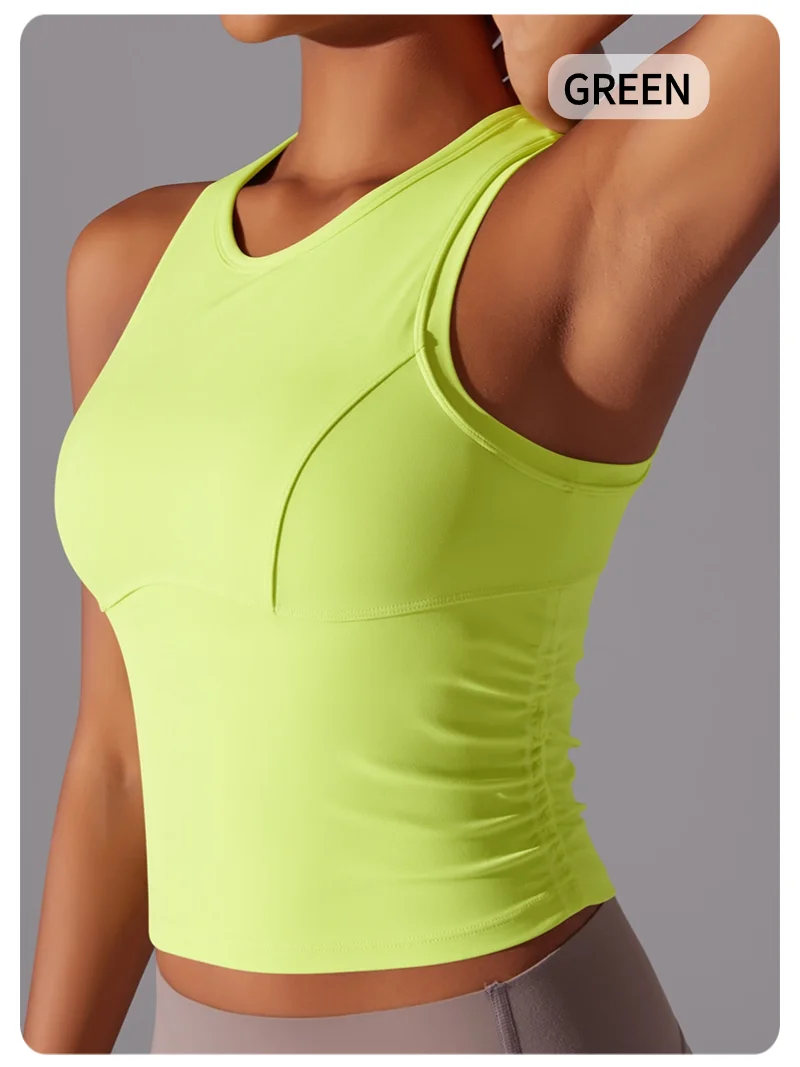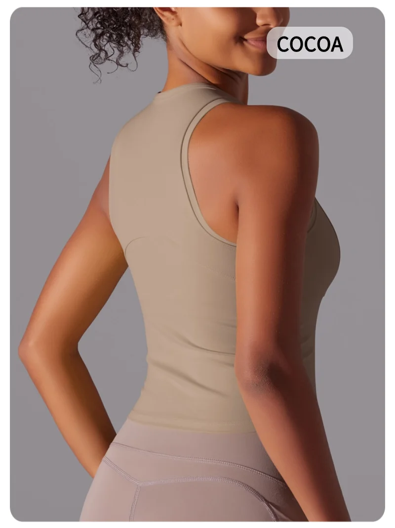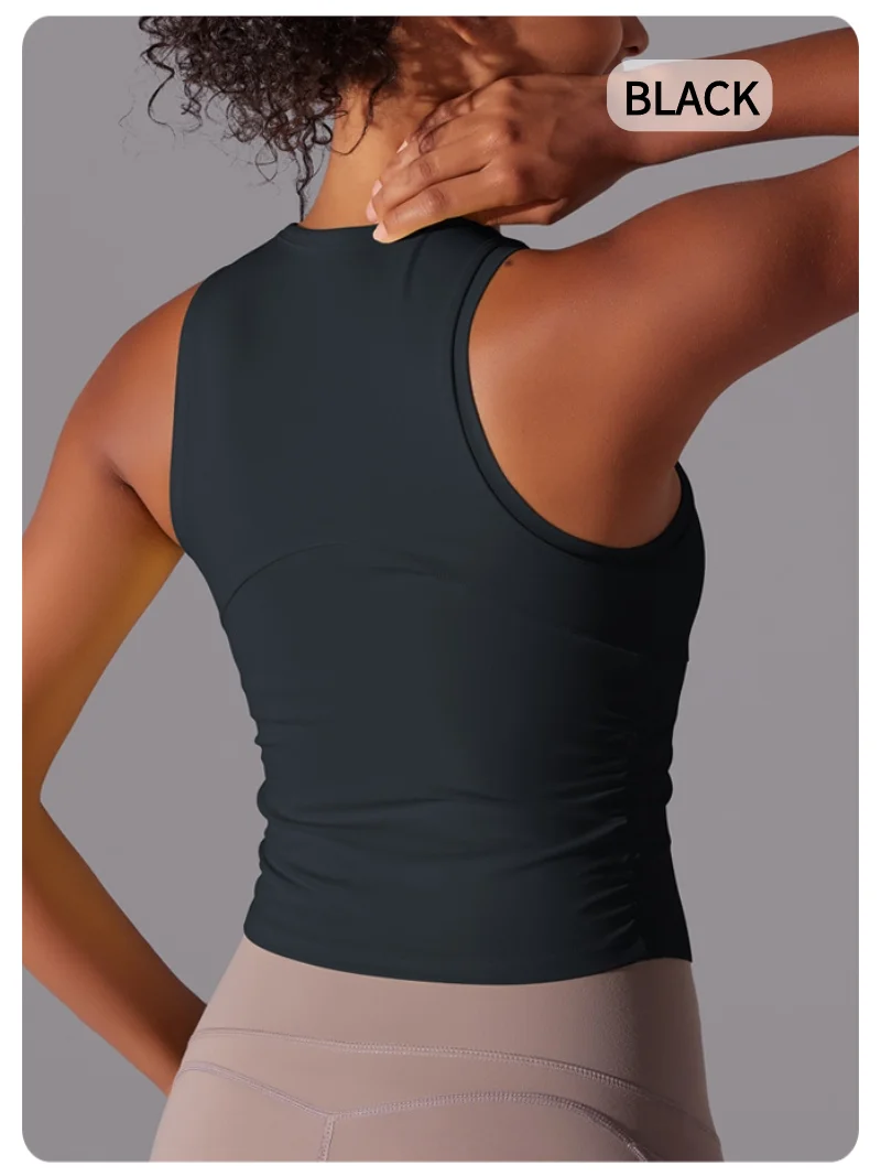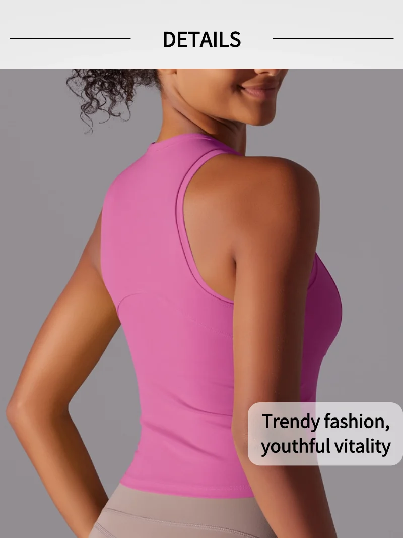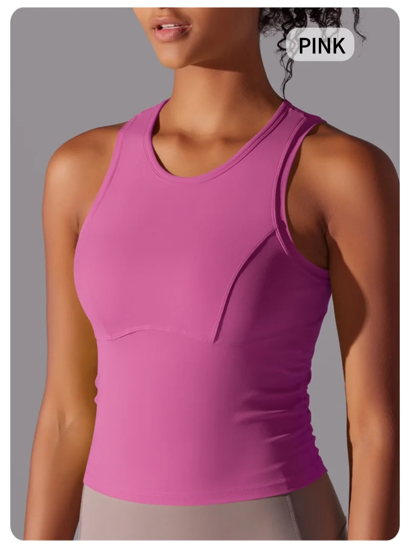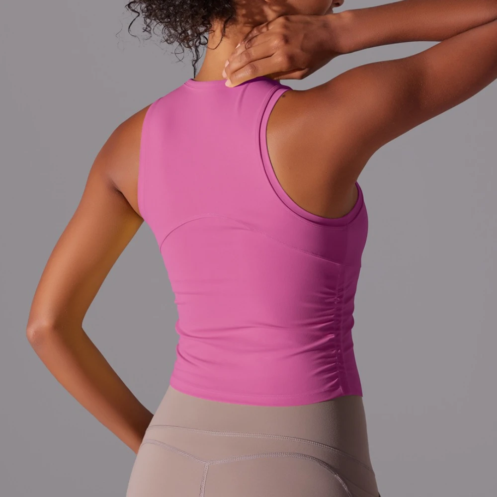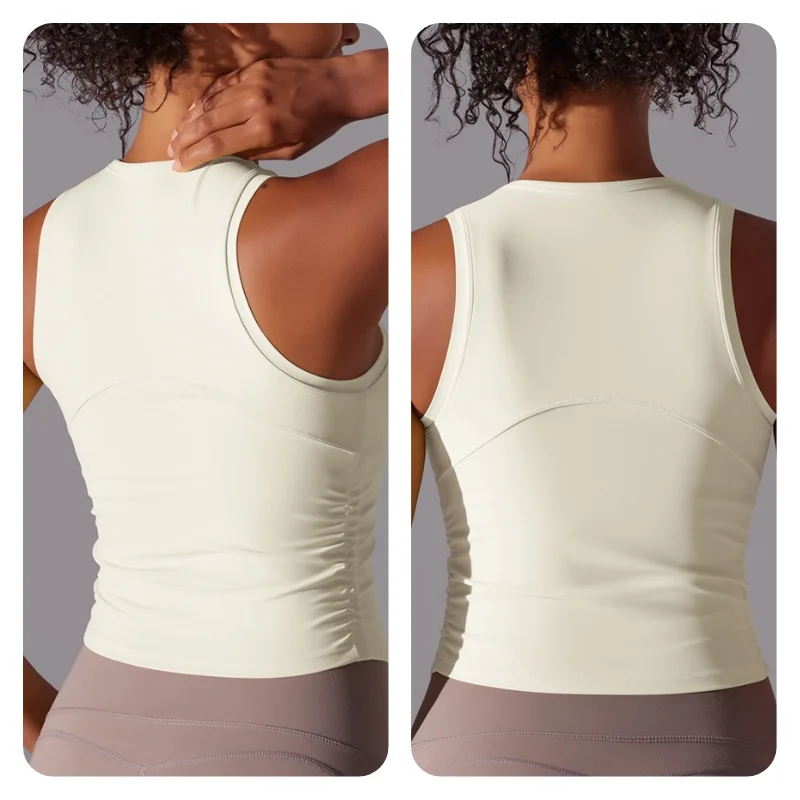 MIML Women’s Double-Sided Nylon Solid Color Sports Vest Round Neck Tight Fitting Belly Covering Long Running Fitness Yoga Suit