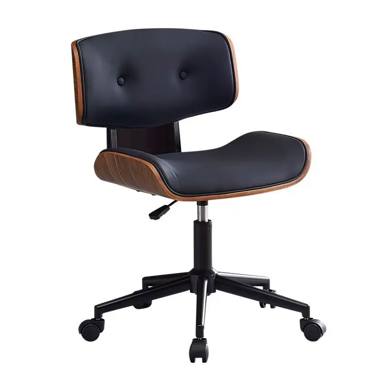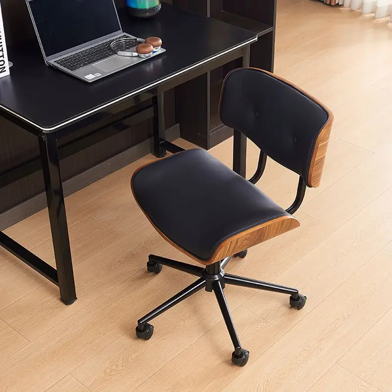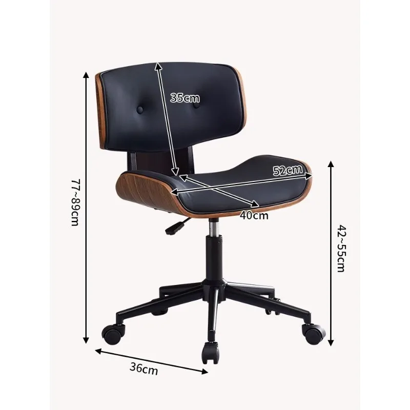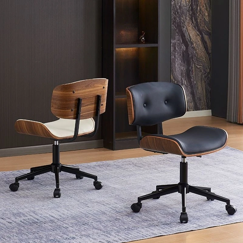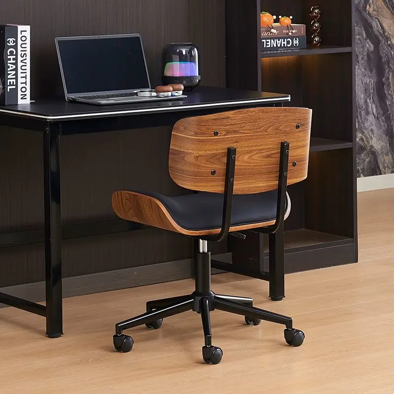 Modern Leather Office Chair, Walnut Wood Accent Swivel Desk Chair, Stylish Retro Ergonomic Chair for Home Office Furniture