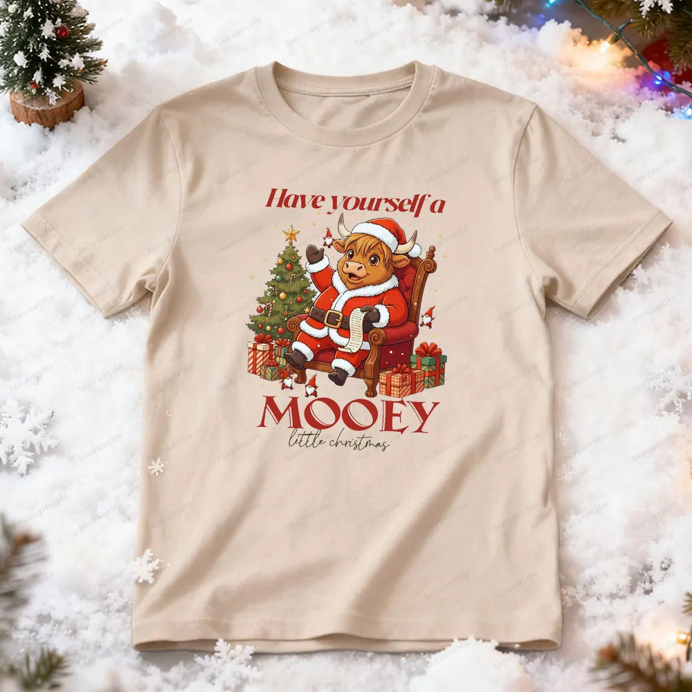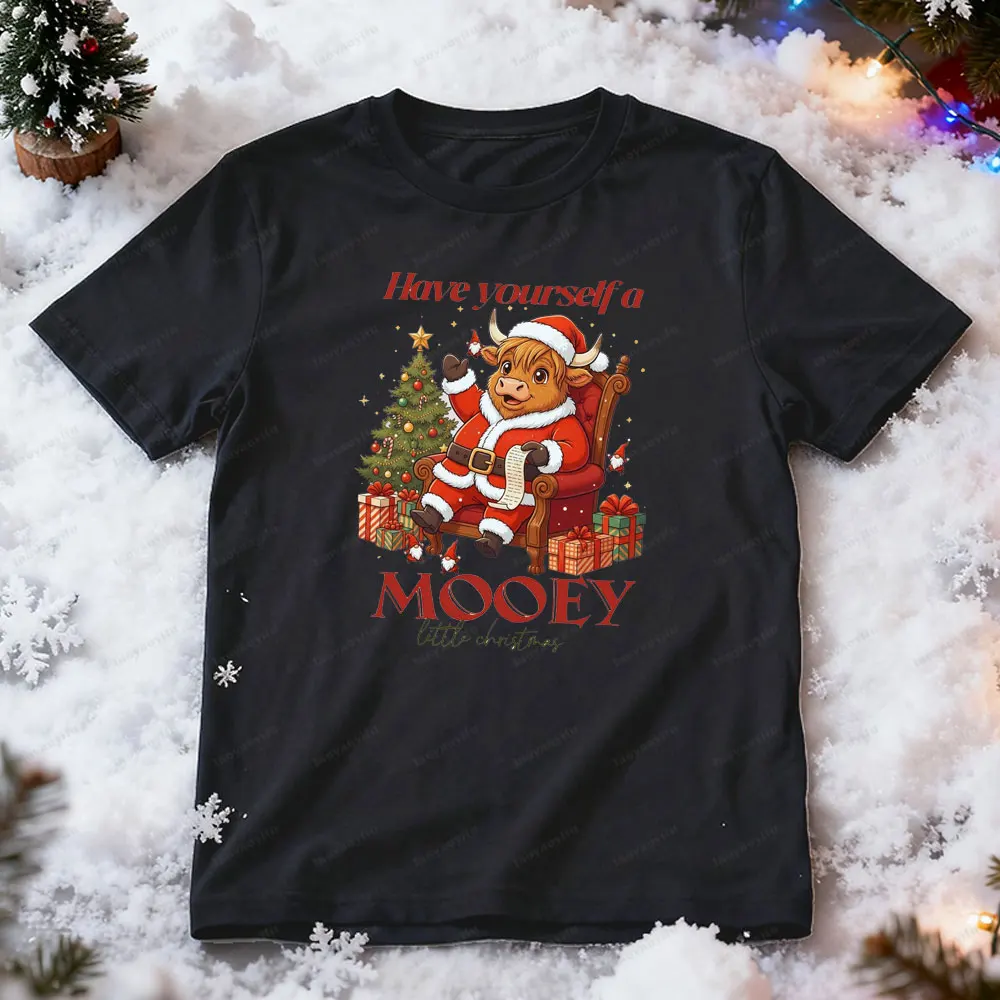 Mooey Christmas Highland Cow Men Women Cotton T-Shirt Funny Christmas Holiday Winter Tee for Women Farm Xmas Gift Women Clothing