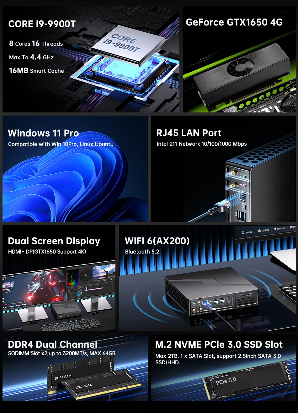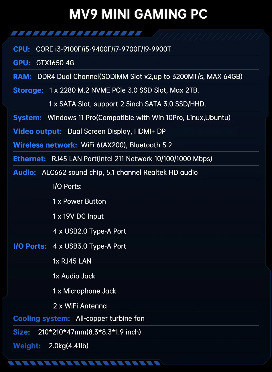 Msecore MV9 Mini PC 9th gen Intel Core i5/i7/i9 GTX1650 GPU Windows 11 Pro 64GB DDR4 RAM M.2 SSD BT5.0 Gaming Desktop Computer