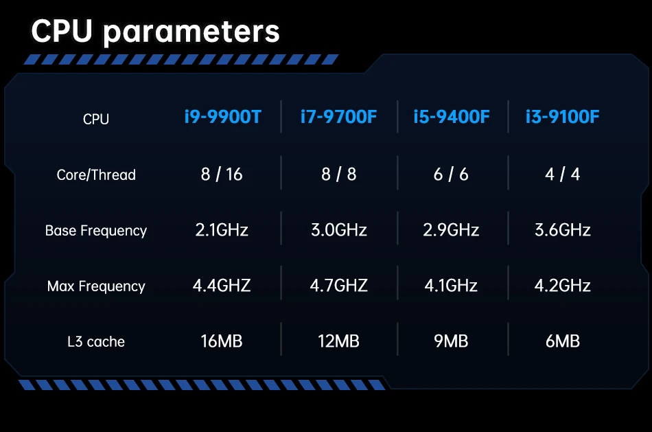 CPU: Intel 9th Gen I5-9400F 、 I7-9700F、I9-9900T