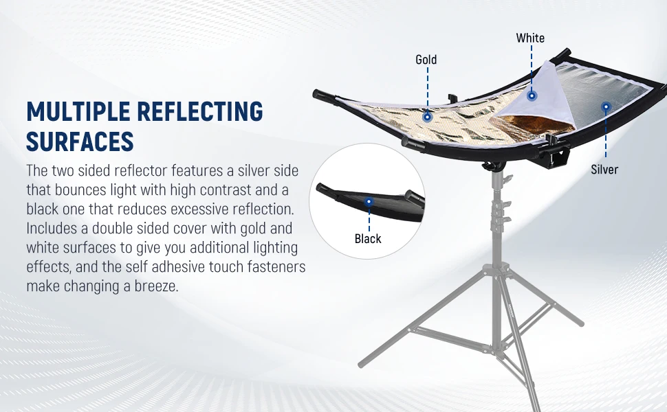 Multiple Light Colors】 The U shaped reflector features two surfaces: A silver one that bounces light with high contrast and a black one that reduces excessive reflection. A double sided cover (gold + white) gives you more light effects, and the self adhesive fasteners make color changing a breeze