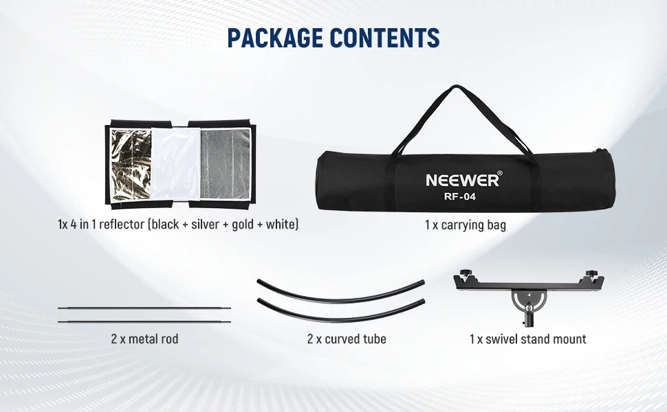 Package Contents】 1 x reflector (black + silver), 2 x curved tube, 2 x metal rod, 1 x swivel stand mount, 1 x double sided cover (gold + white), 1 x carrying bag