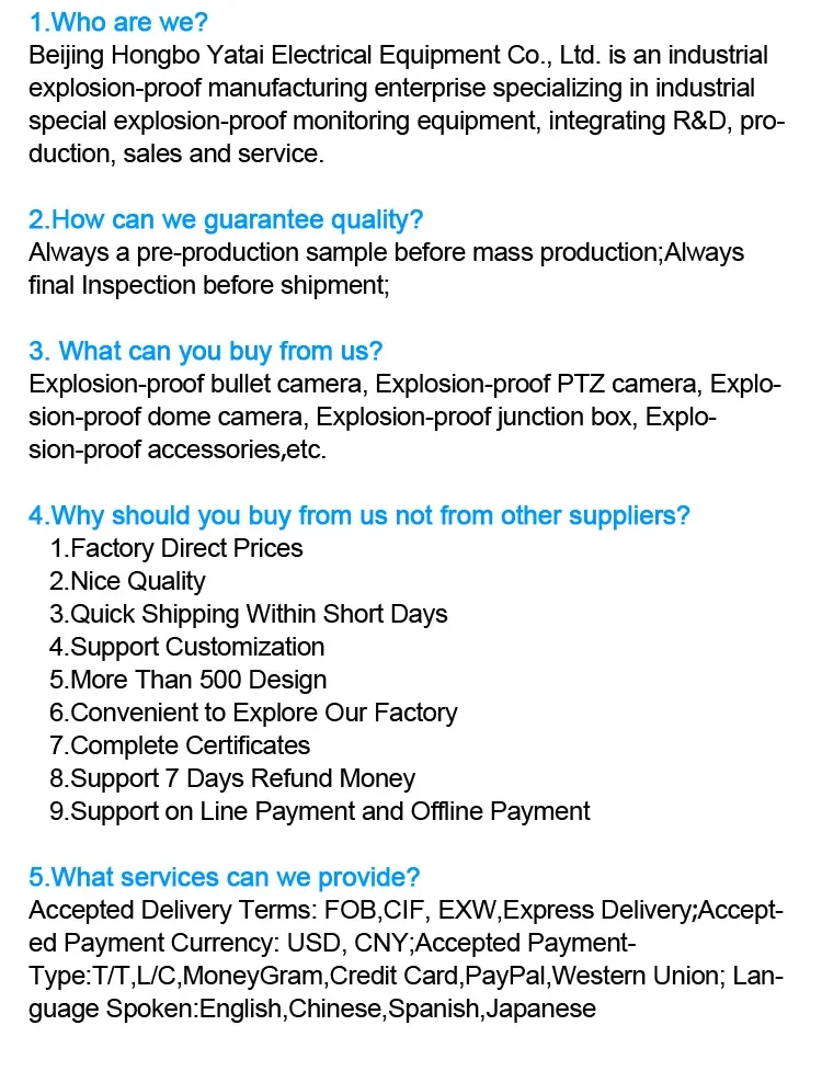 It has IIa, IIb, IIc flammable gas, and the ignition temperature group is zone 1 and zone 2 of the t1-t6 group. The flammable gas or the explosive mixture formed by steam and air is also applicable to the ignition temperature group. It is a place containing a combustible dust mixture in Zones 20, 21, and 22 of the t1-t6 group.Such as: petroleum, chemical, mine, military, medicine, oil depot, ship, drilling platform, gas station, fireworks production, grain processing and storage.
