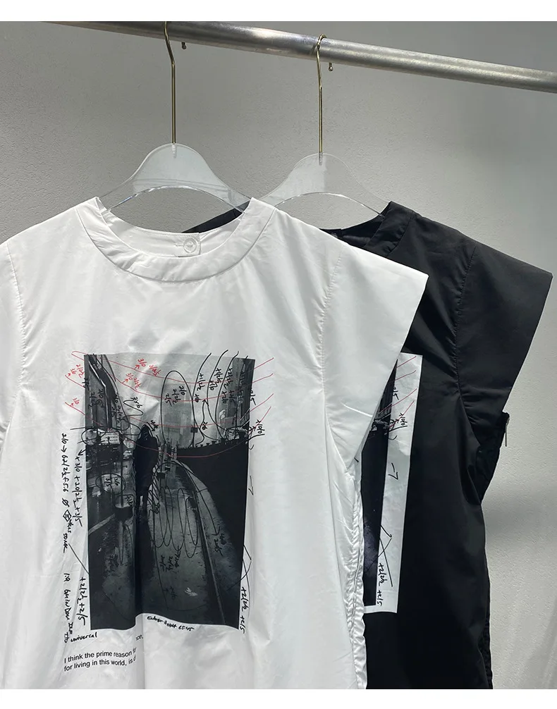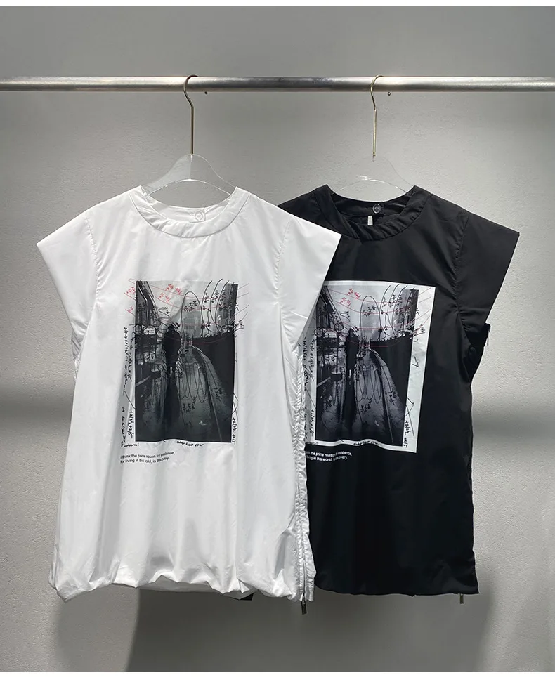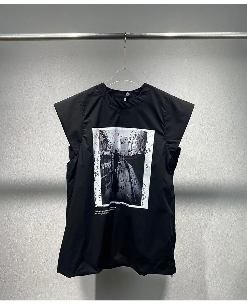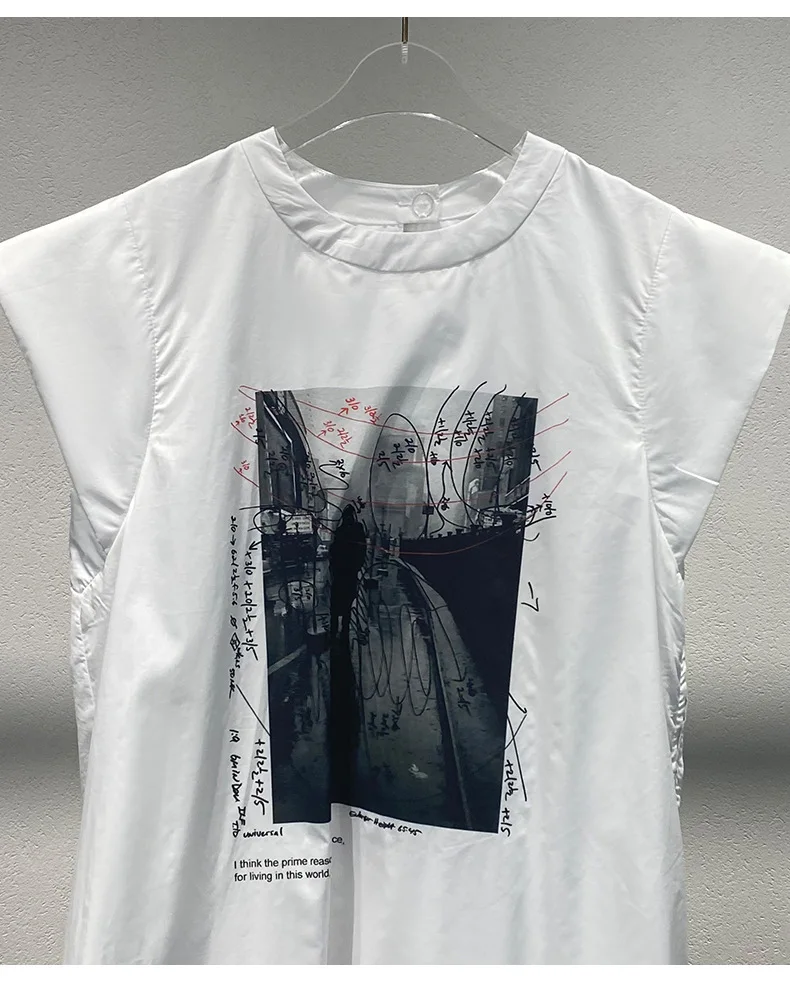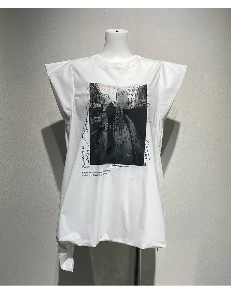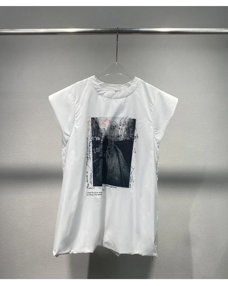 Niche 2025 spring and summer new white printed round neck loose sleeveless T-shirt woman y2k clothes