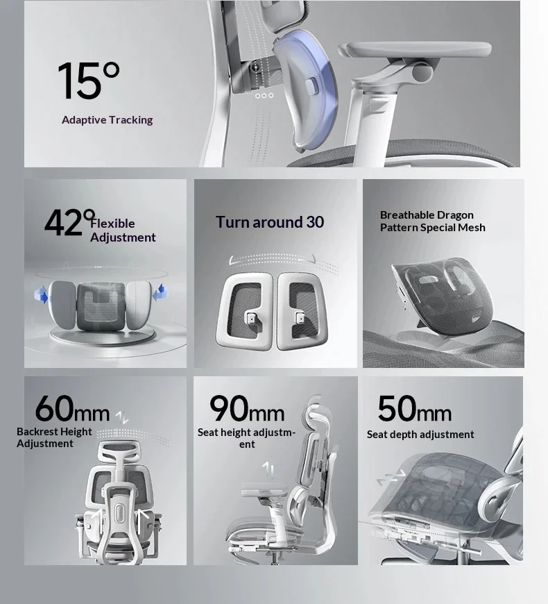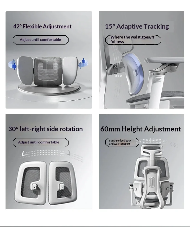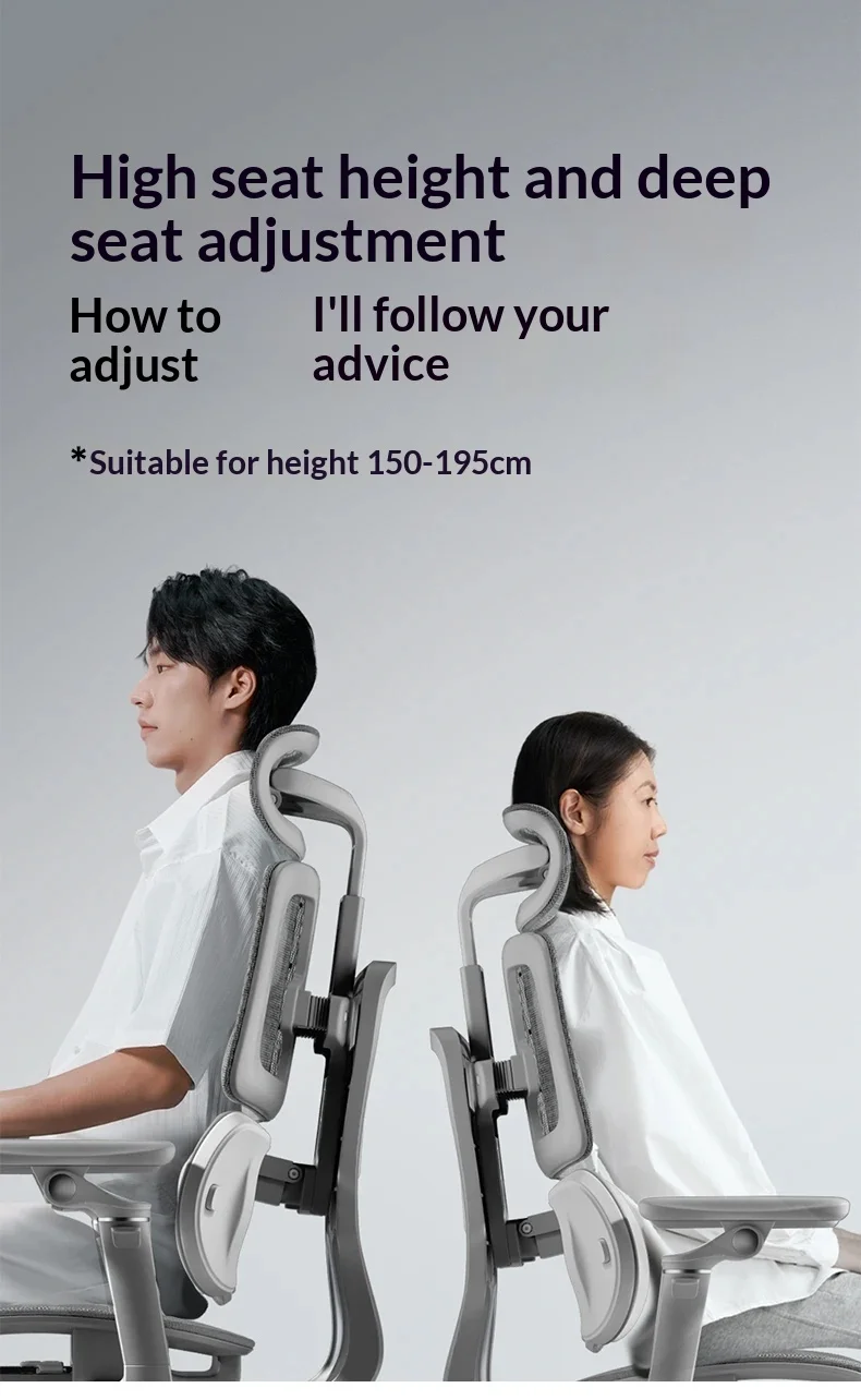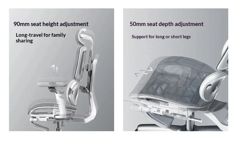 3、The sitting height can be raised and lowered by 47-56cm, the back of the chair can be raised and lowered by 60mm, and the sitting depth can be adjusted by 50mm.