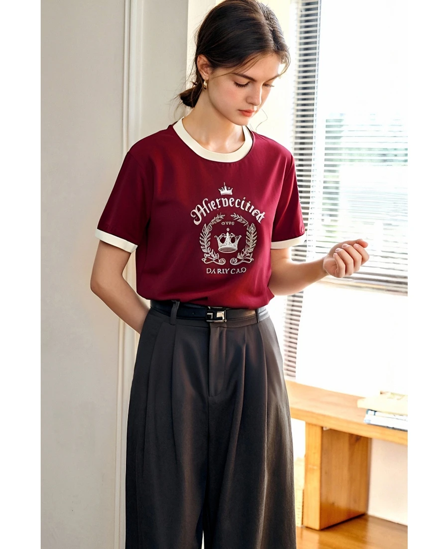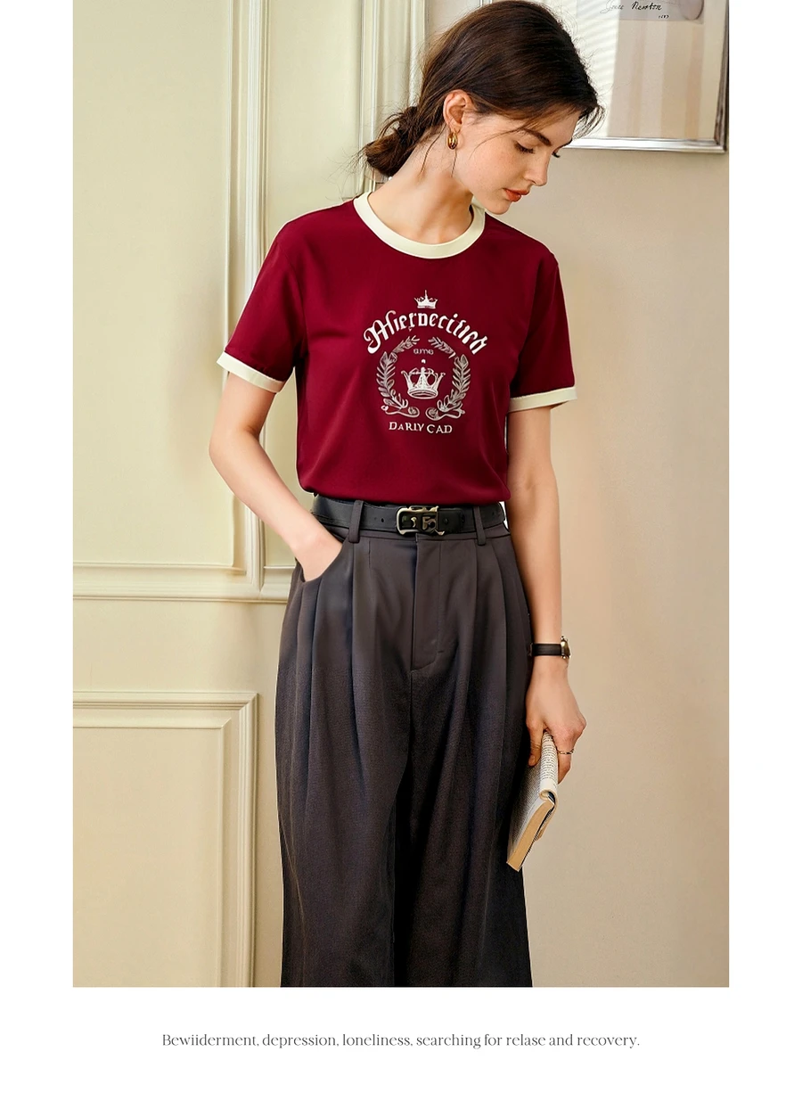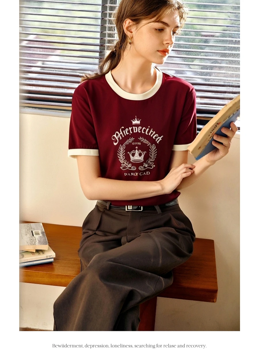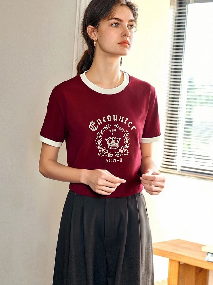 OLrain Women’s Short Sleeve Graphic T-Shirt Summer Tees 2025 American Retro Contrast Crew Neck Red Top Woman Clothing O57XT98985