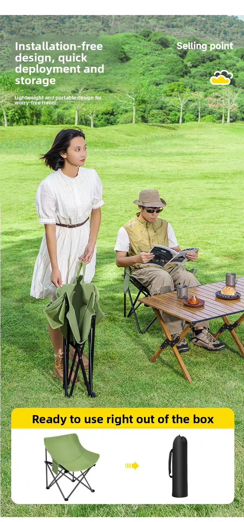 The set includes a comfortable folding chair and a stylish moon chair, providing different seating options for various needs.